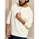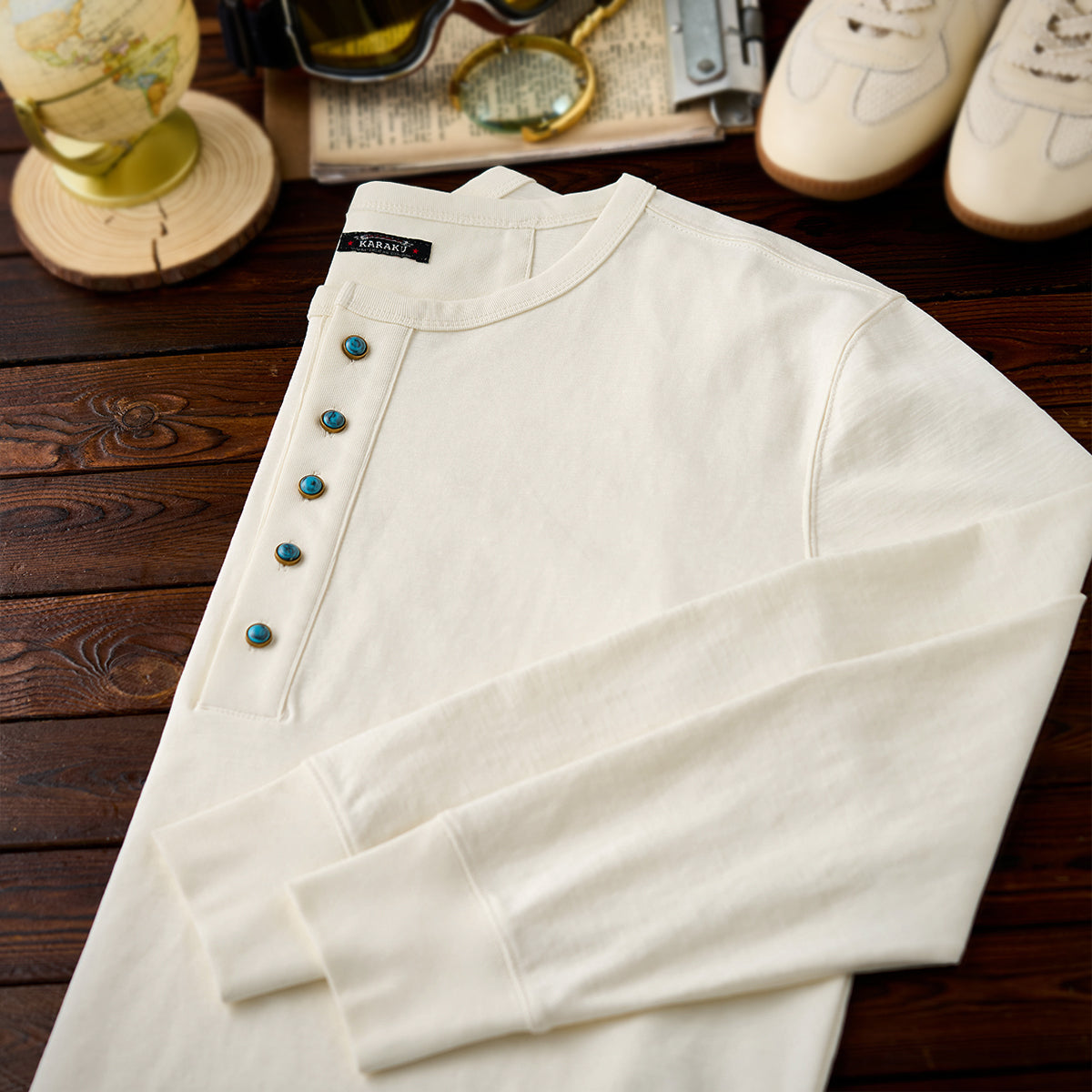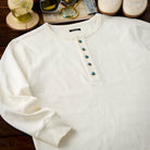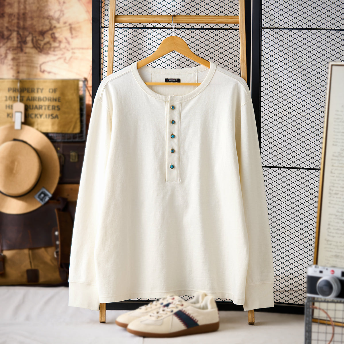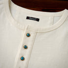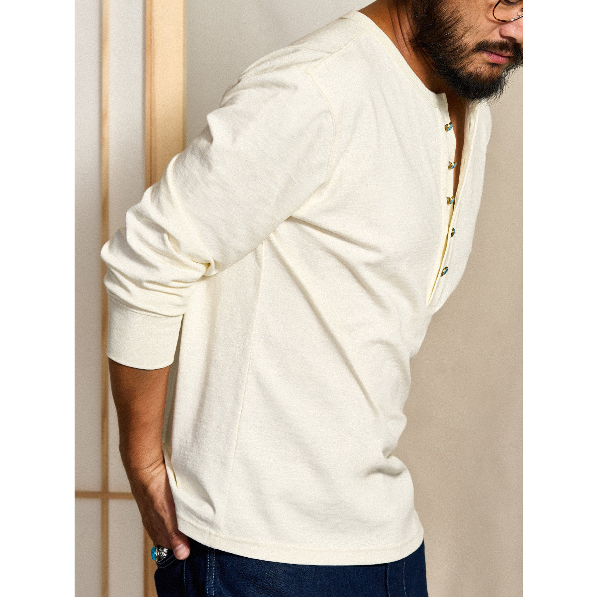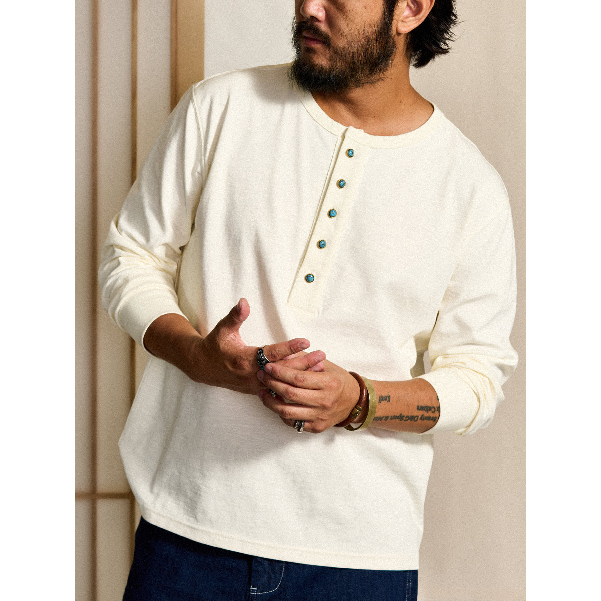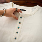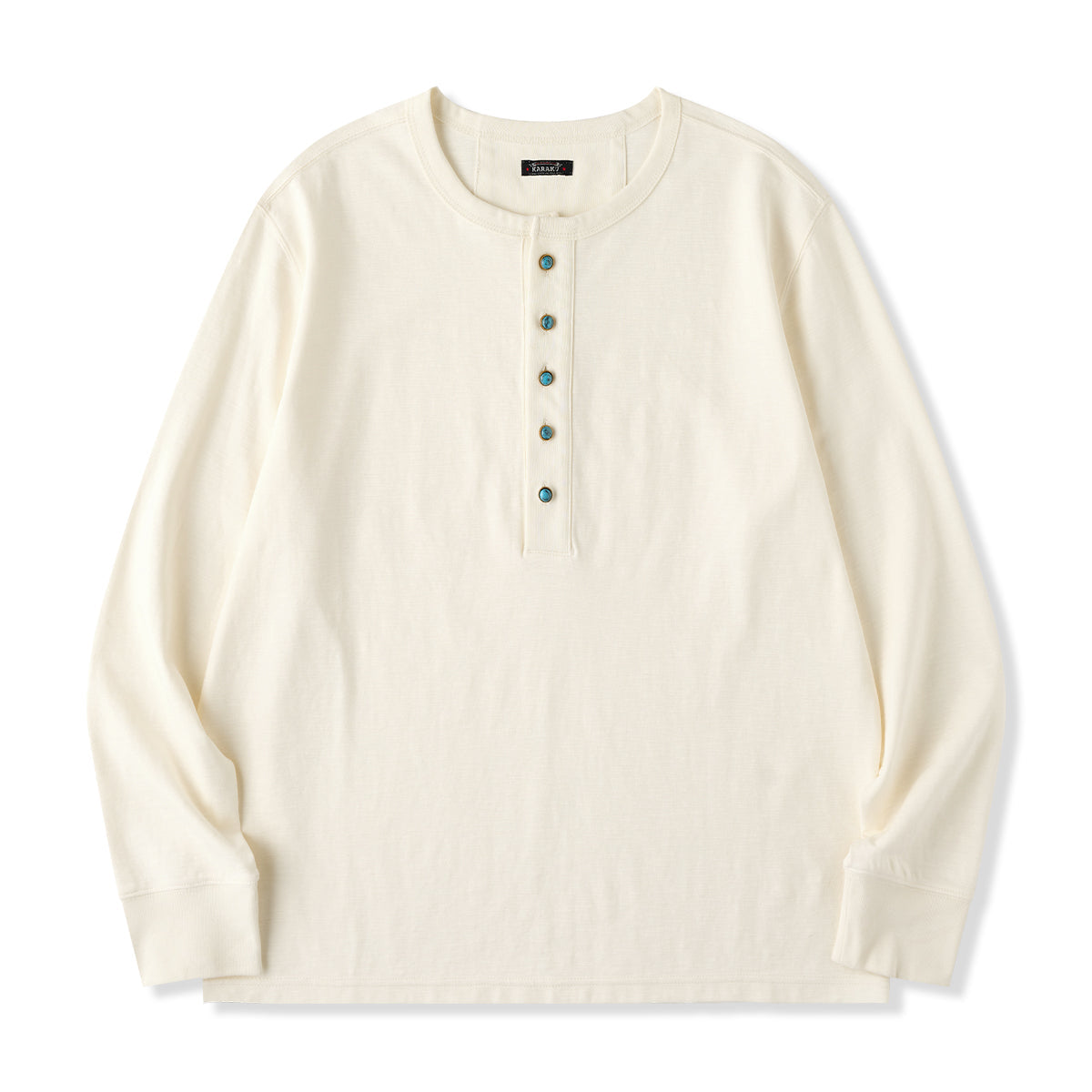 헨리넥과 터키석 단추가 돋보이는 세련된 긴팔 티셔츠로, 단독 착용은 물론 이너로도 활용하기 좋은 캐주얼 아이템입니다.