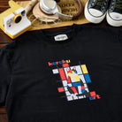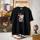 몬드리안의 추상화를 오마주한 컬러풀한 체크 패턴에 고양이 캐릭터를 더한 프린트 티셔츠. 예술과 고양이를 사랑하는 이들을 위한 특별한 아이템입니다.