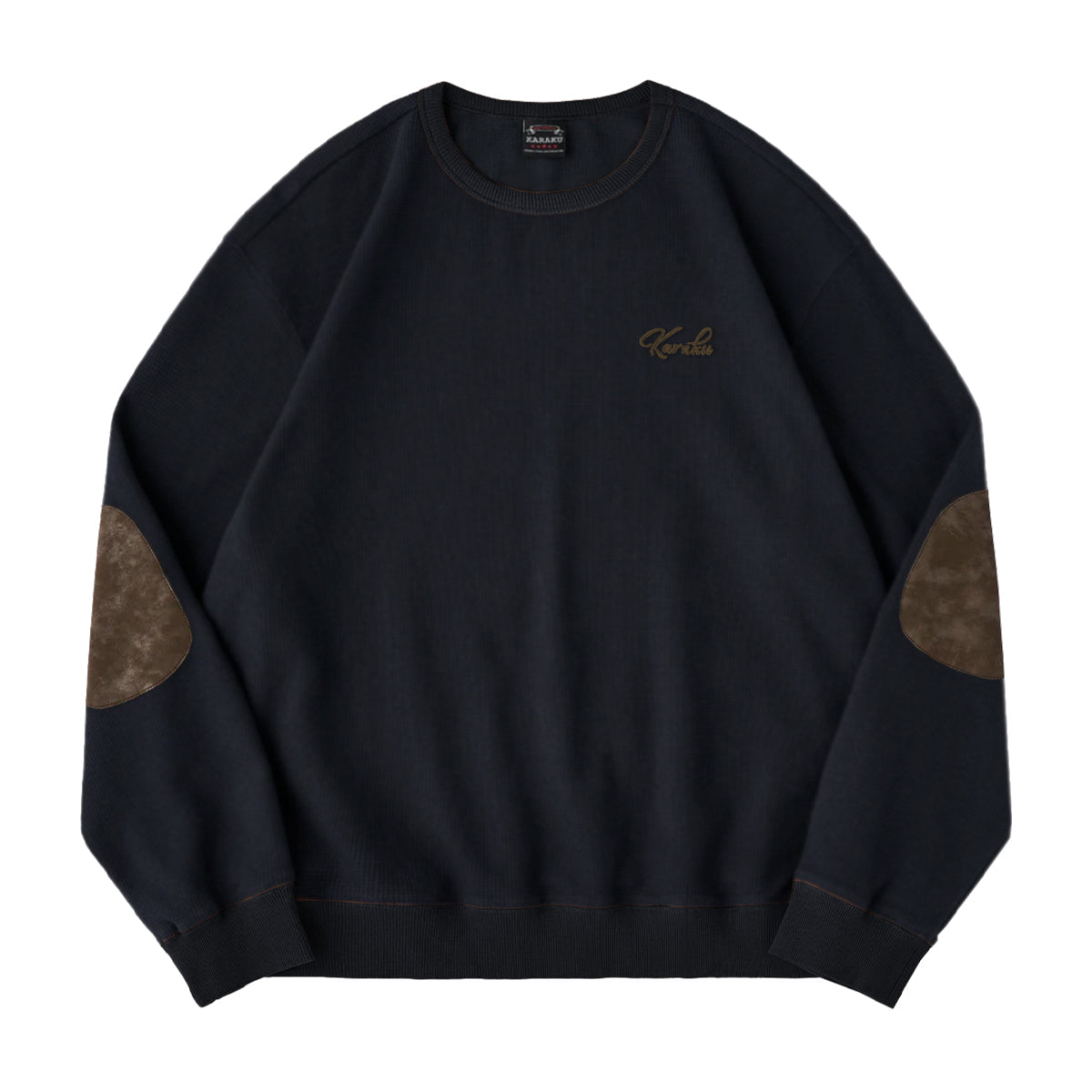 팔꿈치 스웨이드 패치 'KaraKu' 자수 후리스 와플 풀오버 스웨트셔츠