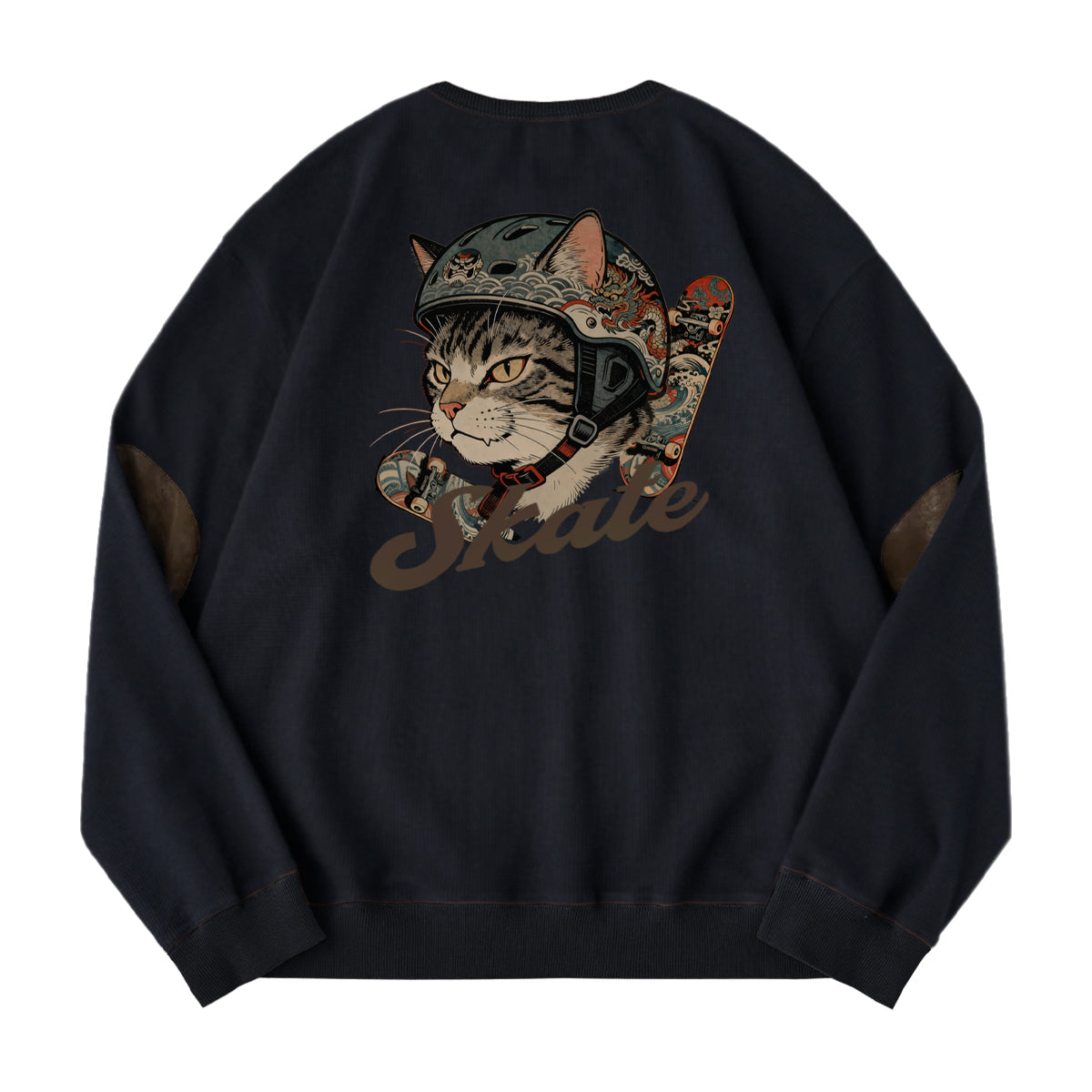 【사전예약】엘보우 스웨이드 패치「헬멧 쓴 스케이트보드 고양이」프린트 스웨트셔츠