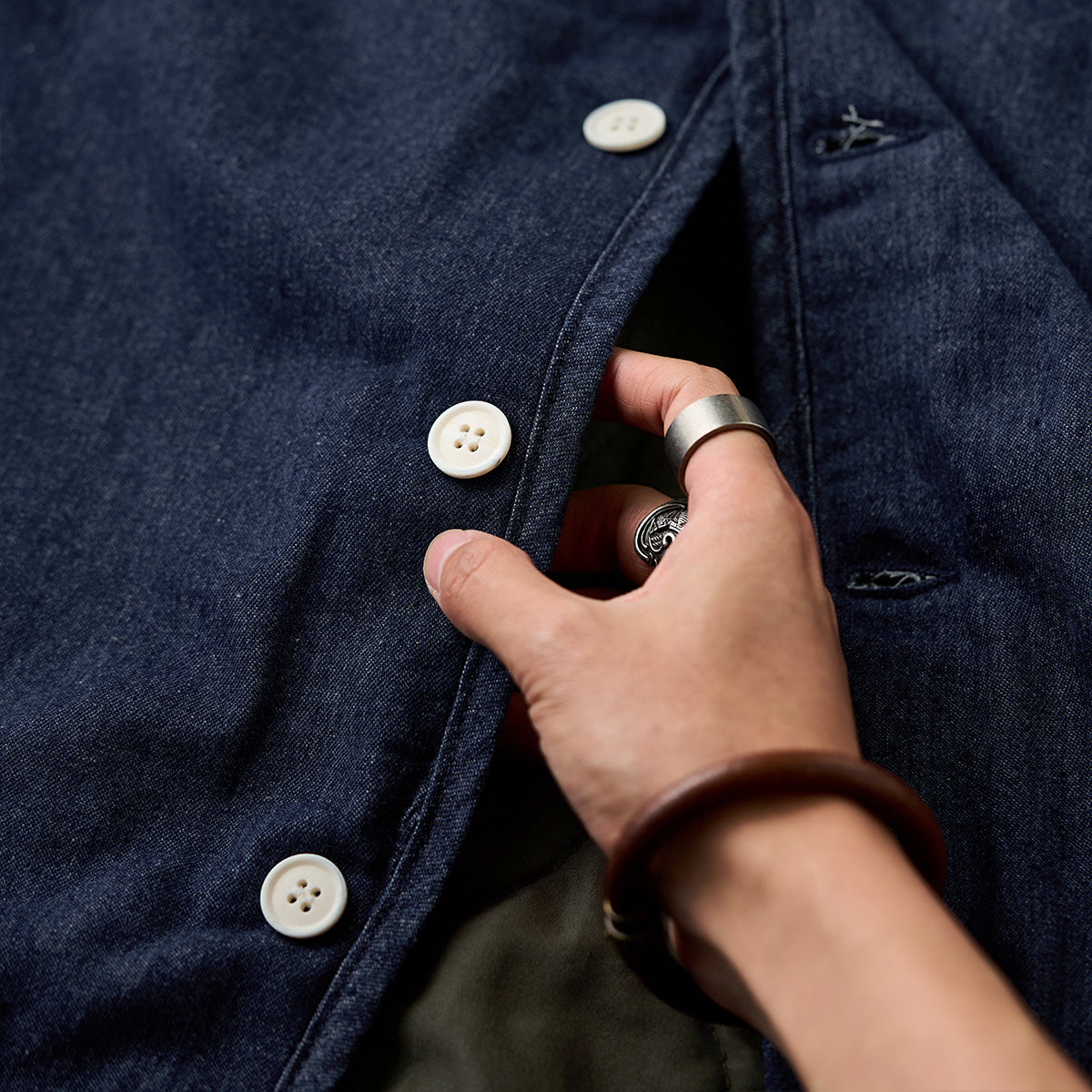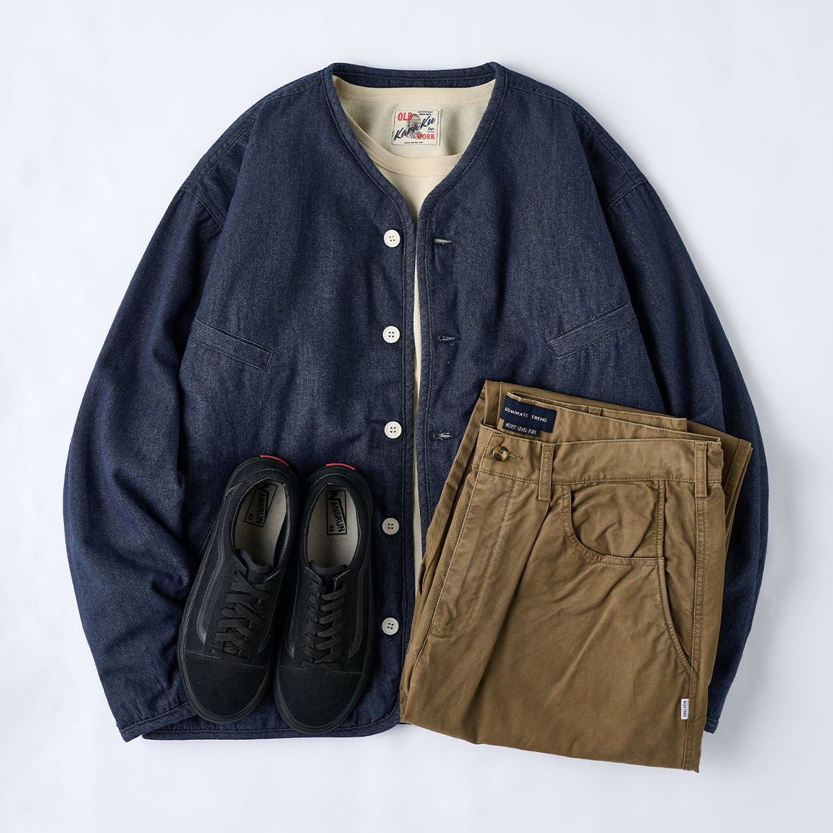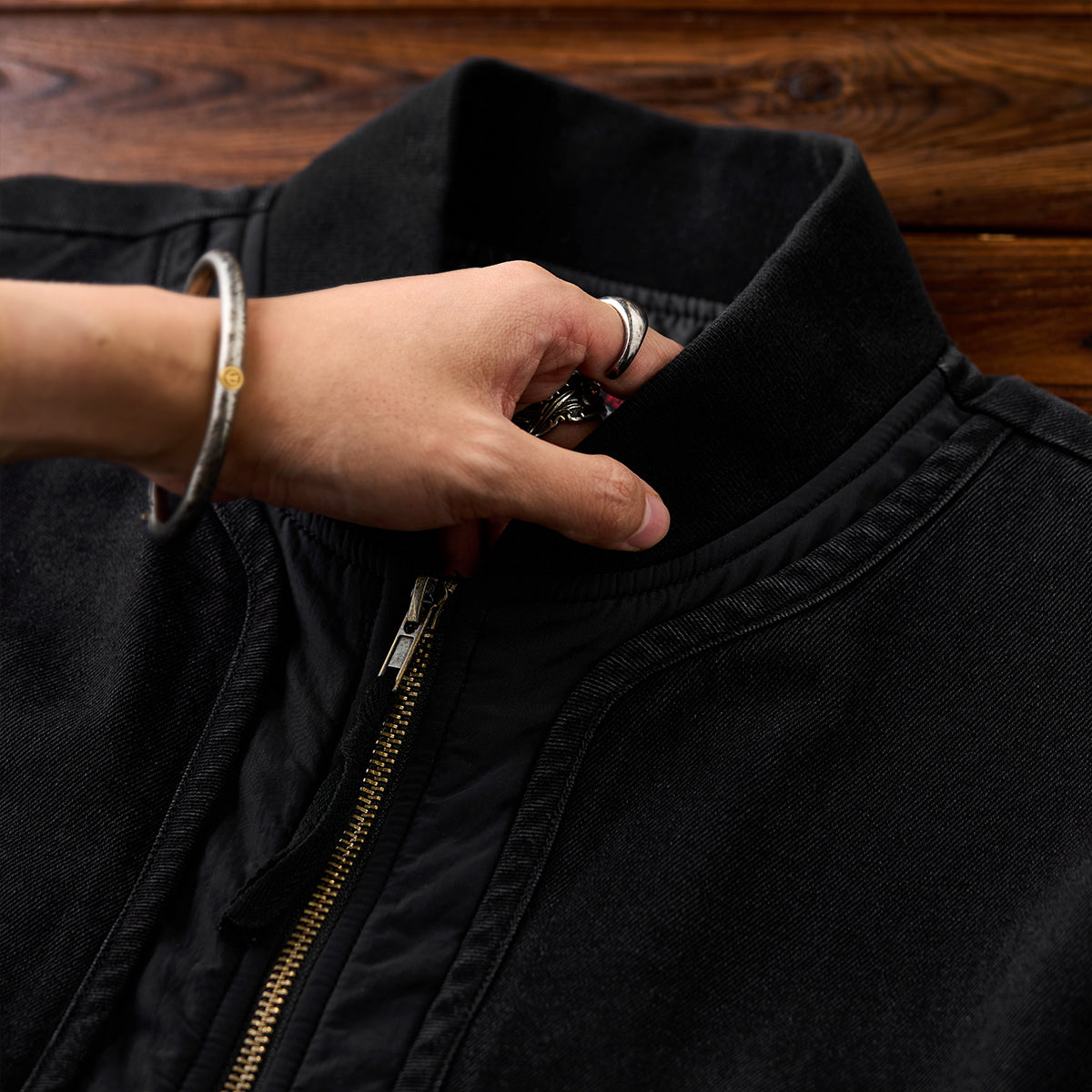 【사전예약】배색 소재 베이스볼 칼라 진흙 염색 데님 자켓