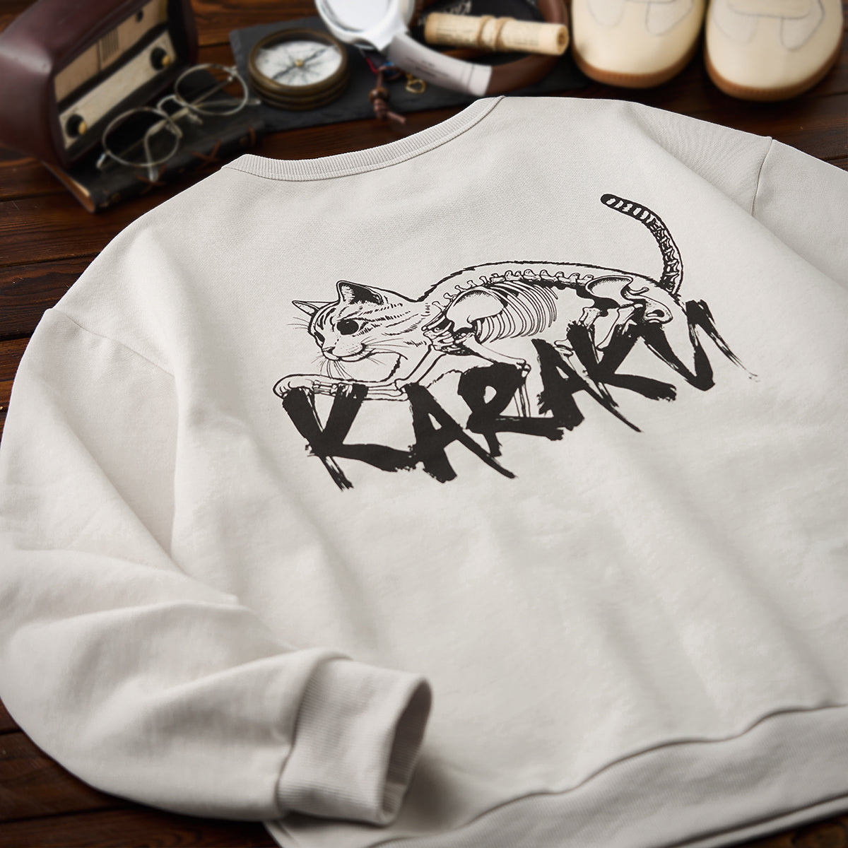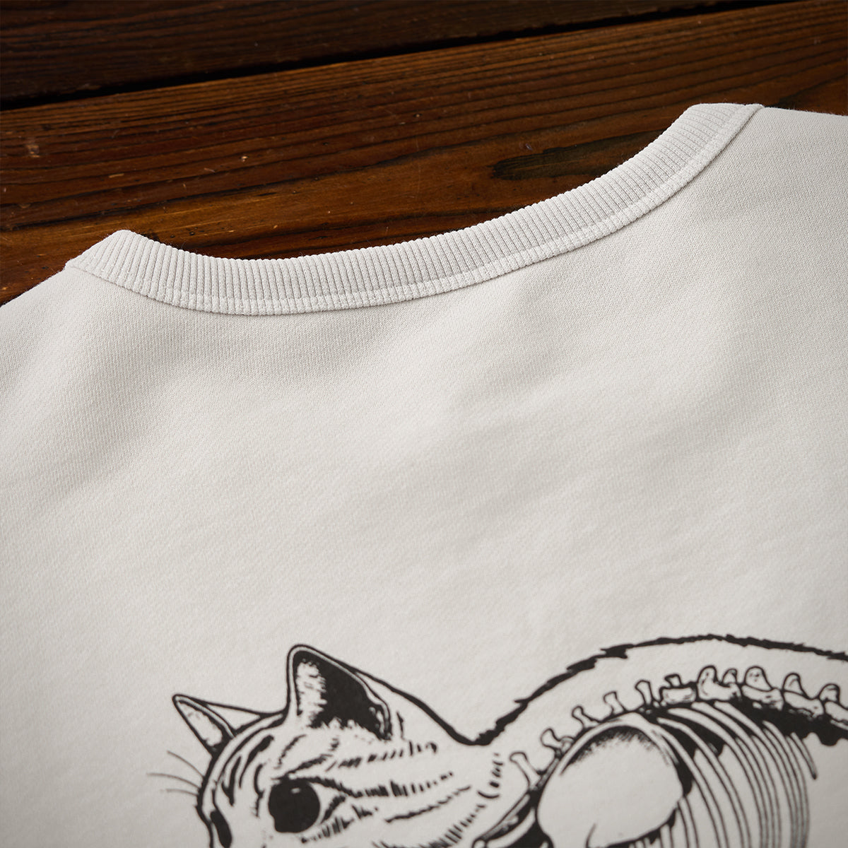 【사전예약】「뼈대가 비쳐 보이는 고양이」프린트 안면 파일 코튼 V 거셋 스웨트셔츠