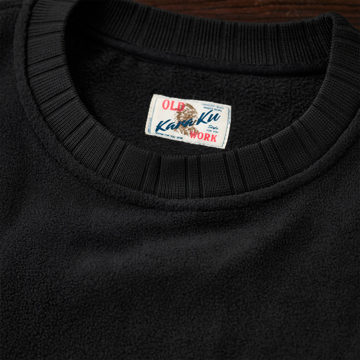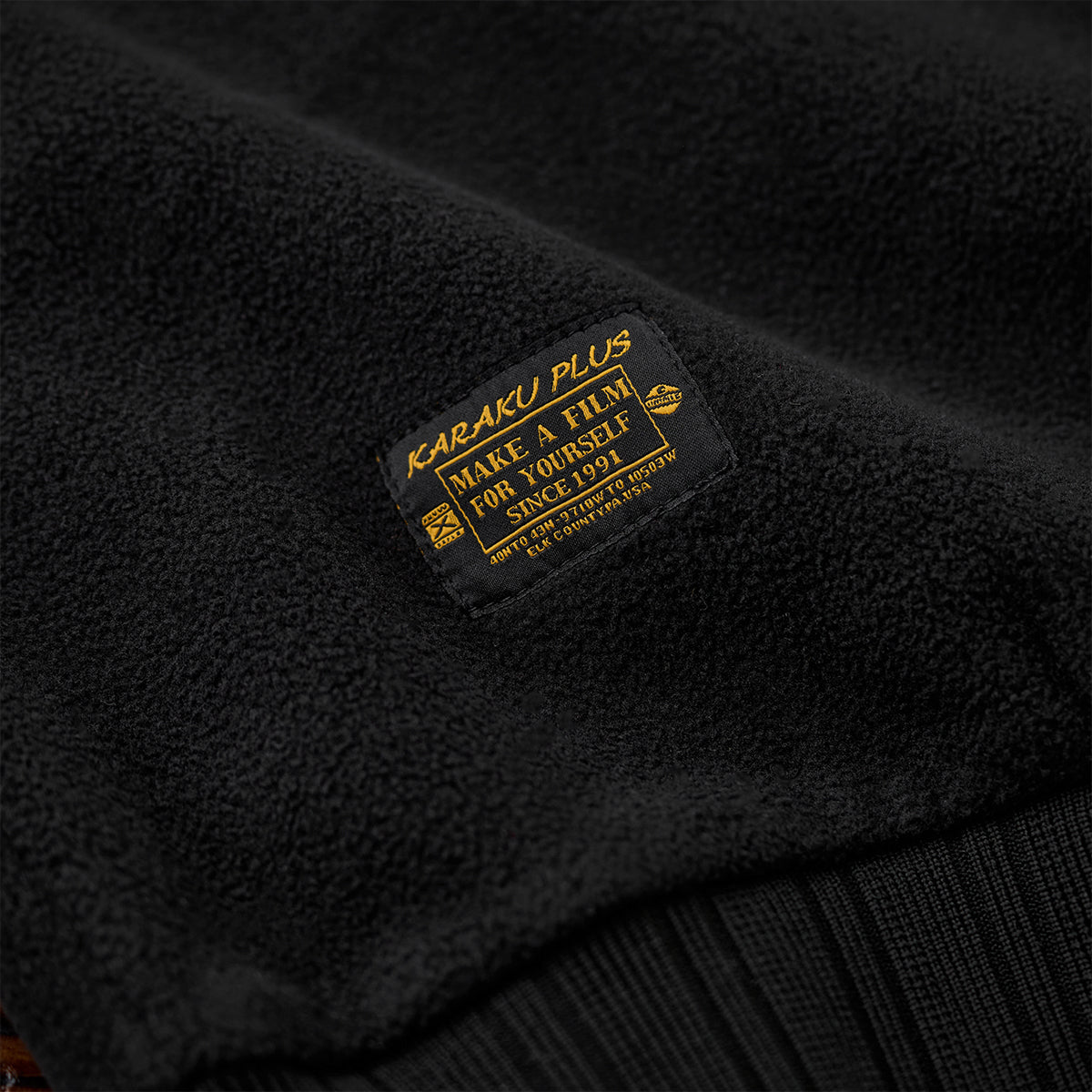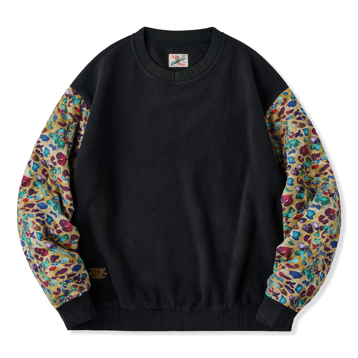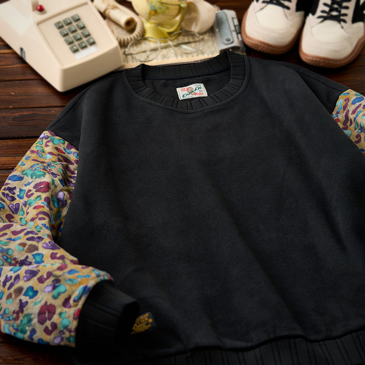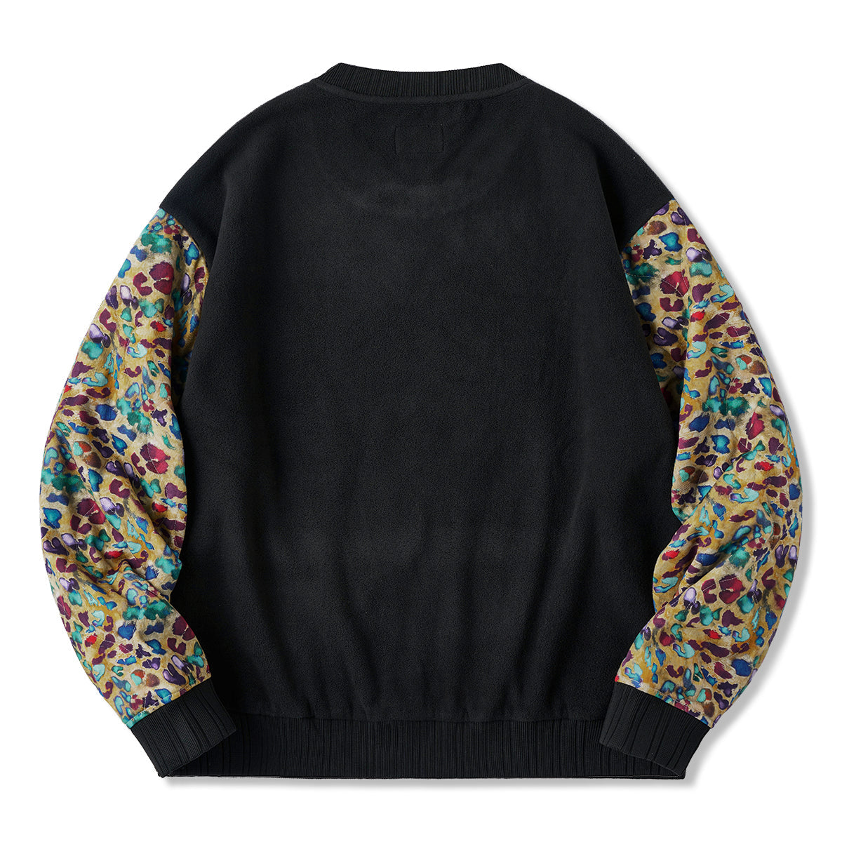 【사전예약】Karaku×川又聡「夢豹」호피 프린트 퀼팅 소매 배색 플리스 풀오버 스웨트셔츠