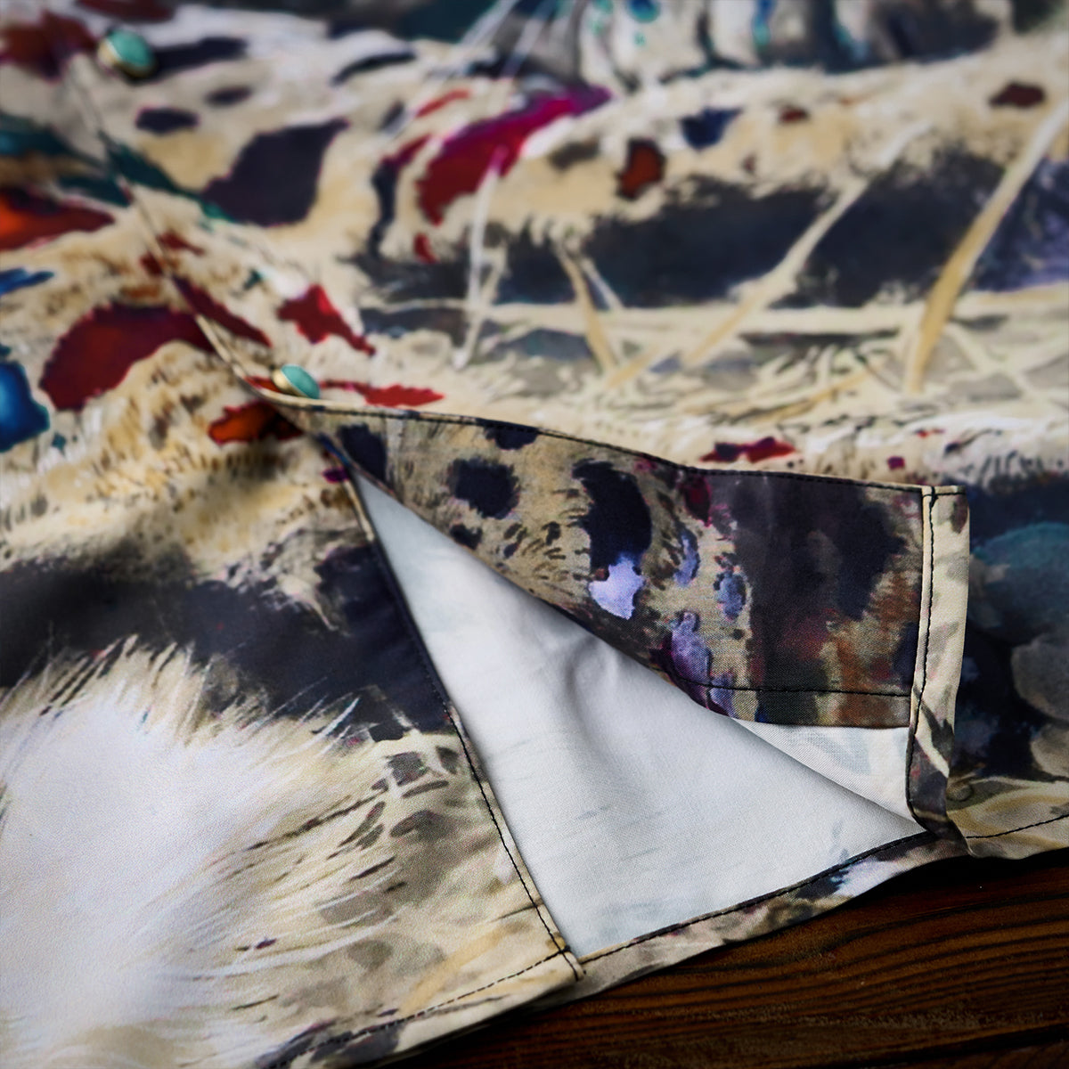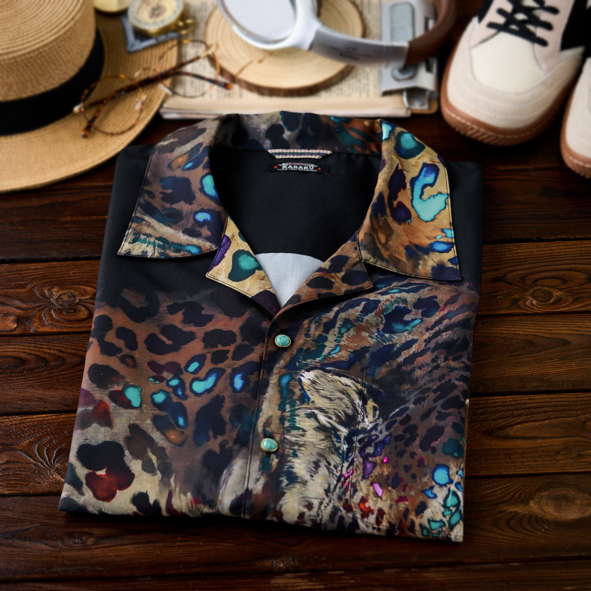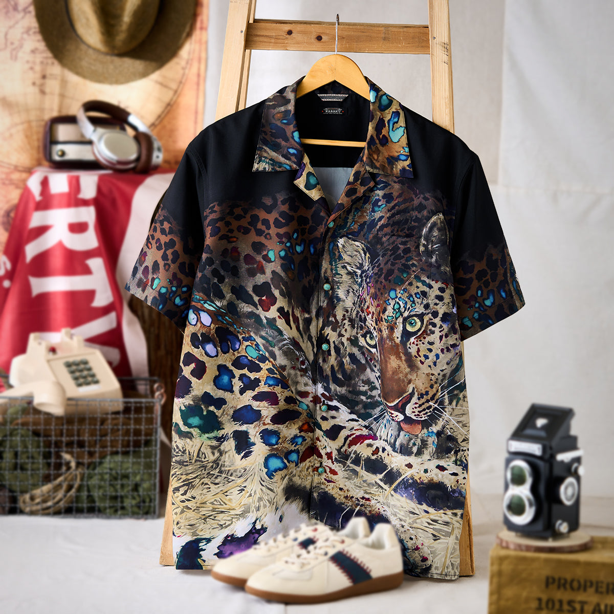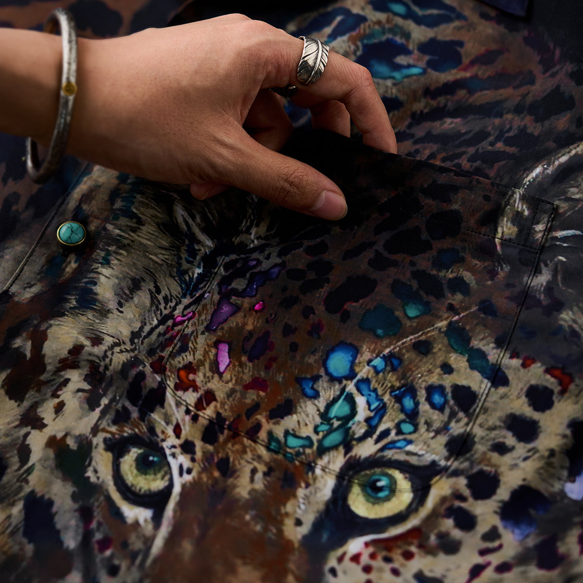 일본 화가 가와마타 사토시(川又聡)의 『몽표(夢豹)』를 모티브로 한 Karaku 콜라보 셔츠. 터키석 느낌의 단추가 고급스러움을 더하고, 고요함과 야성이 조화를 이루는 독창적인 디자인이 돋보입니다.