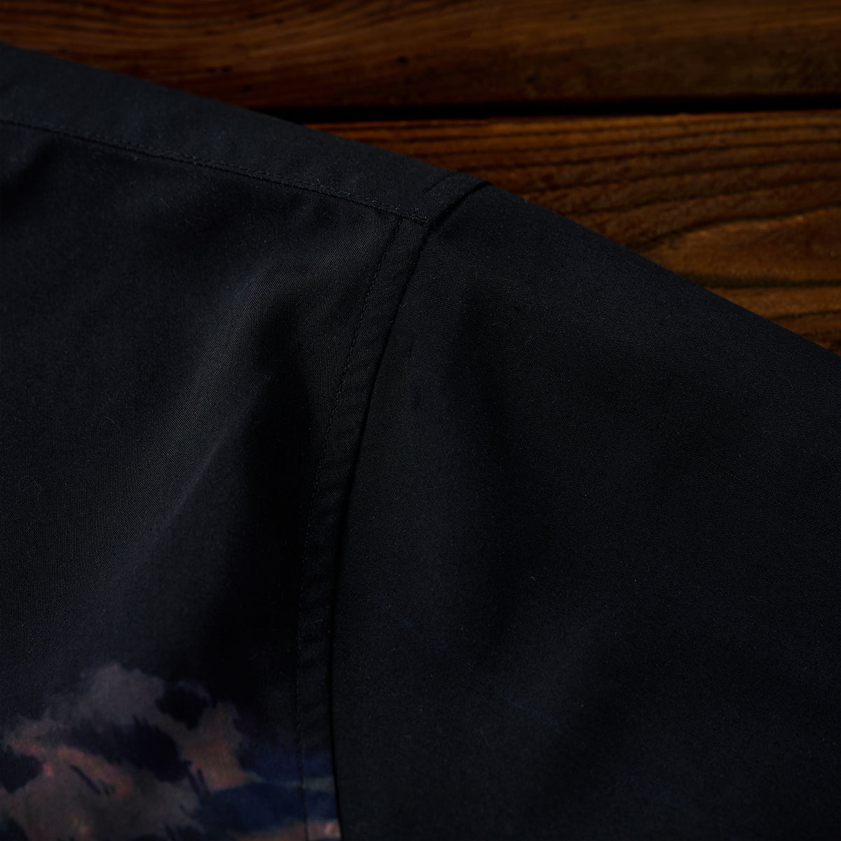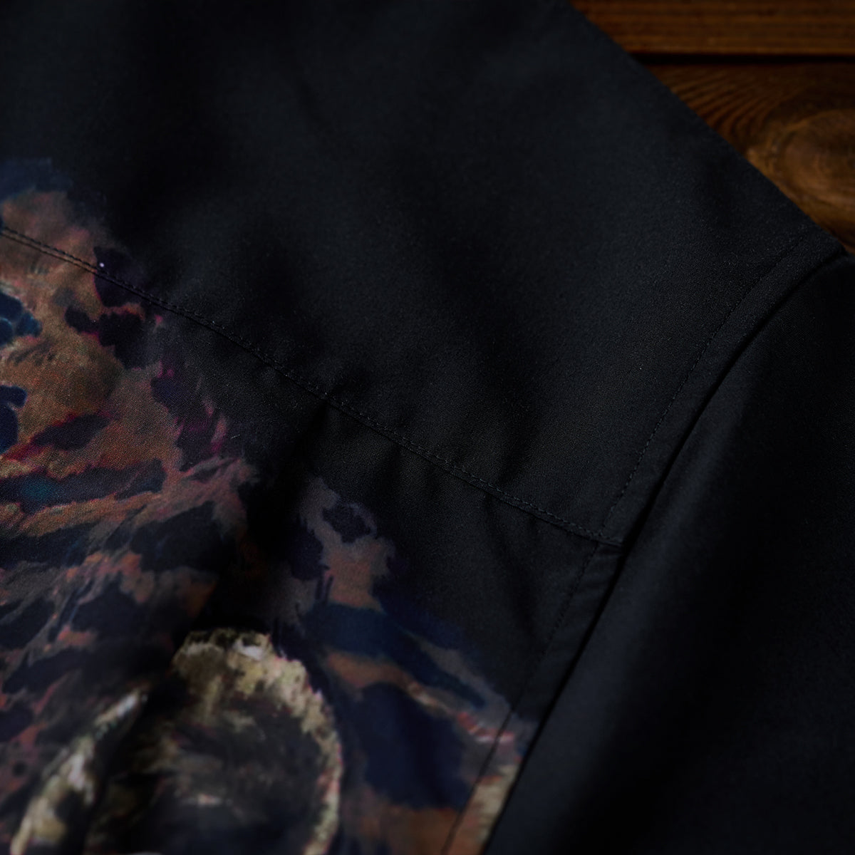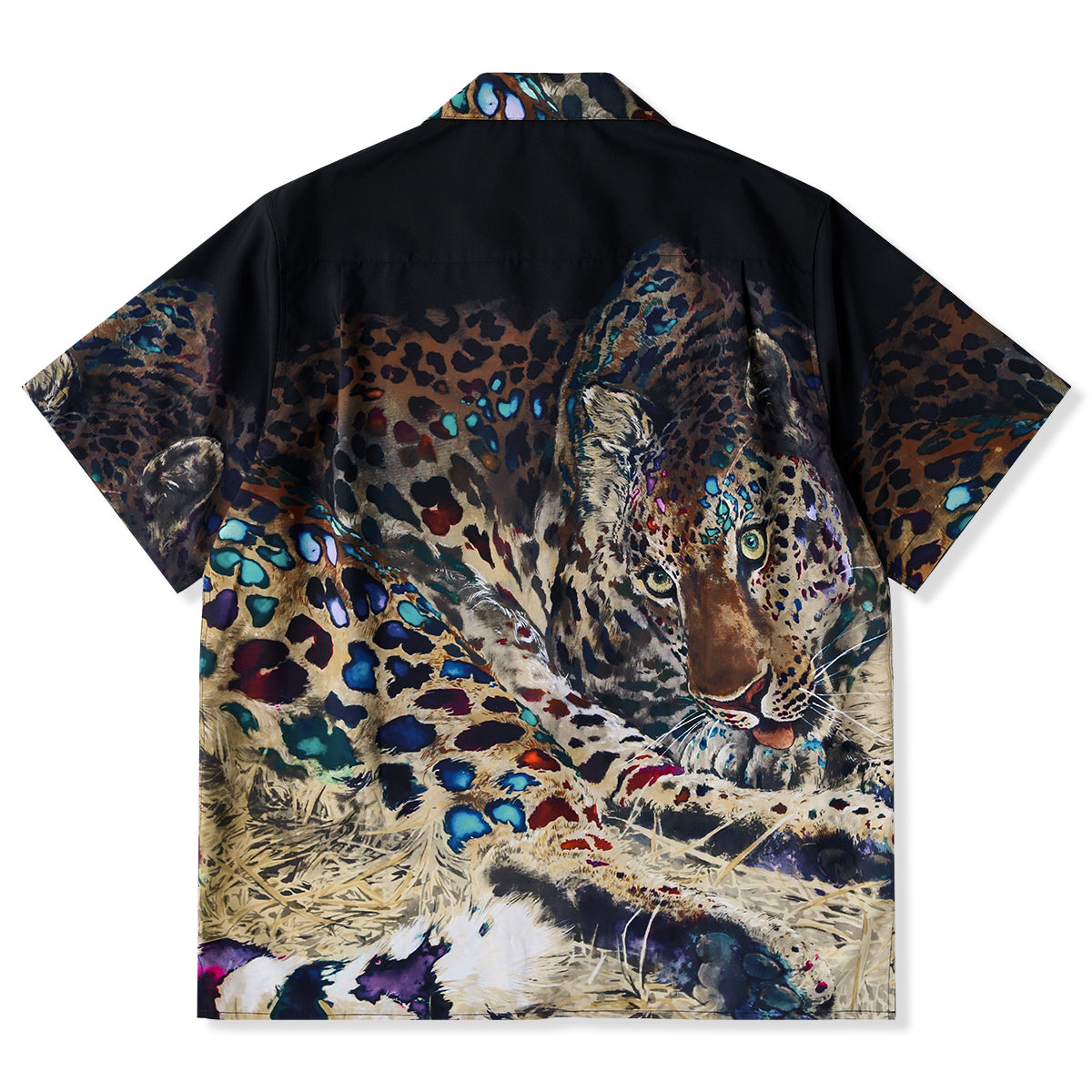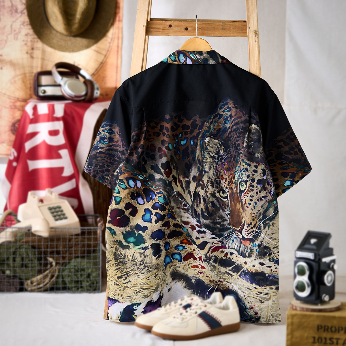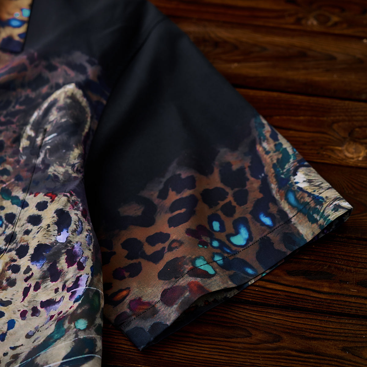 일본 화가 가와마타 사토시(川又聡)의 『몽표(夢豹)』를 모티브로 한 Karaku 콜라보 셔츠. 터키석 느낌의 단추가 고급스러움을 더하고, 고요함과 야성이 조화를 이루는 독창적인 디자인이 돋보입니다.