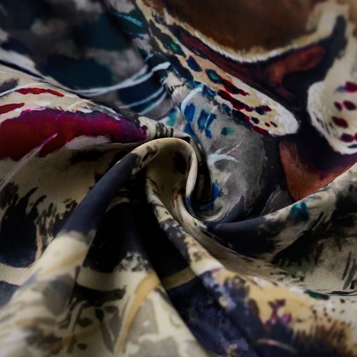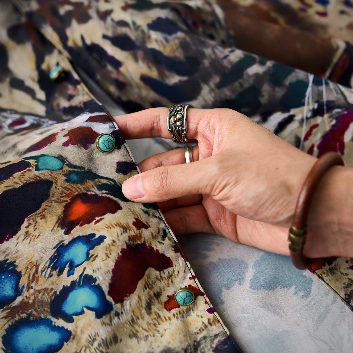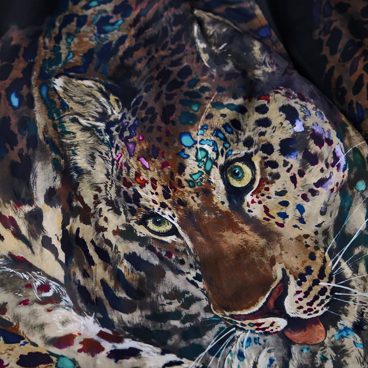 조용히 털을 다듬는 표범의 반점 무늬를 대담한 프린트로 표현하고, 앞여밈의 그린 터키석 단추로 색감의 조화를 더해 꿈속 같은 몽환적인 분위기를 완성합니다.