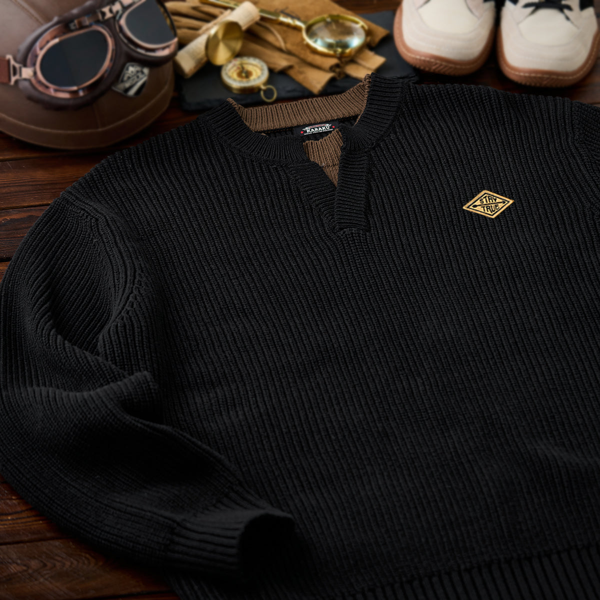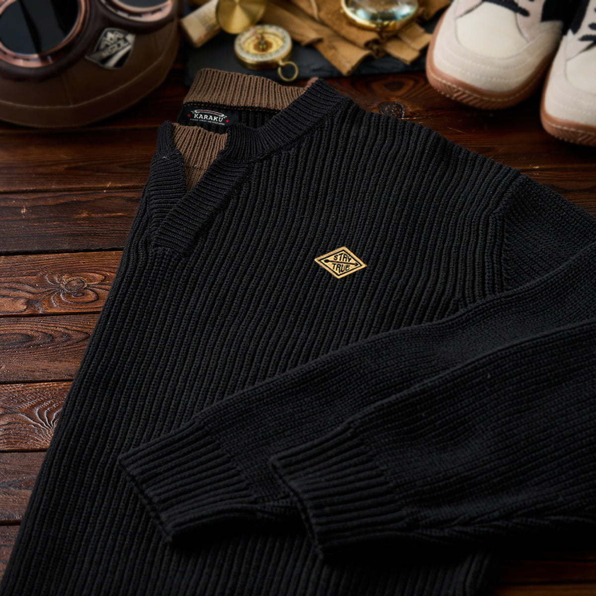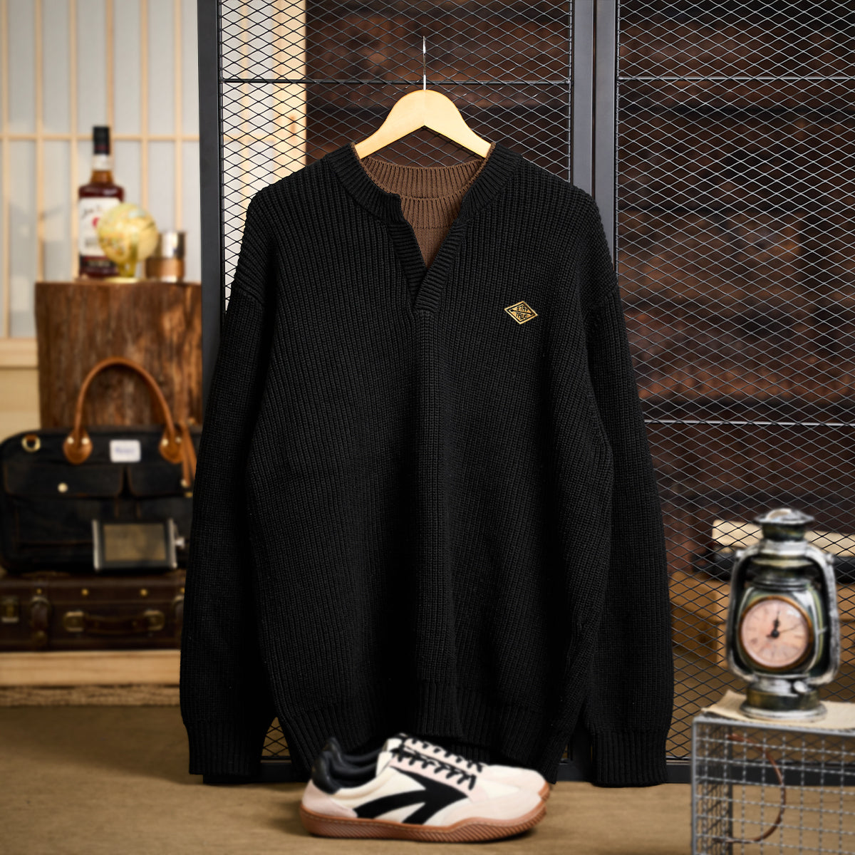 【사전예약】「STAY TRUE」자수 와펜 페이크 레이어드 배색 니트 스웨터