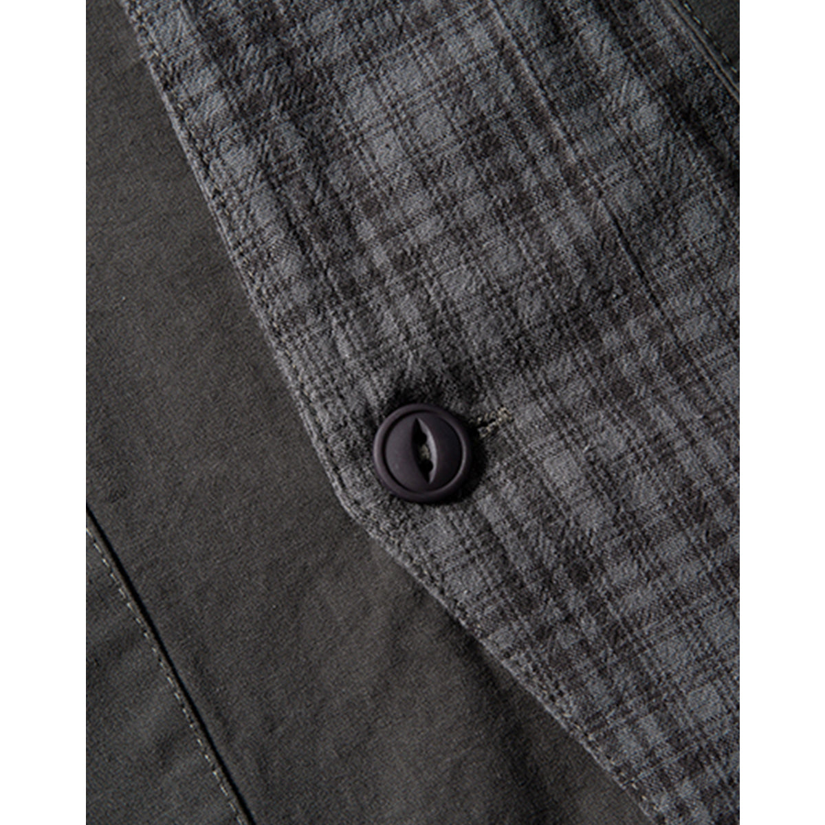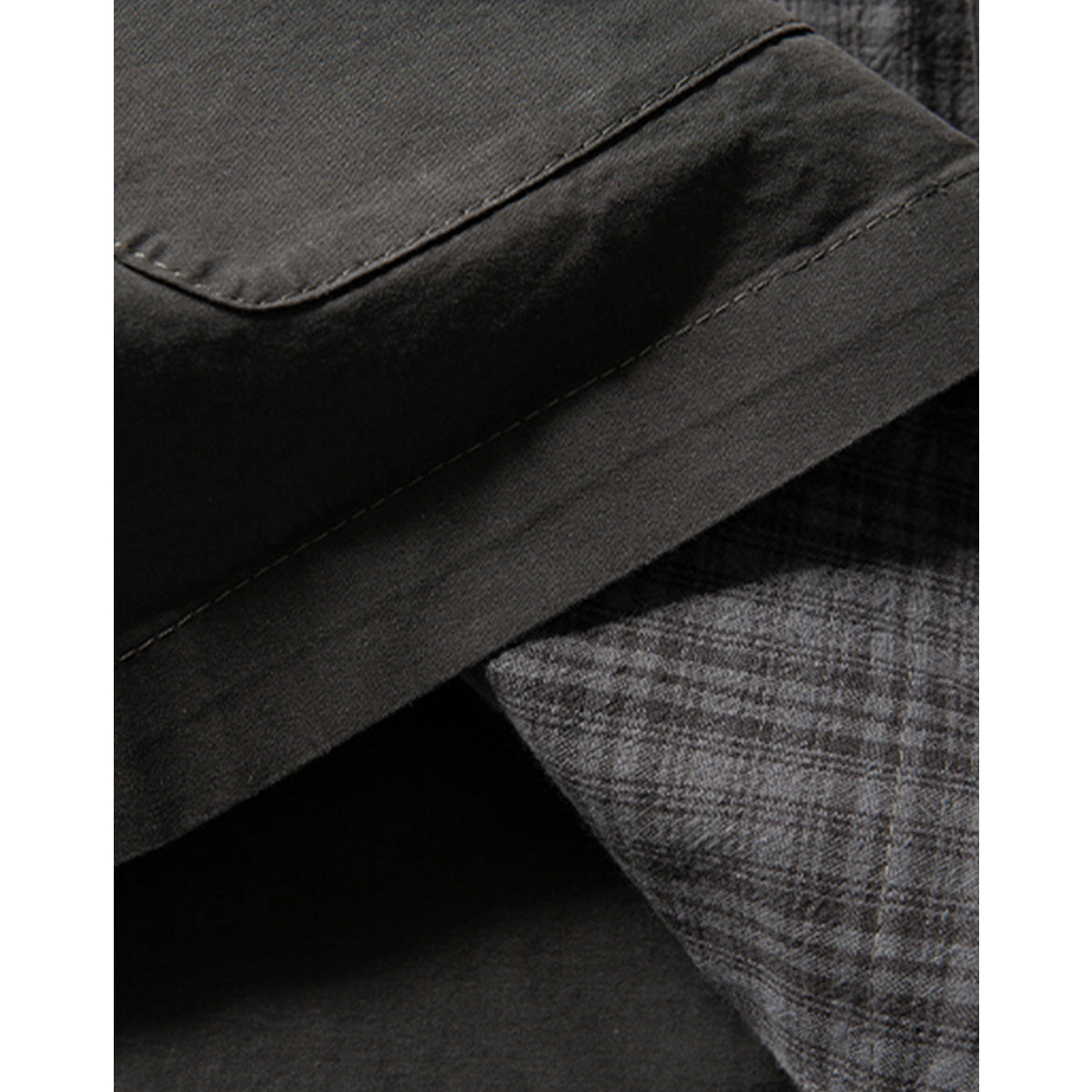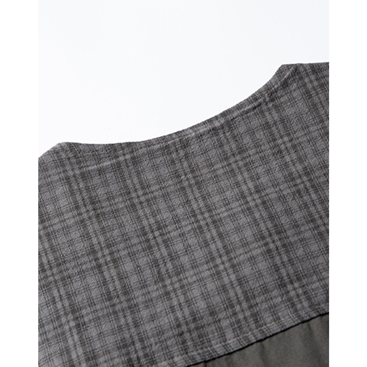 체크 무늬 디테일이 프런트와 등 부분에 배치된 페이크 레이어드 셔츠로, 자연스럽게 시선을 끄는 독특한 디자인입니다.