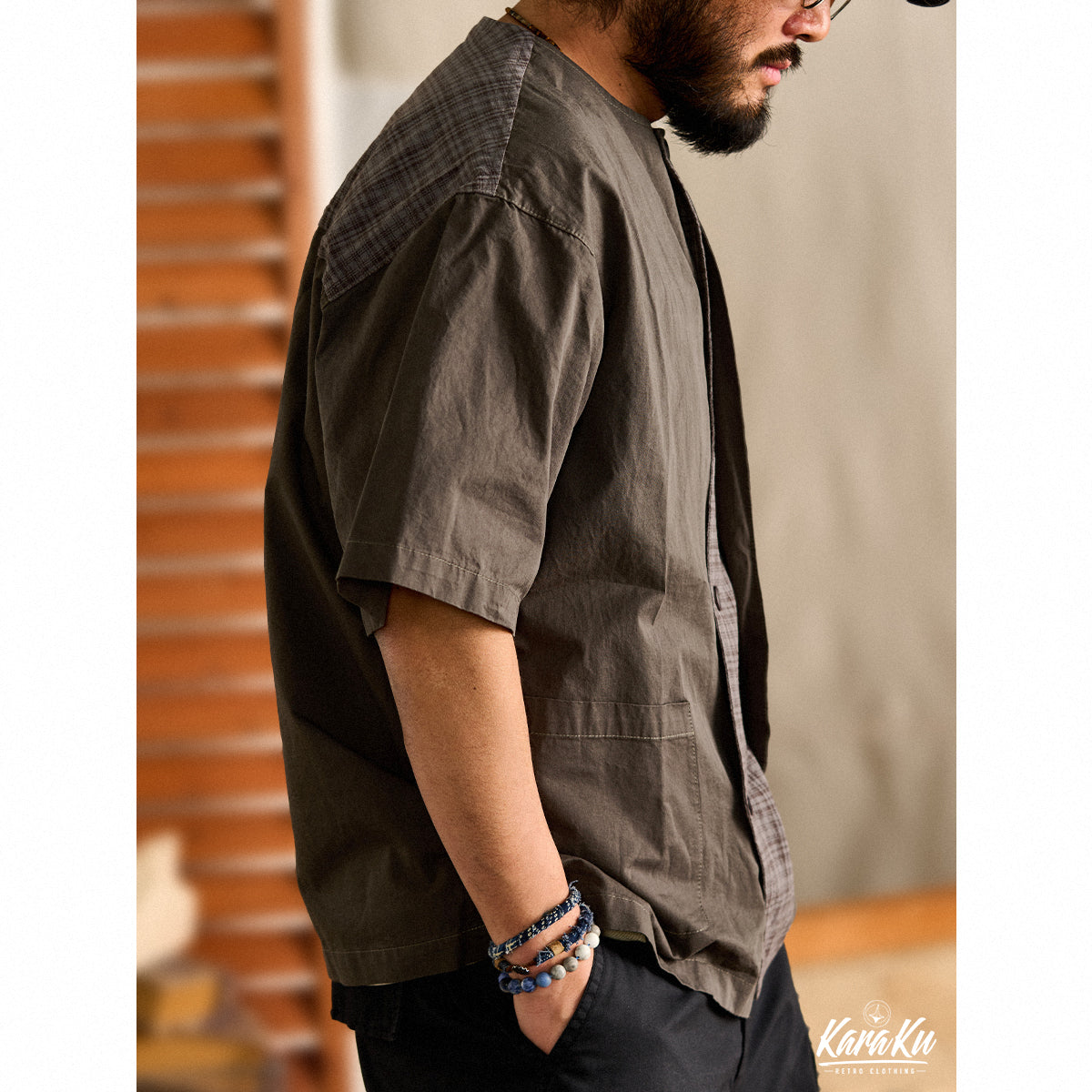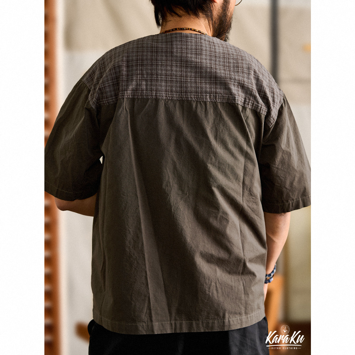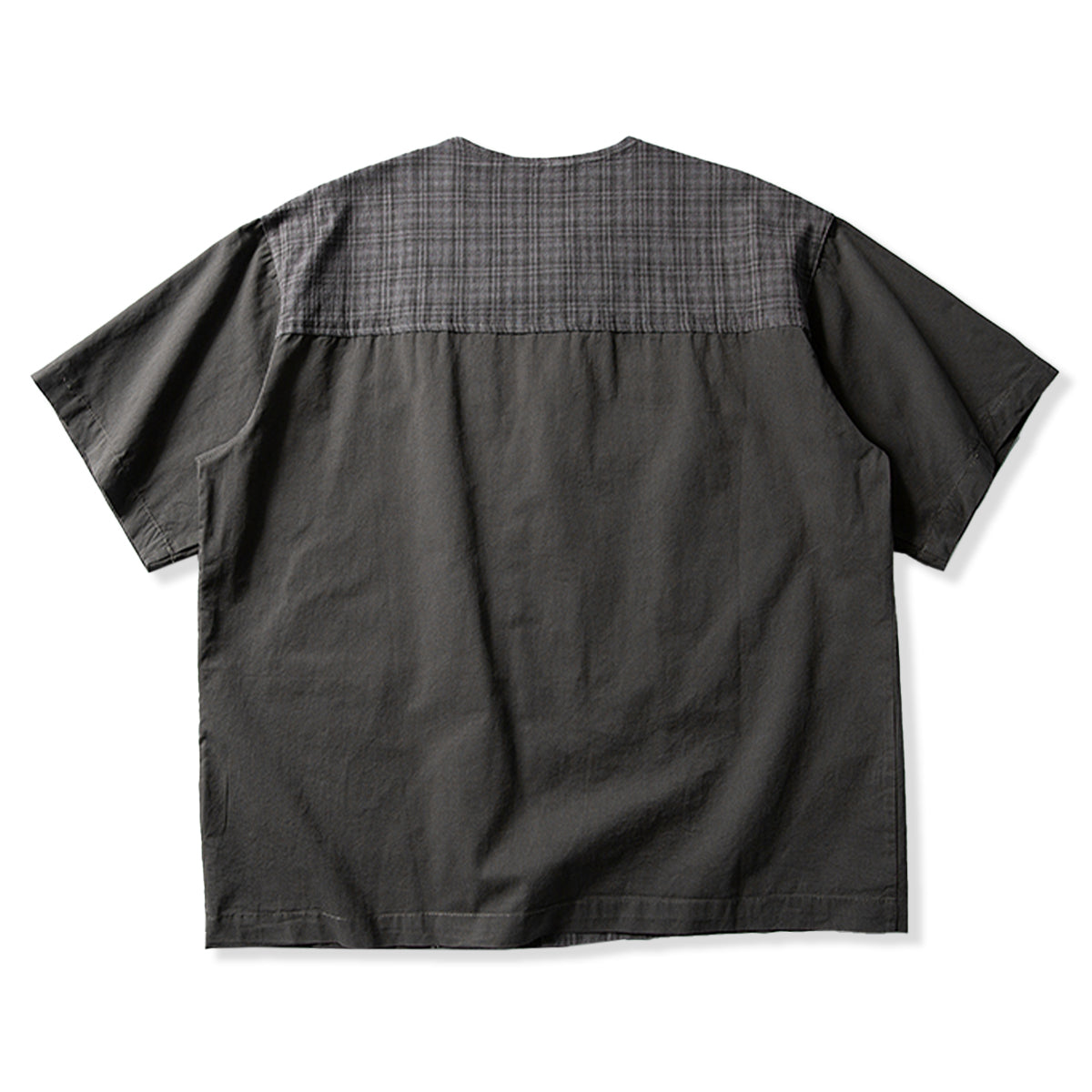 페이크 레이어드 패치워크 체크 무늬 전환 코튼 반팔 셔츠