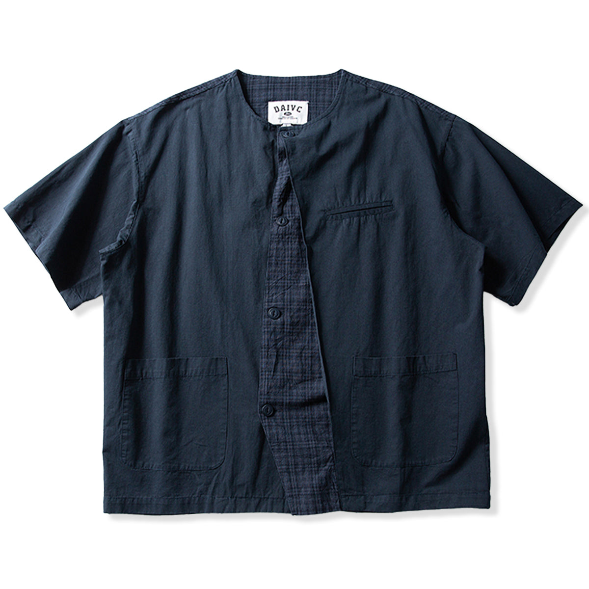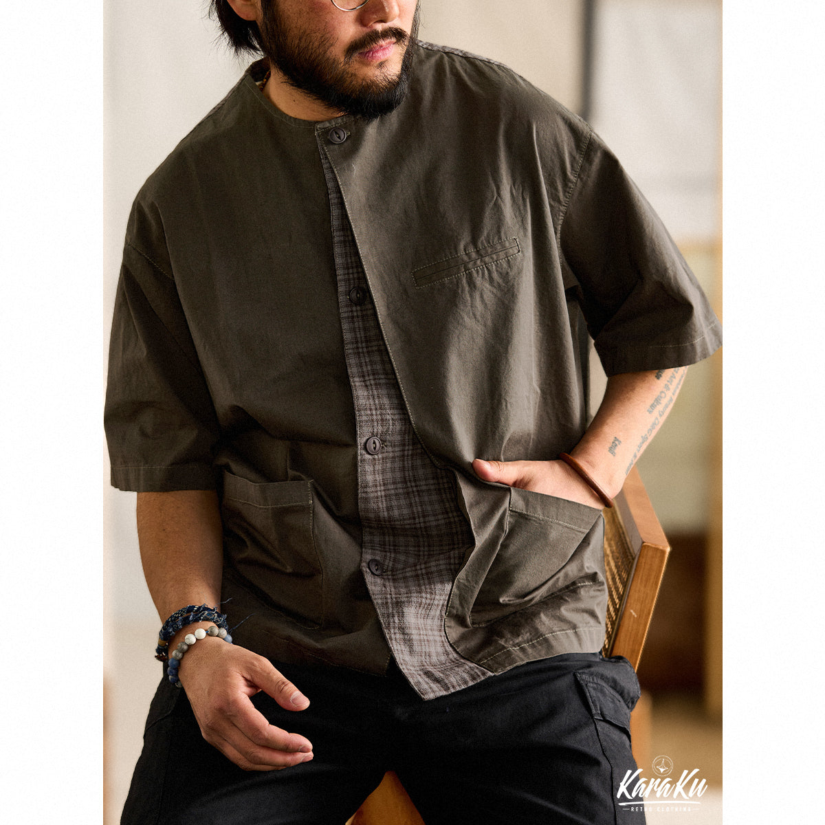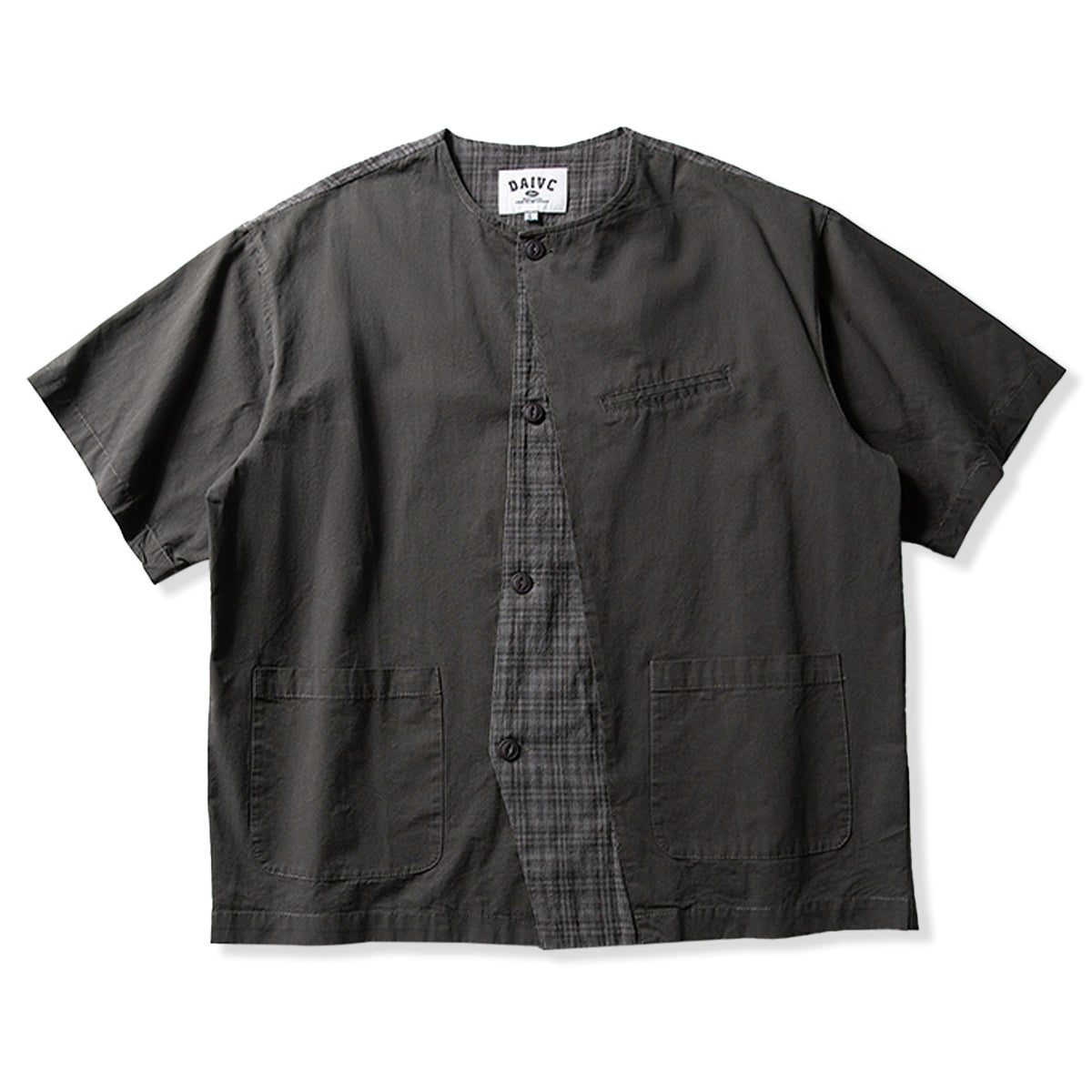 페이크 레이어드 패치워크 체크 무늬 전환 코튼 반팔 셔츠