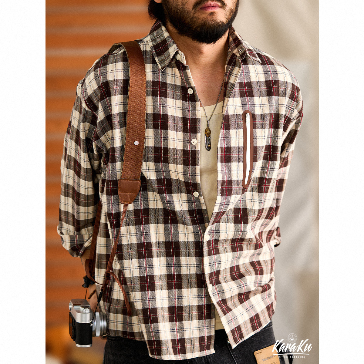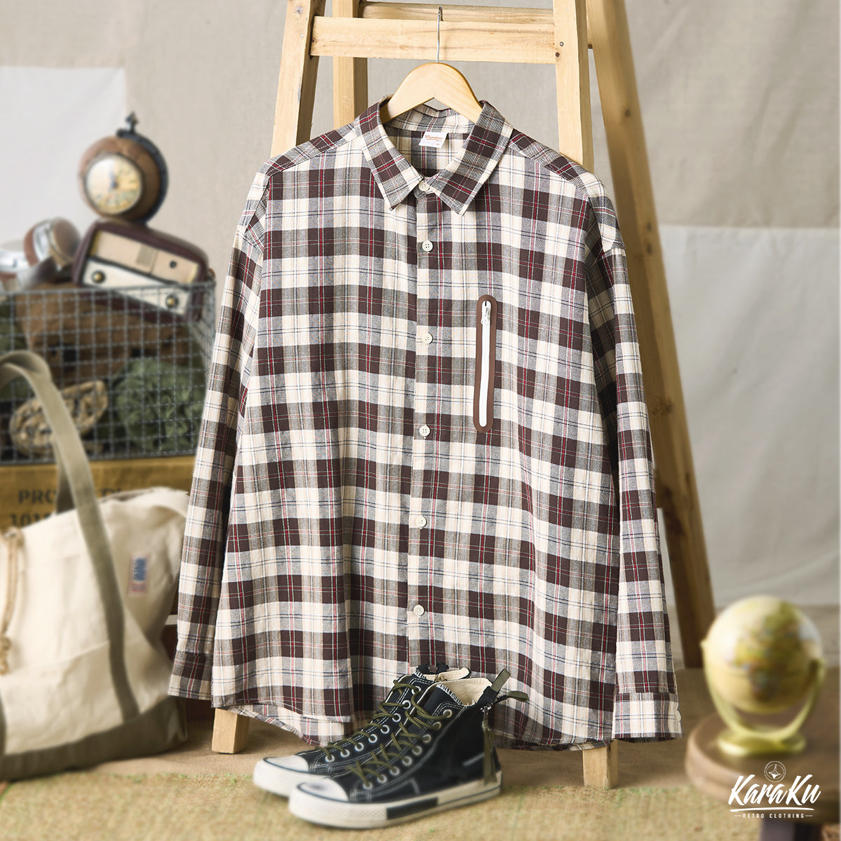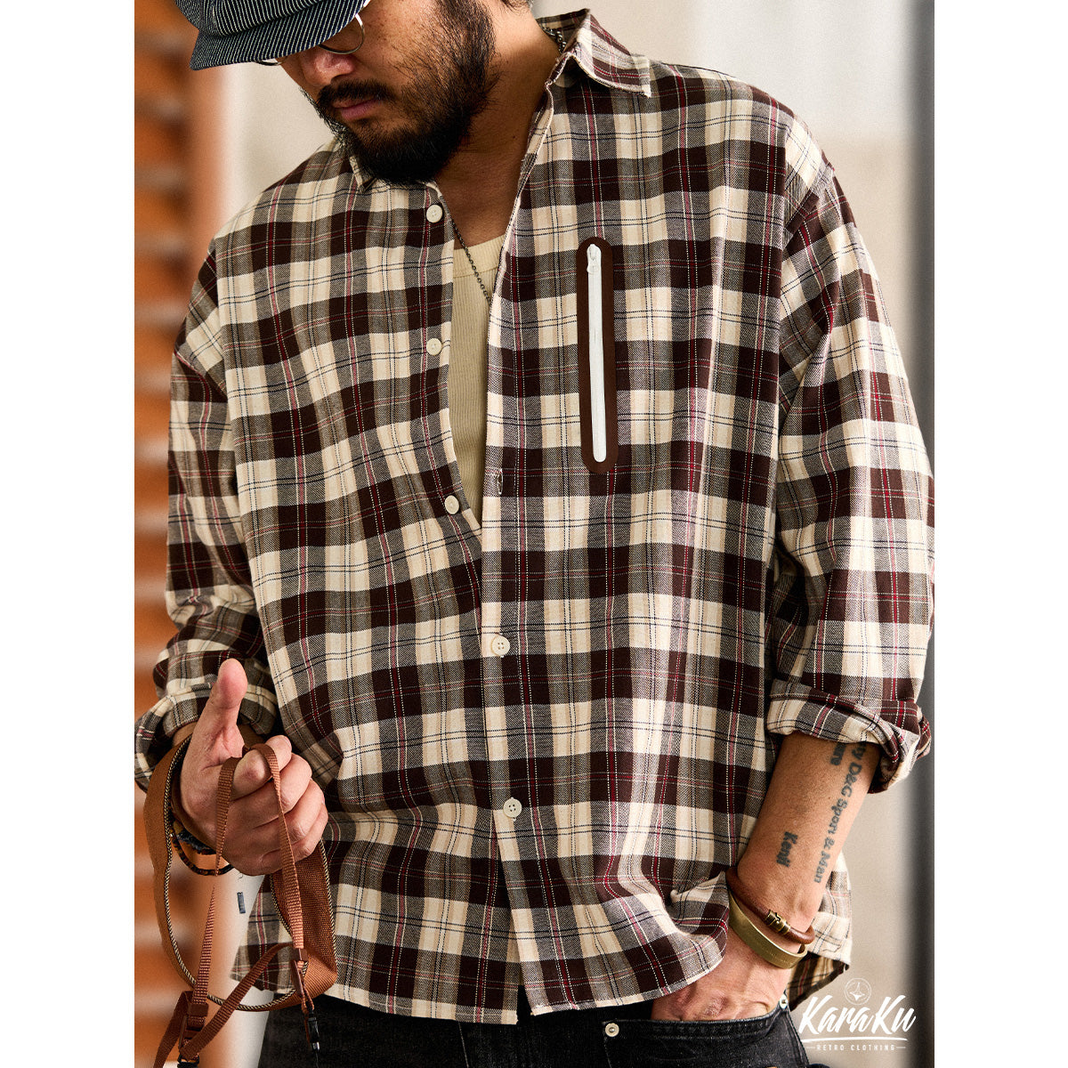 Gorpcore 집포켓 체크무늬 긴팔 셔츠