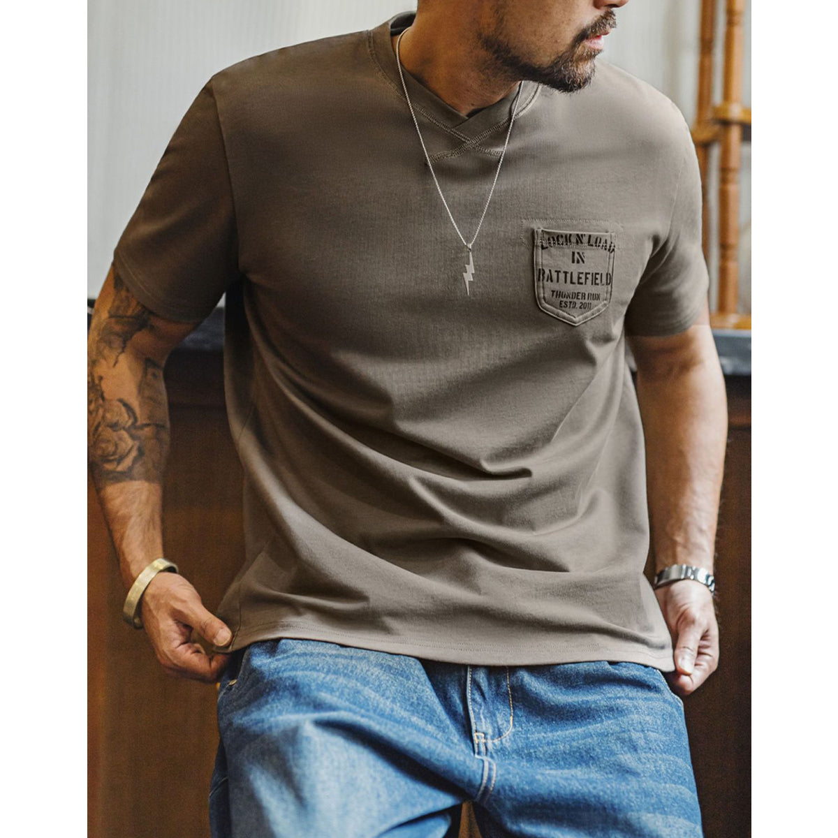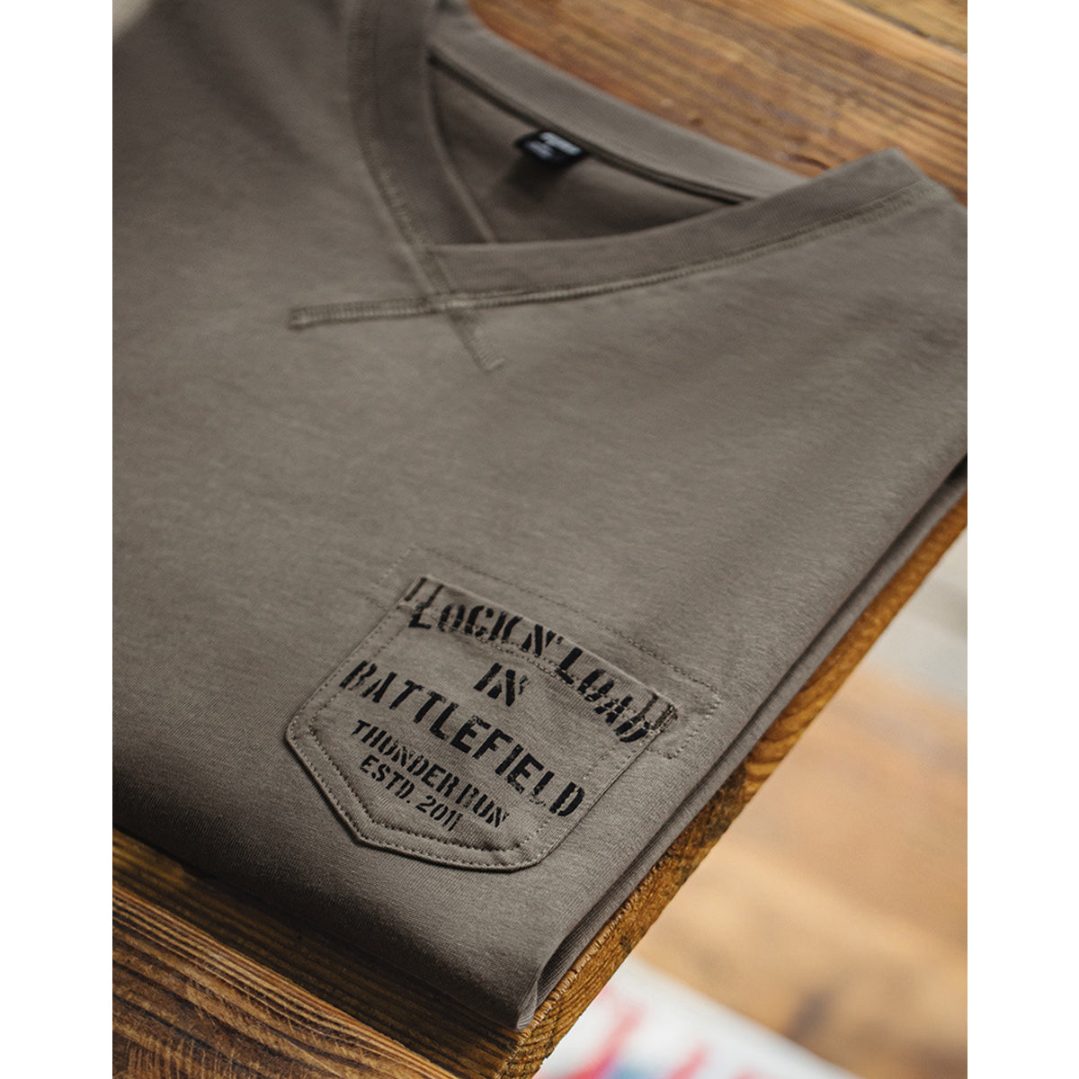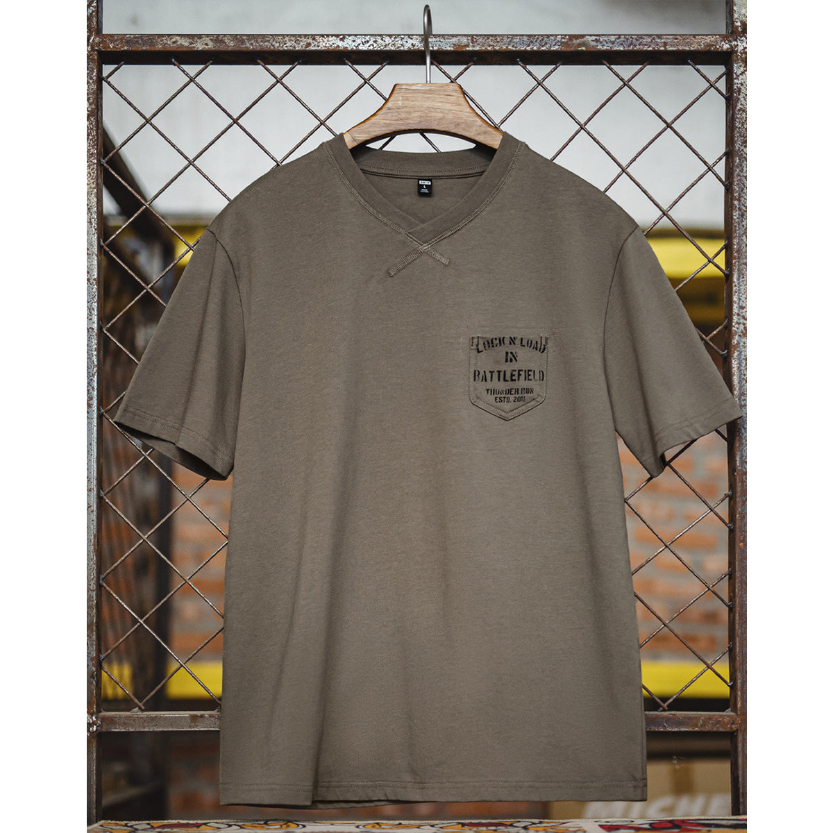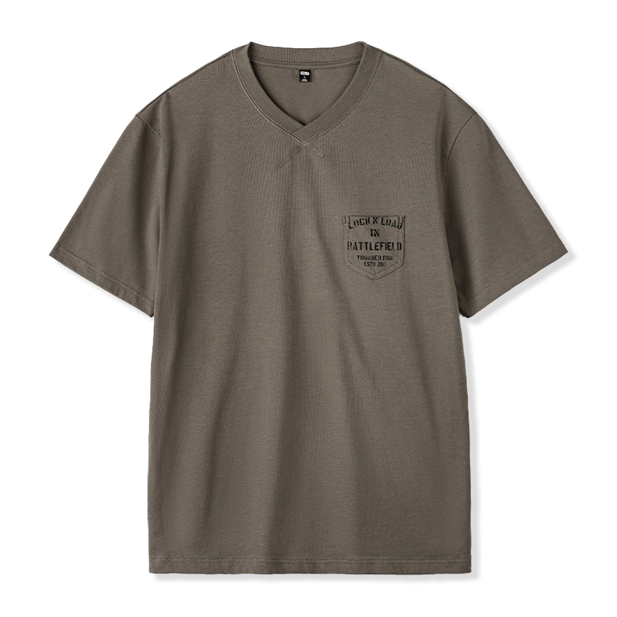 V스티치와 밀리터리 텍스트로 택티컬 감성을 더한 편안한 티셔츠. 코튼 100% 소재로 착용감과 내구성을 모두 갖춘 실용 아이템.