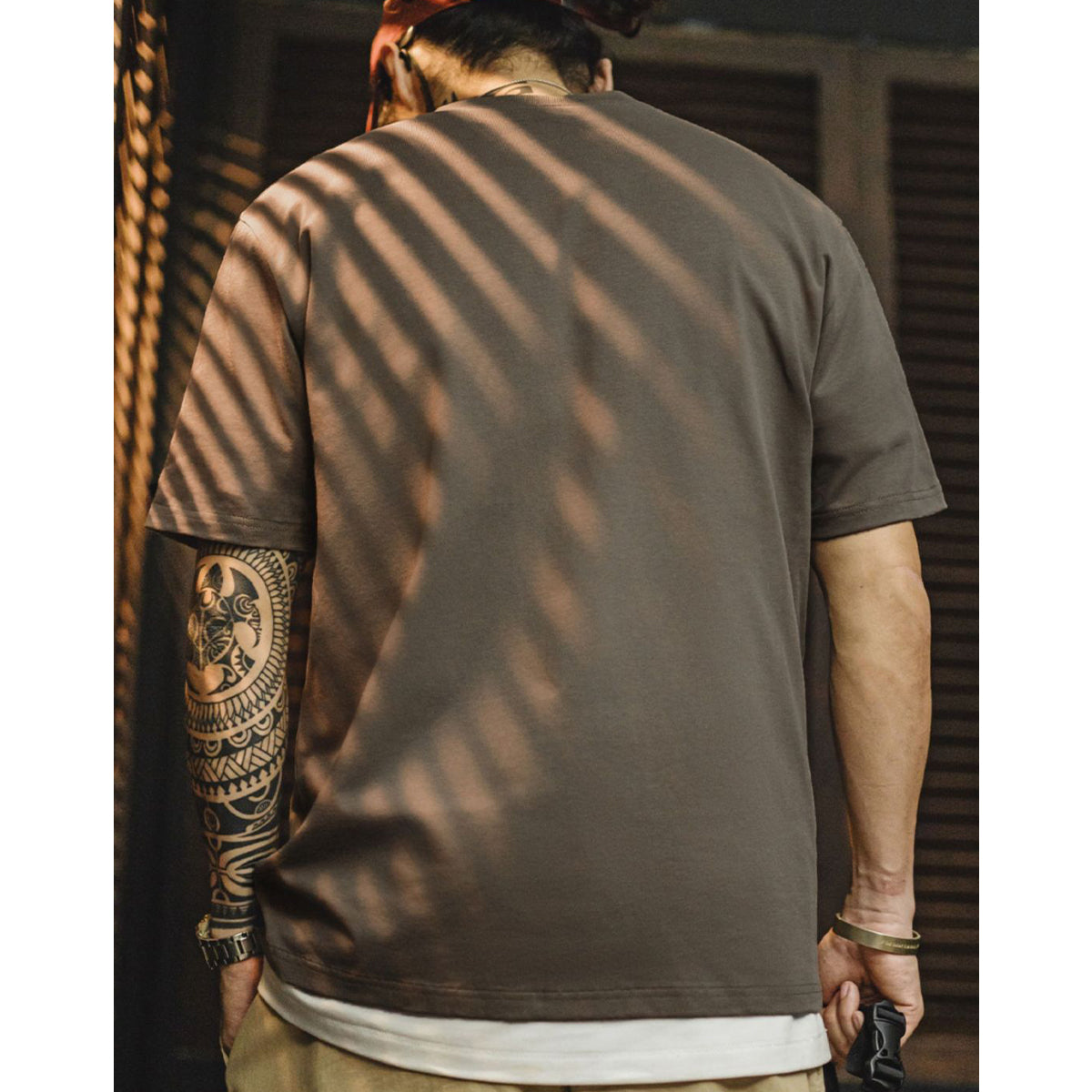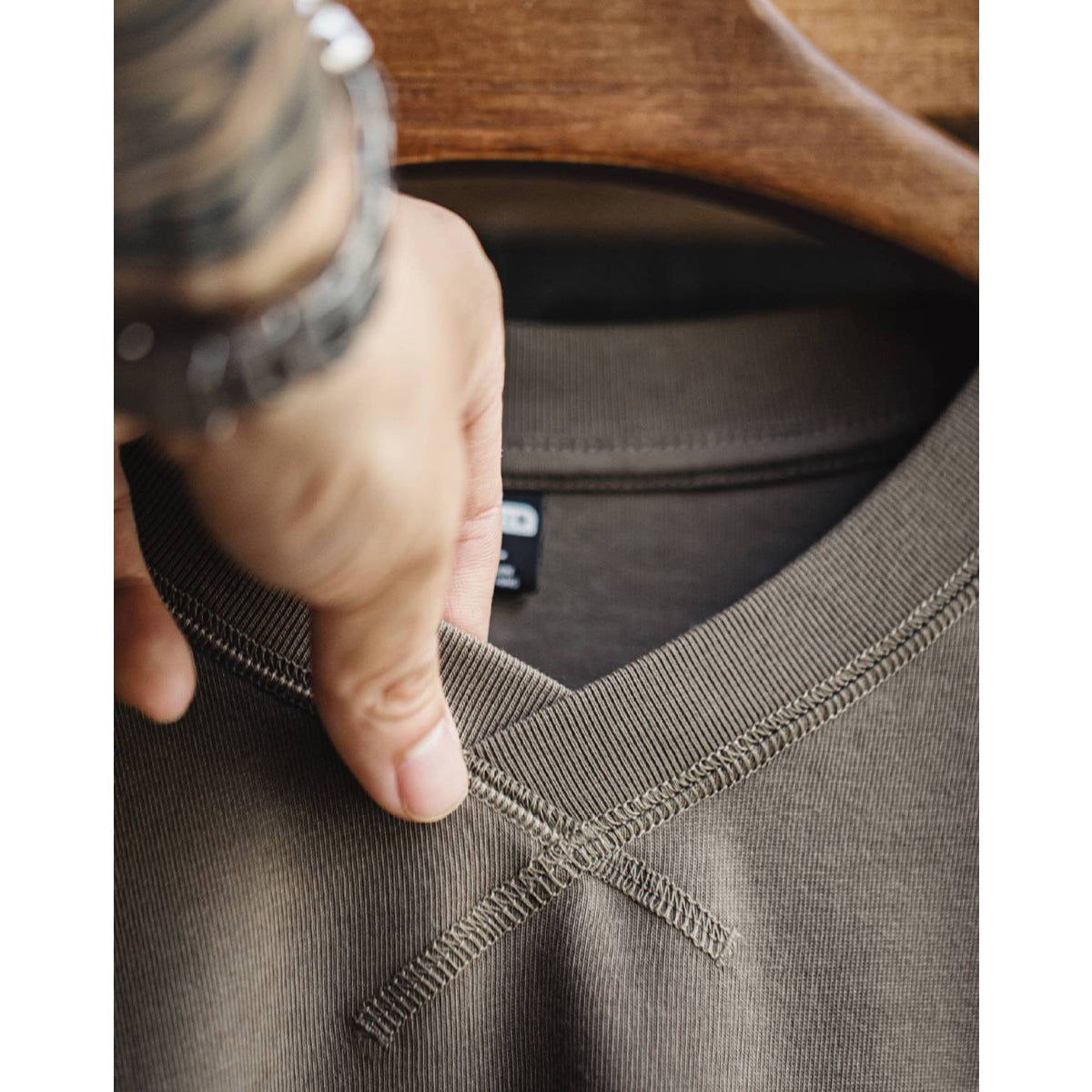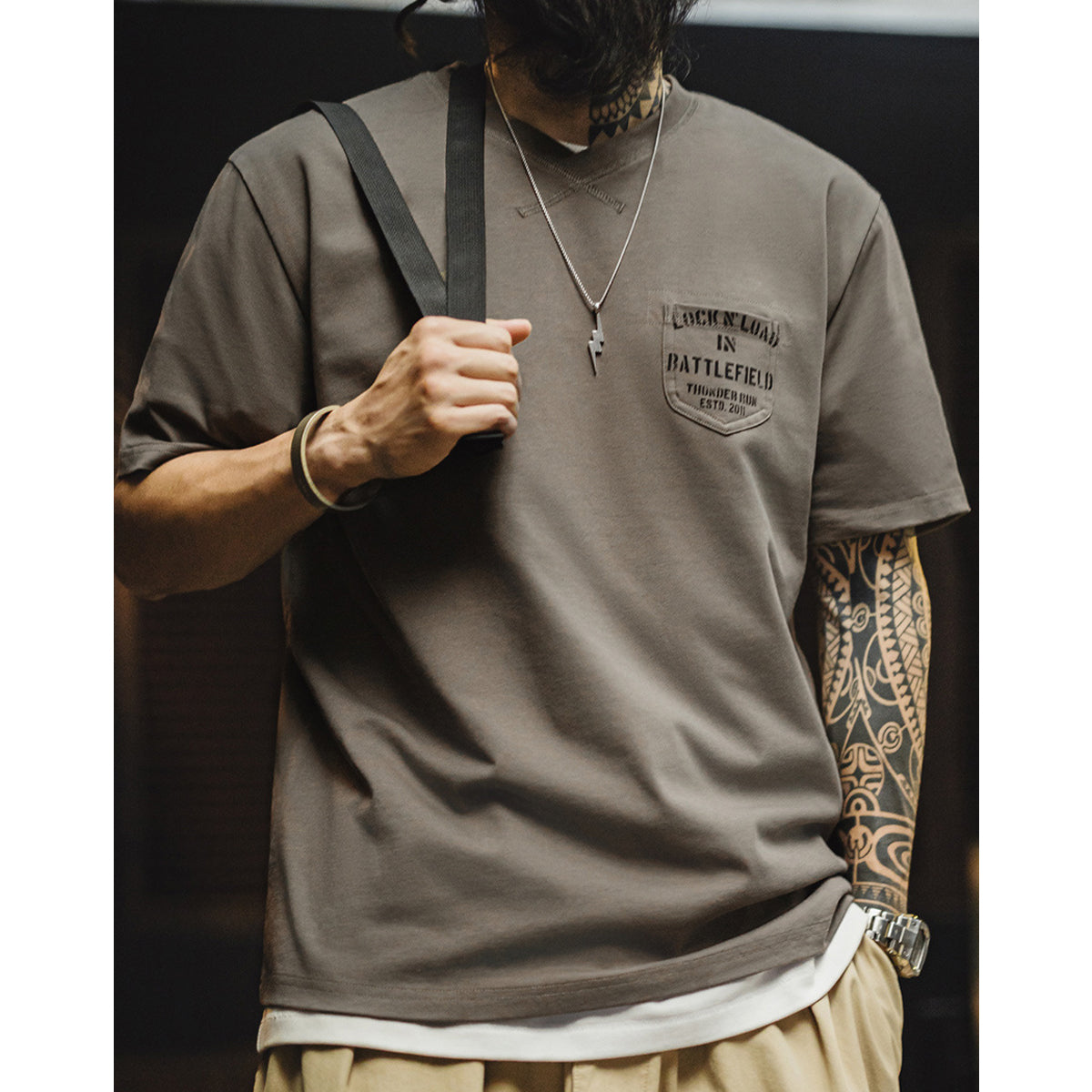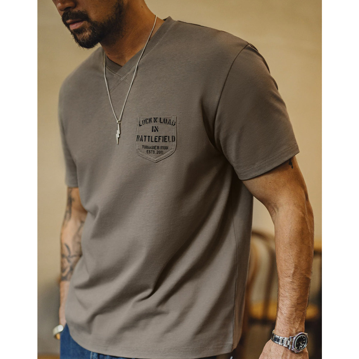 V스티치와 밀리터리 텍스트로 택티컬 감성을 더한 편안한 티셔츠. 코튼 100% 소재로 착용감과 내구성을 모두 갖춘 실용 아이템.