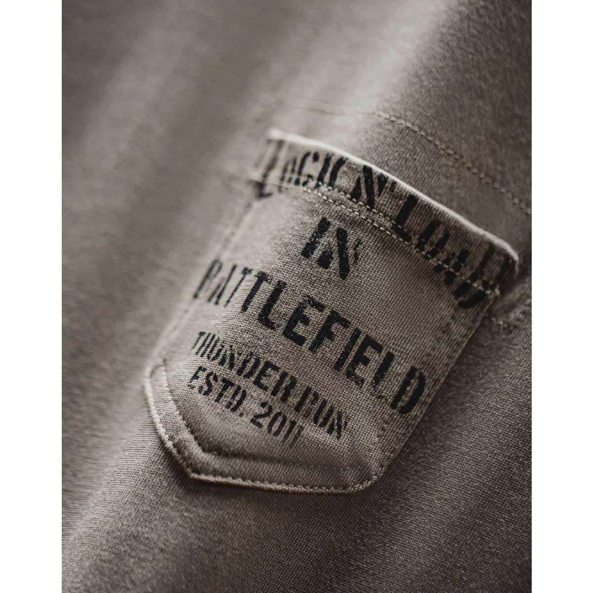 포켓에 밀리터리 분위기의 텍스트를 빈티지 질감의 글씨체로 프린트해 택티컬한 무드를 연출했습니다.