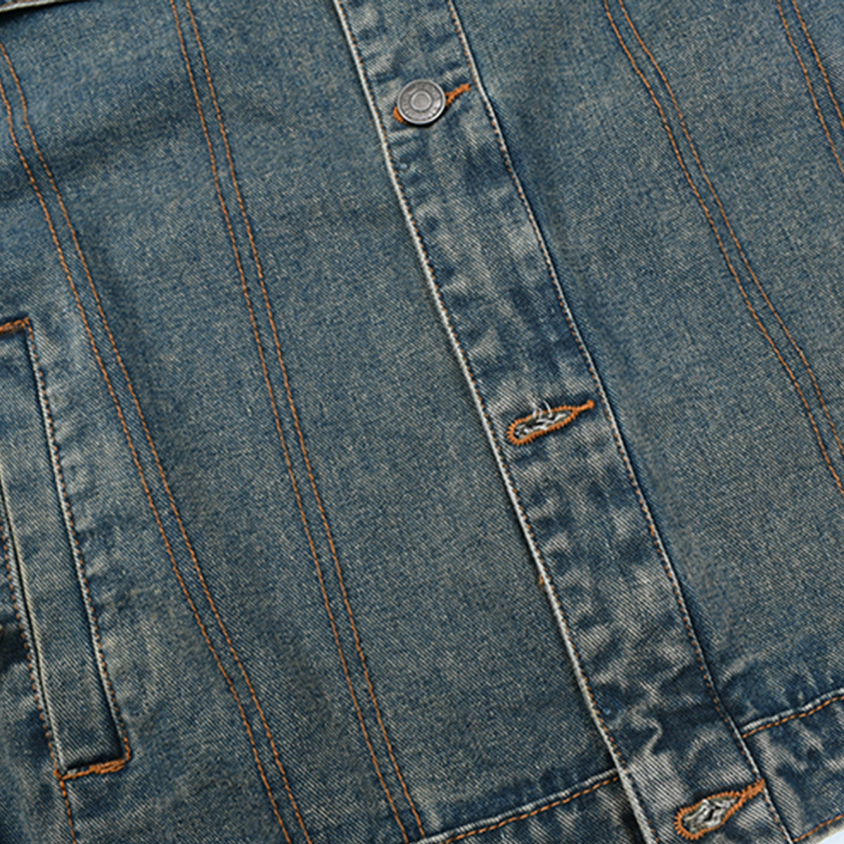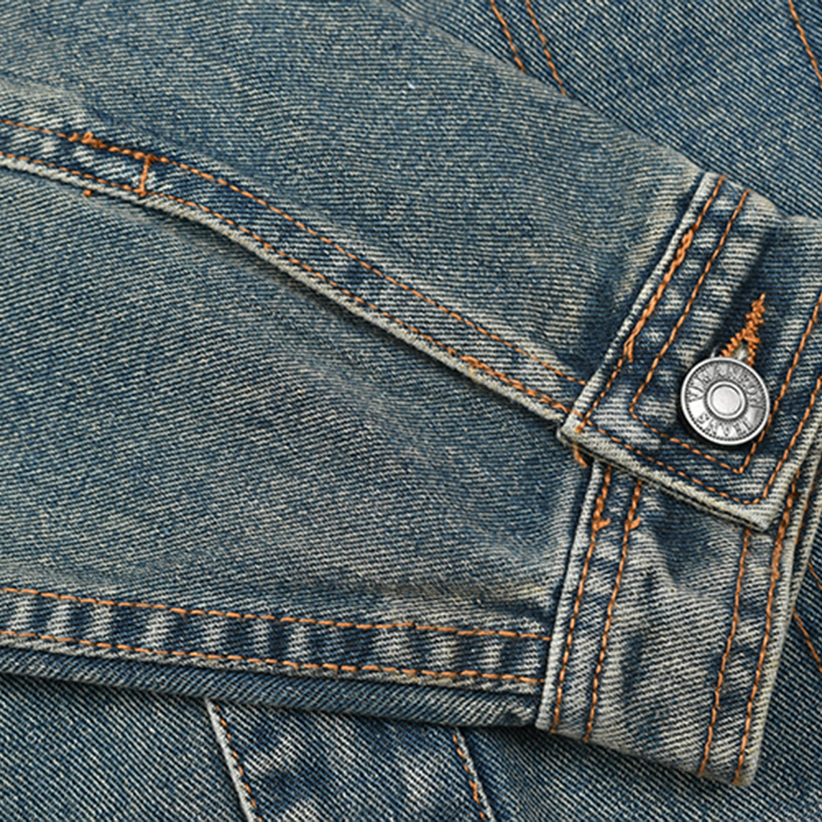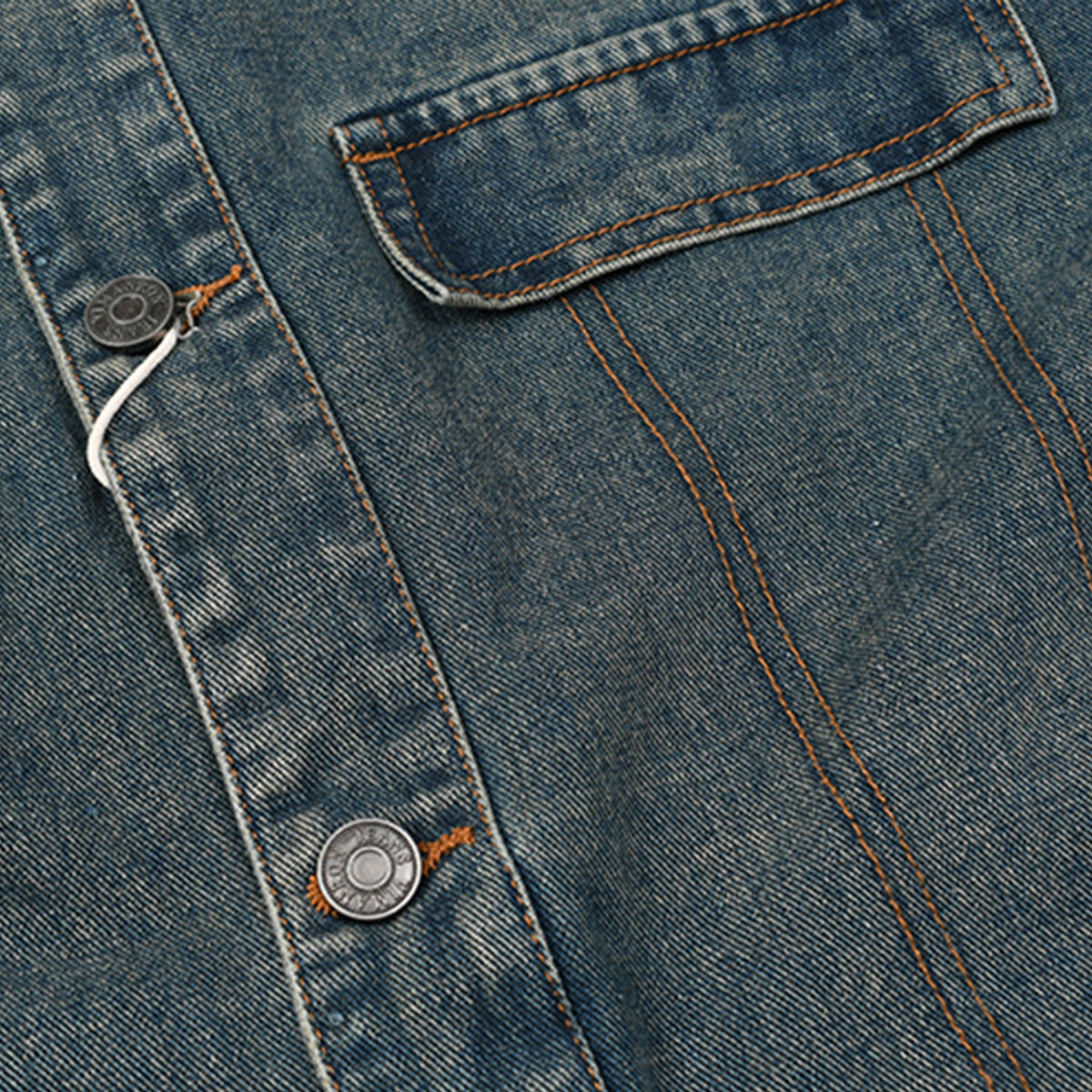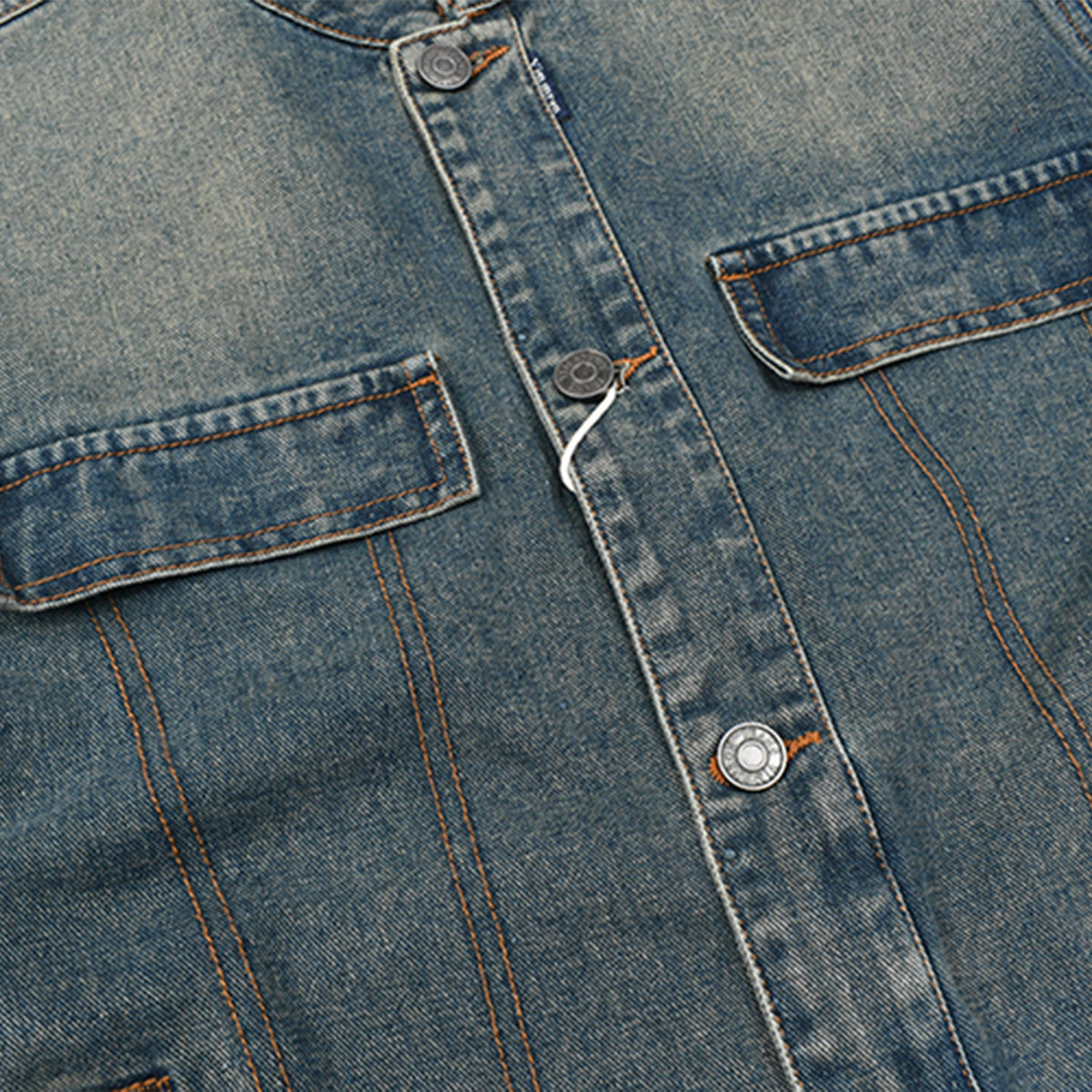 스탠드 칼라와 박스 실루엣의 빈티지 데님 재킷으로, 스타일리시하면서도 실용적인 디자인입니다.