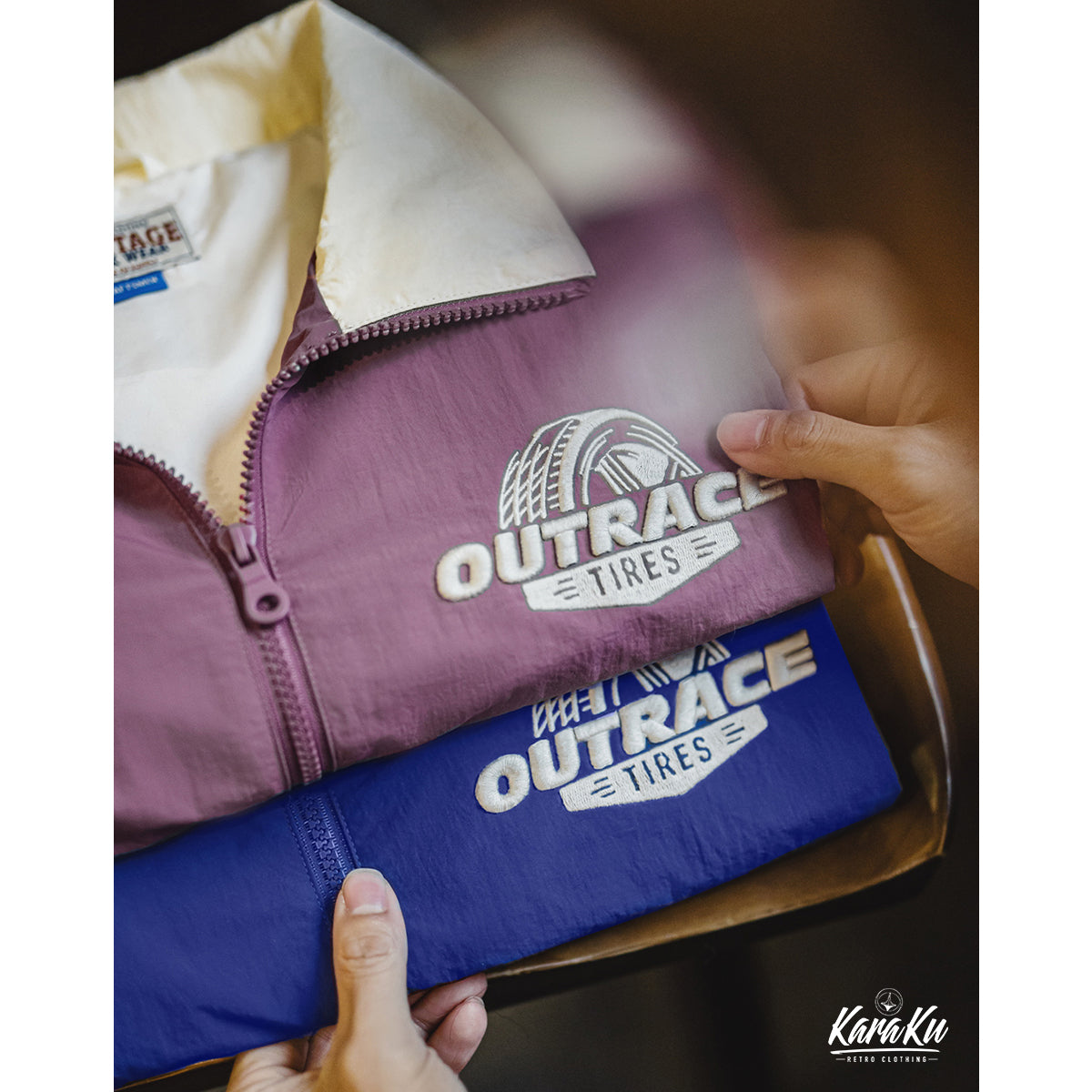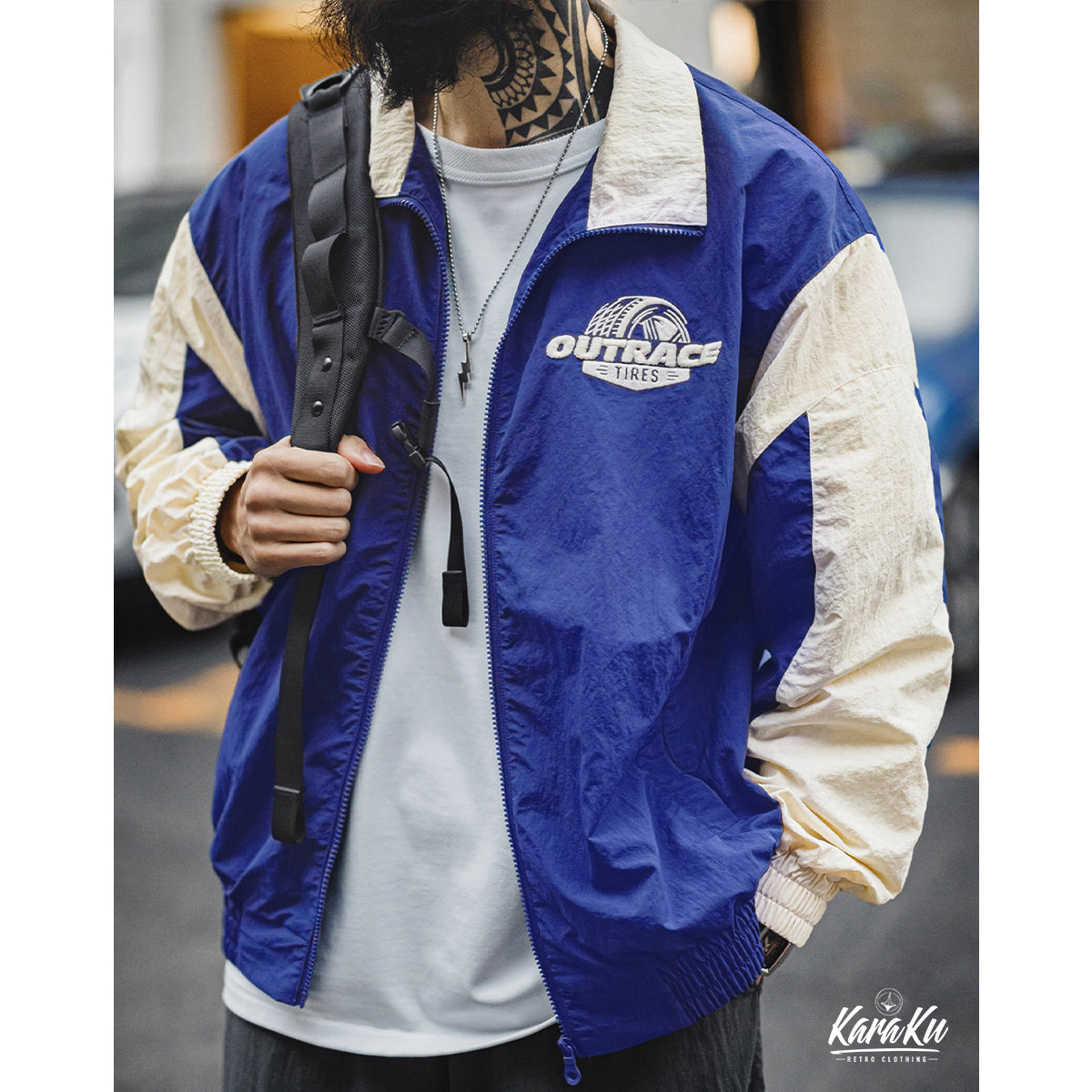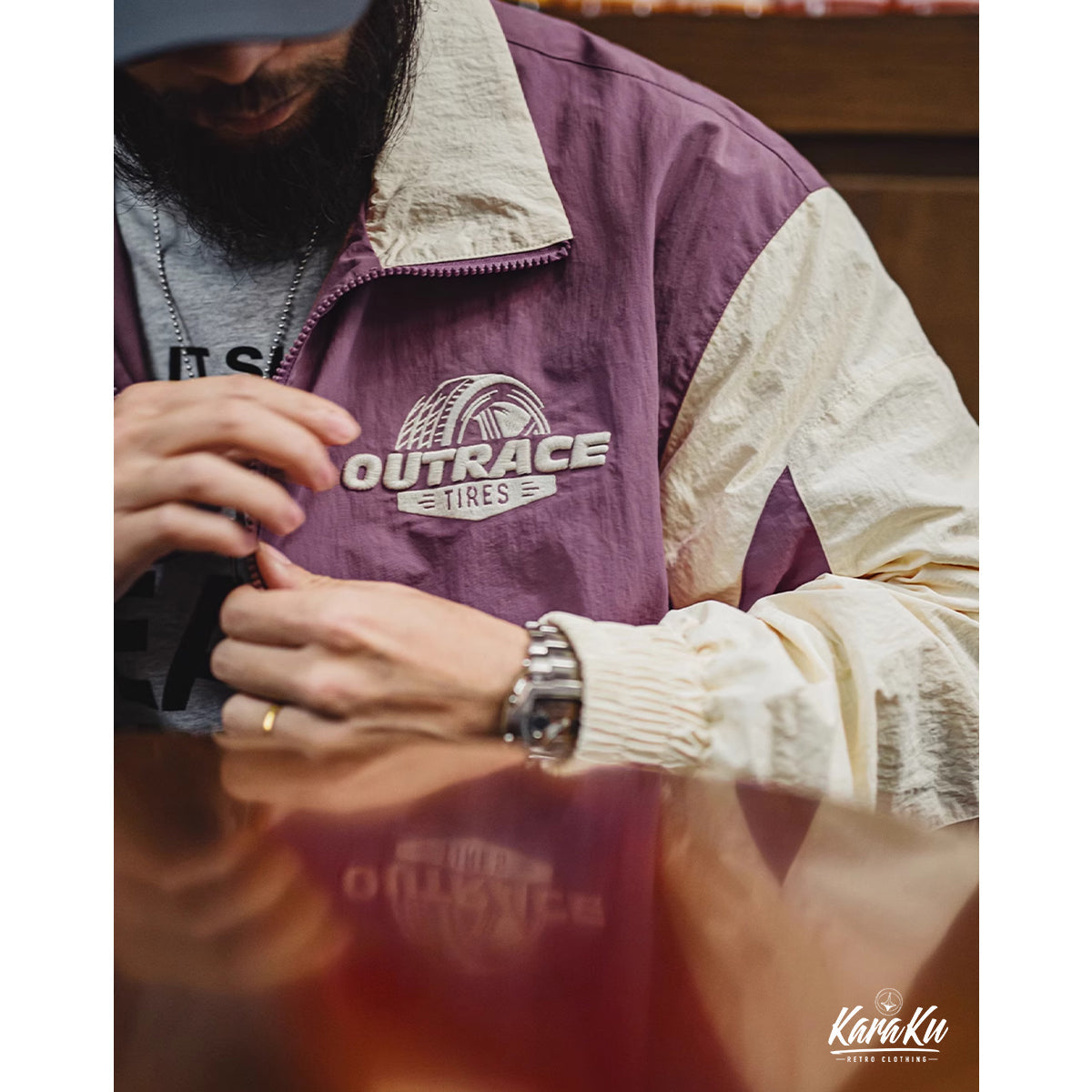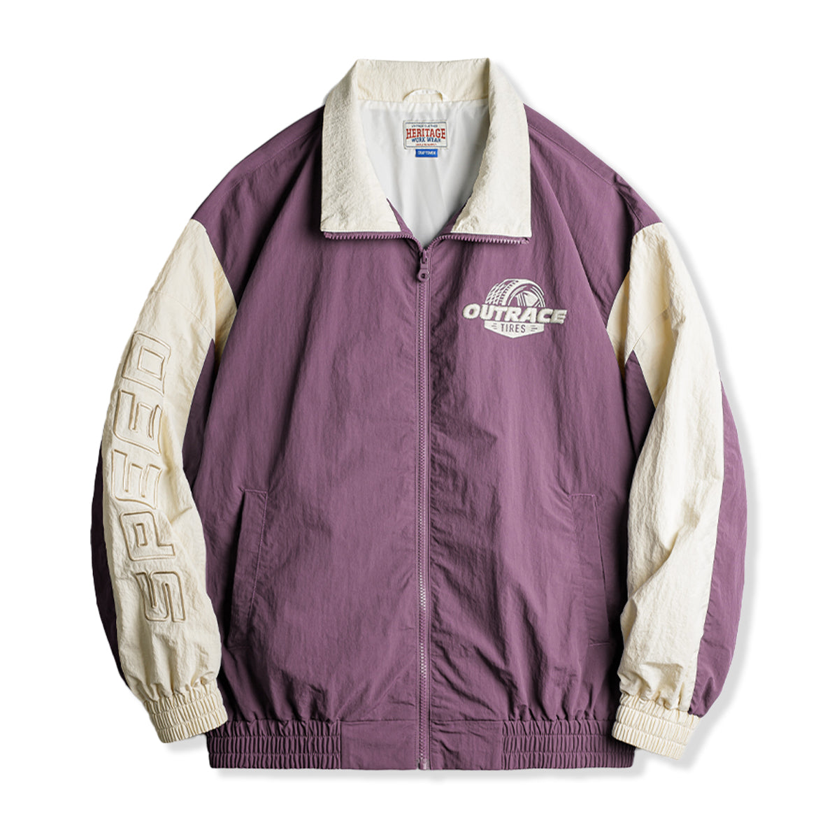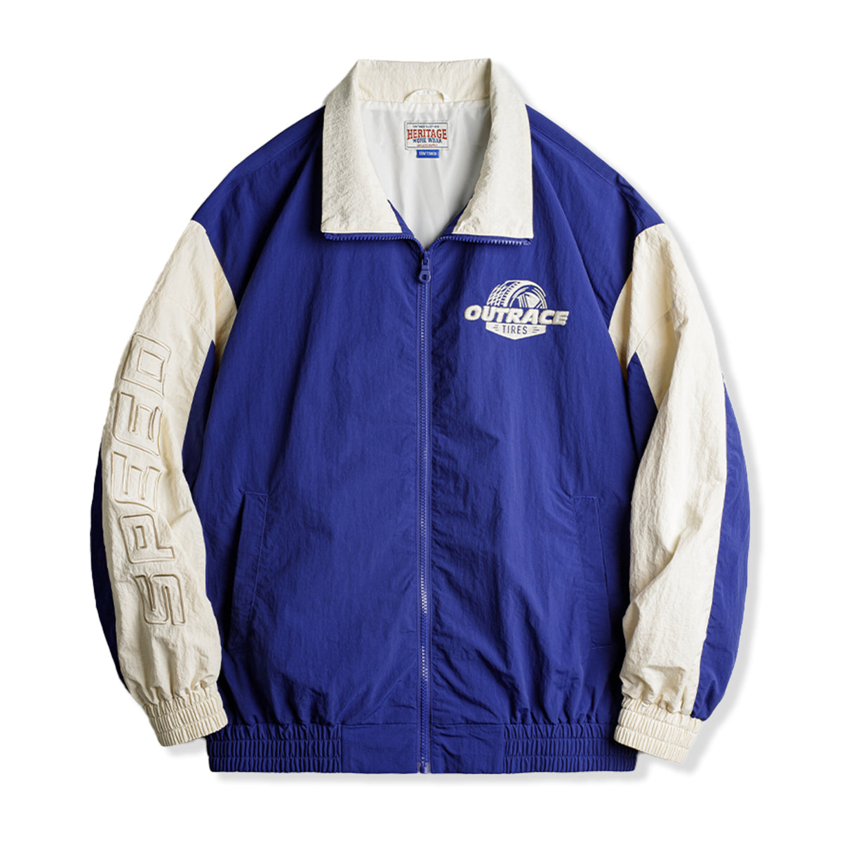 가슴에는 'OUTRACE TIRES' 자수가, 왼쪽 소매에는 'SPEED' 입체 자수가 더해져 레이싱 감성을 강조하며, 소매와 밑단에는 고무 처리를 적용해 방풍성을 고려했습니다.