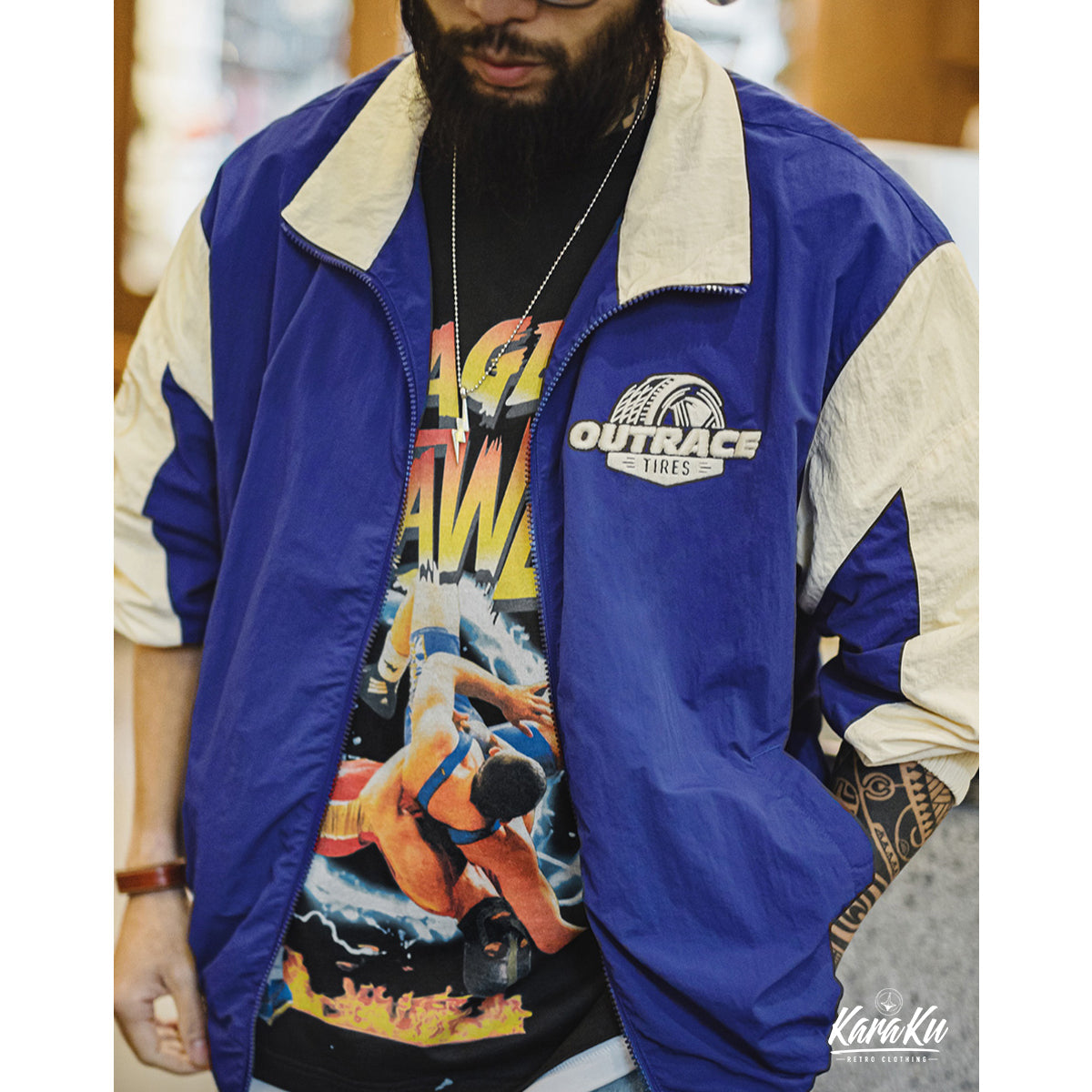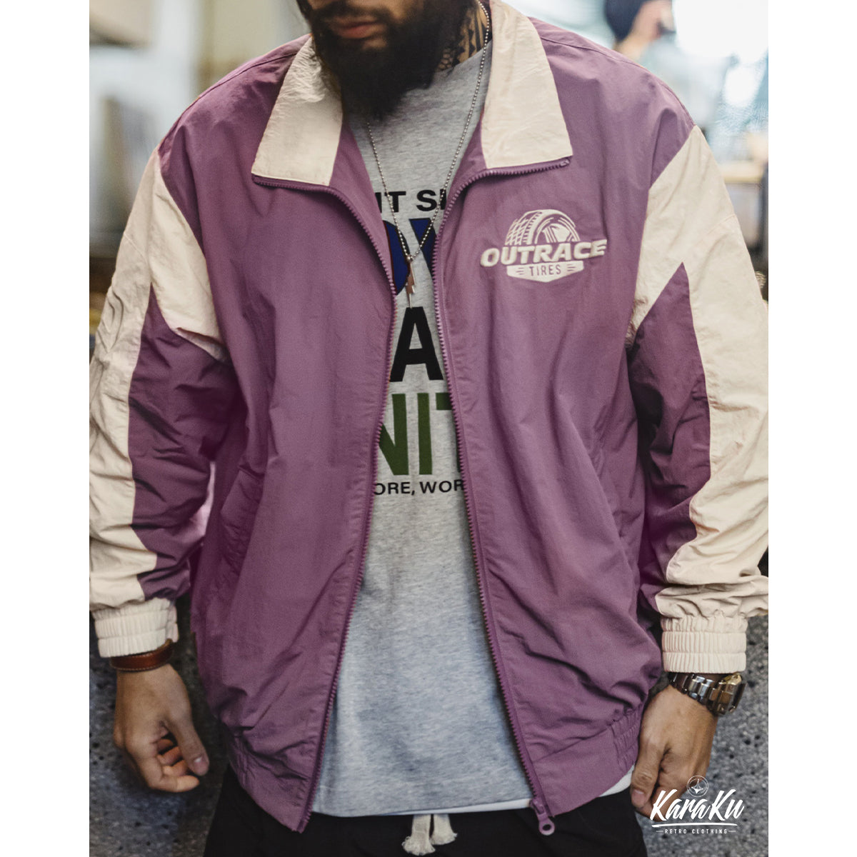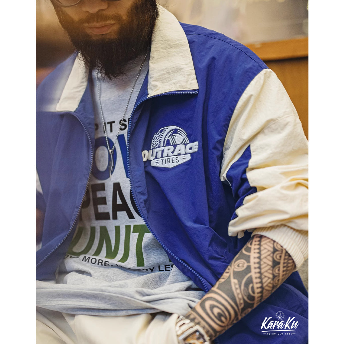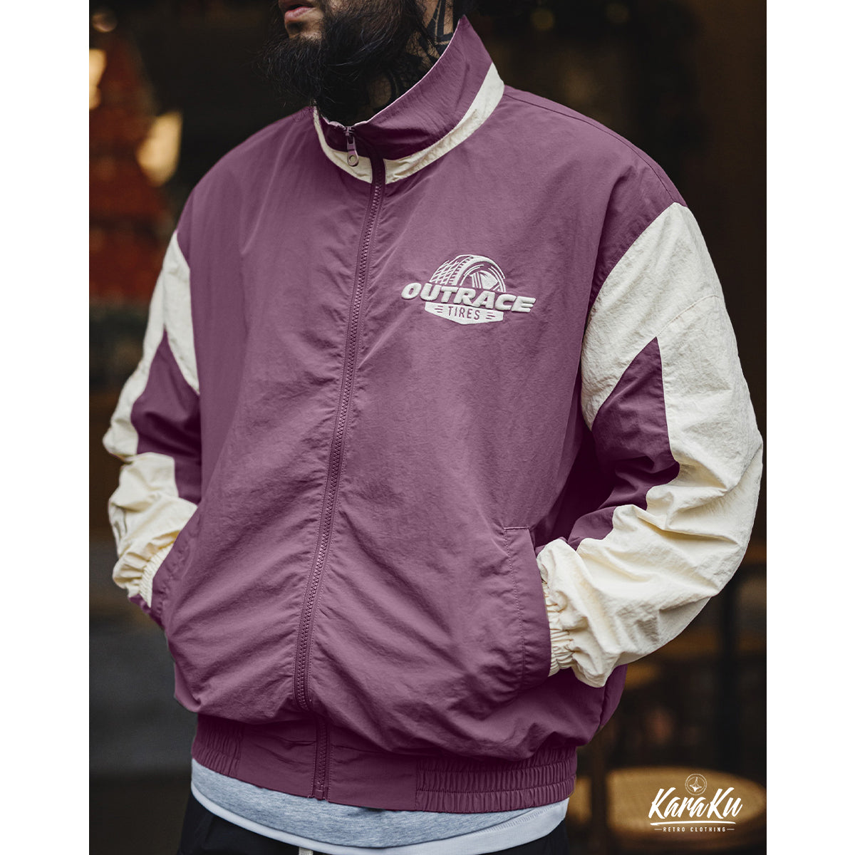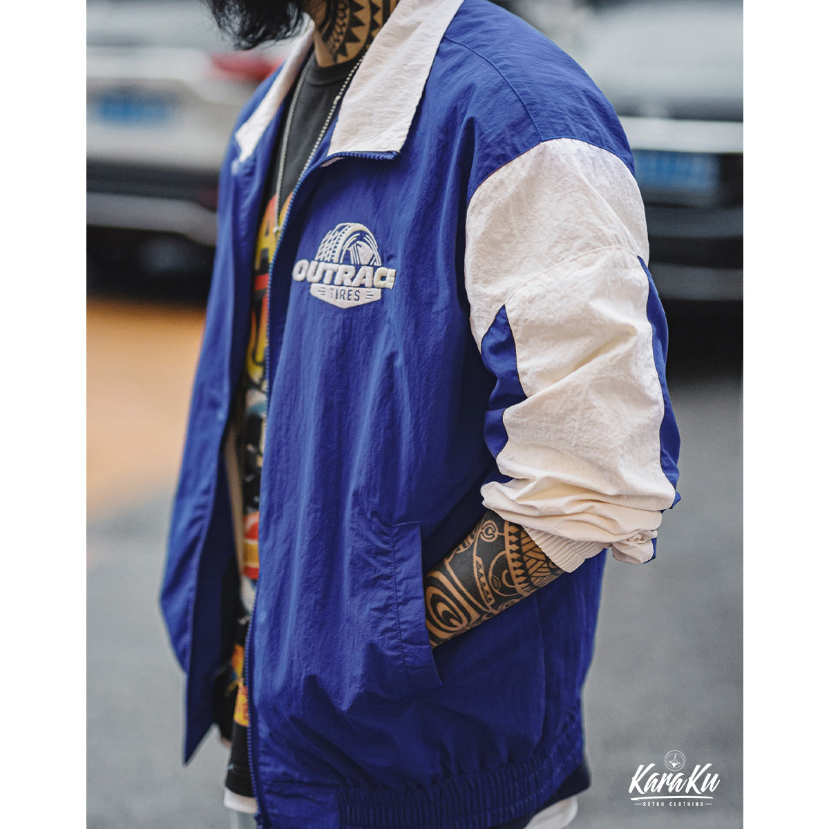 가슴에는 'OUTRACE TIRES' 자수가, 왼쪽 소매에는 'SPEED' 입체 자수가 더해져 레이싱 감성을 강조하며, 소매와 밑단에는 고무 처리를 적용해 방풍성을 고려했습니다.
