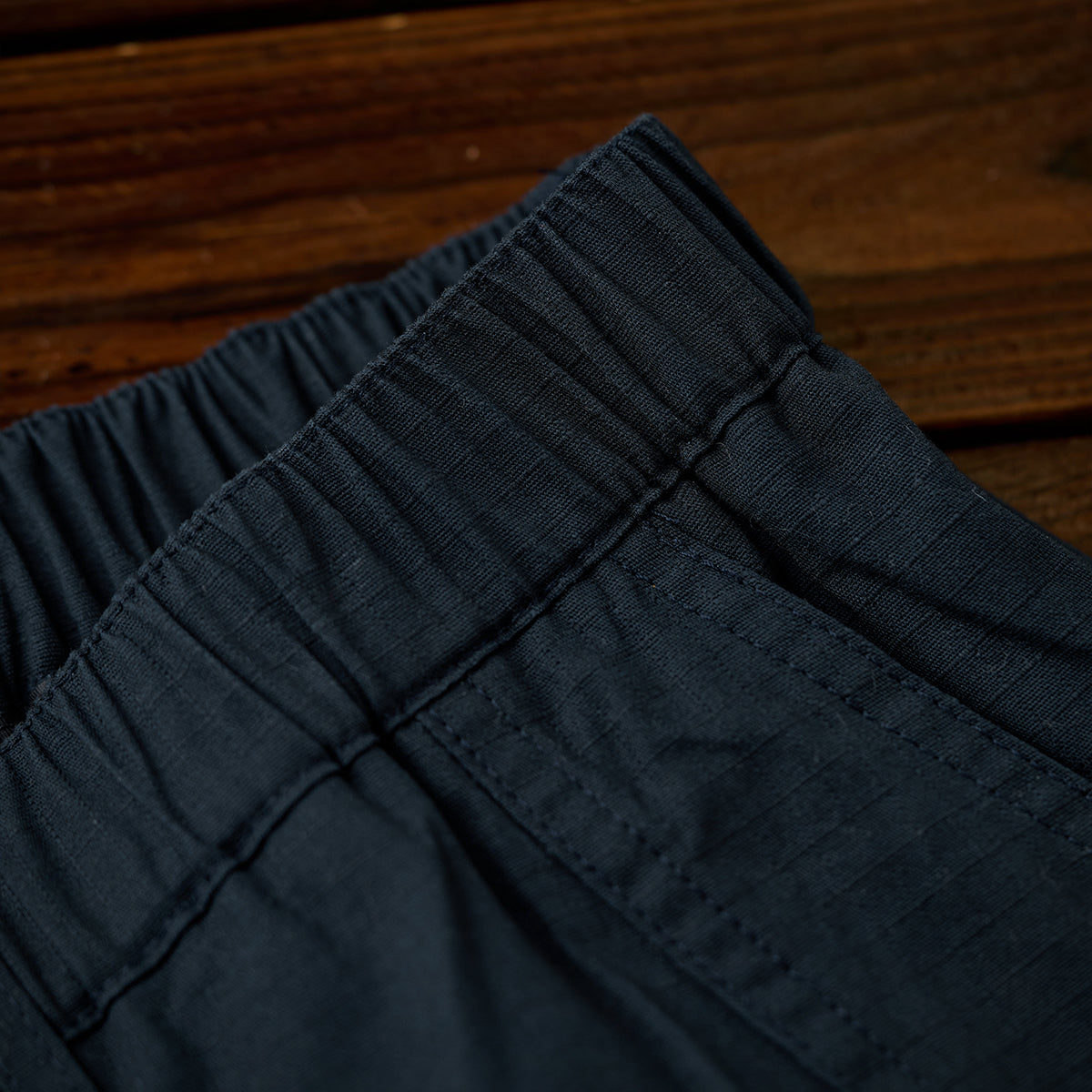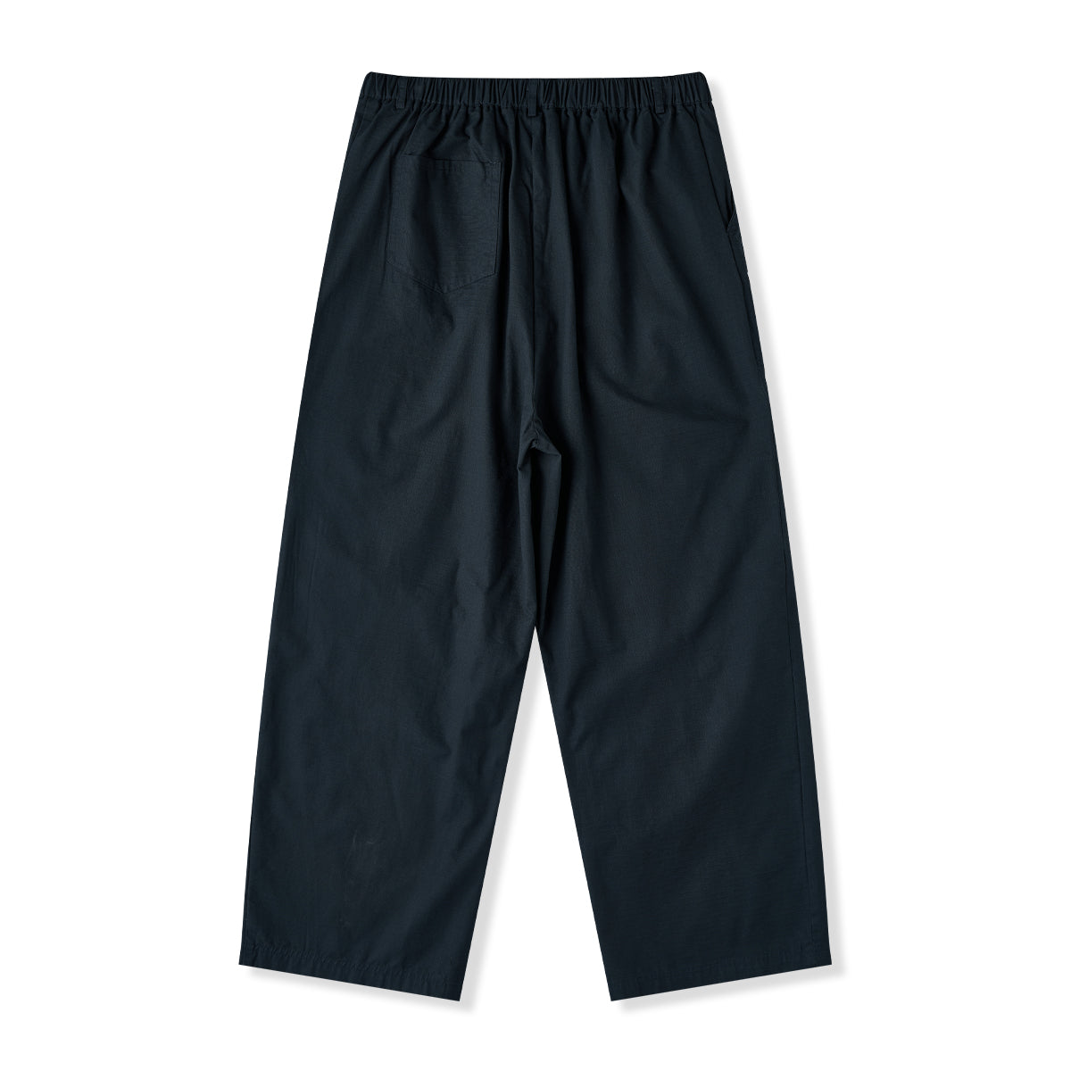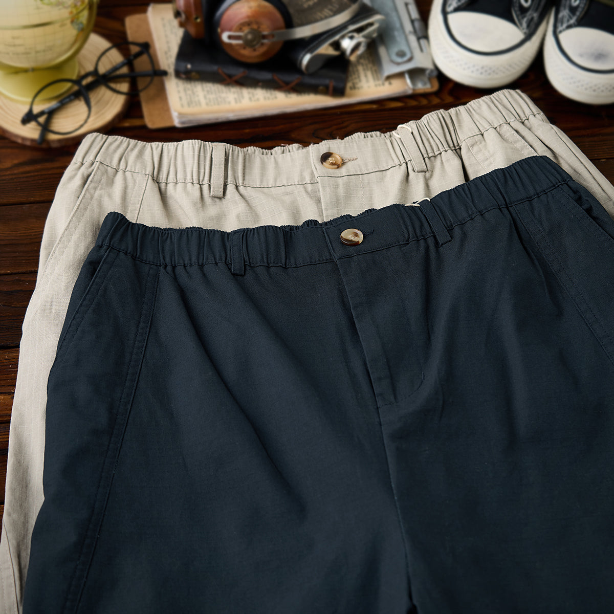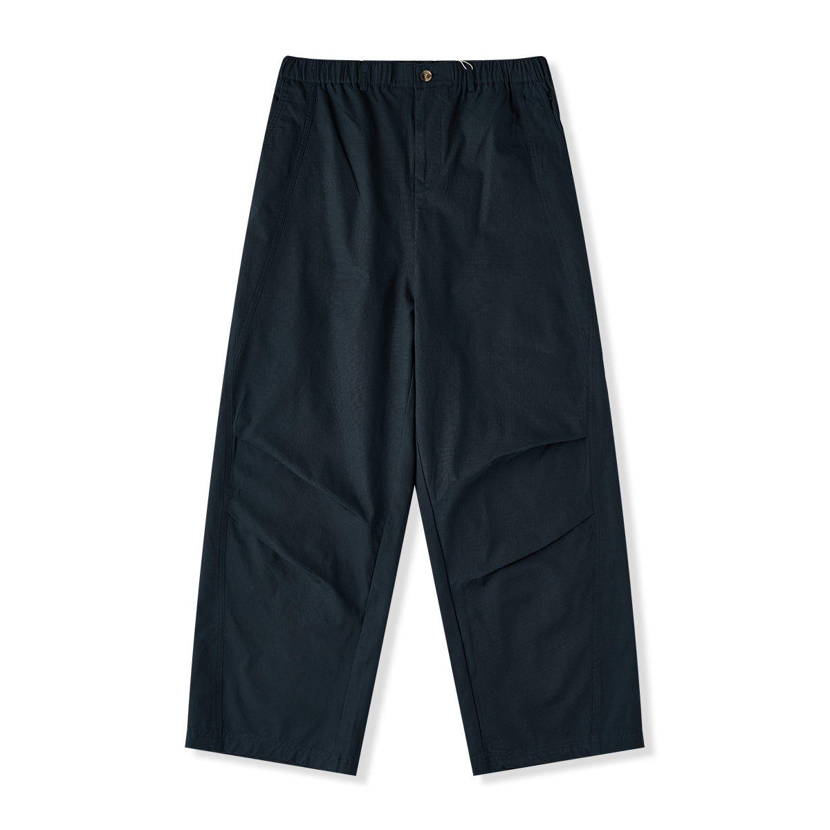 허리 밴드와 버튼·지퍼 여밈으로 편안함과 실용성을 갖춘 립스톱 스트레이트 팬츠로, 와이드 실루엣과 무릎 턱 디테일이 활동성과 입체감을 더합니다.
