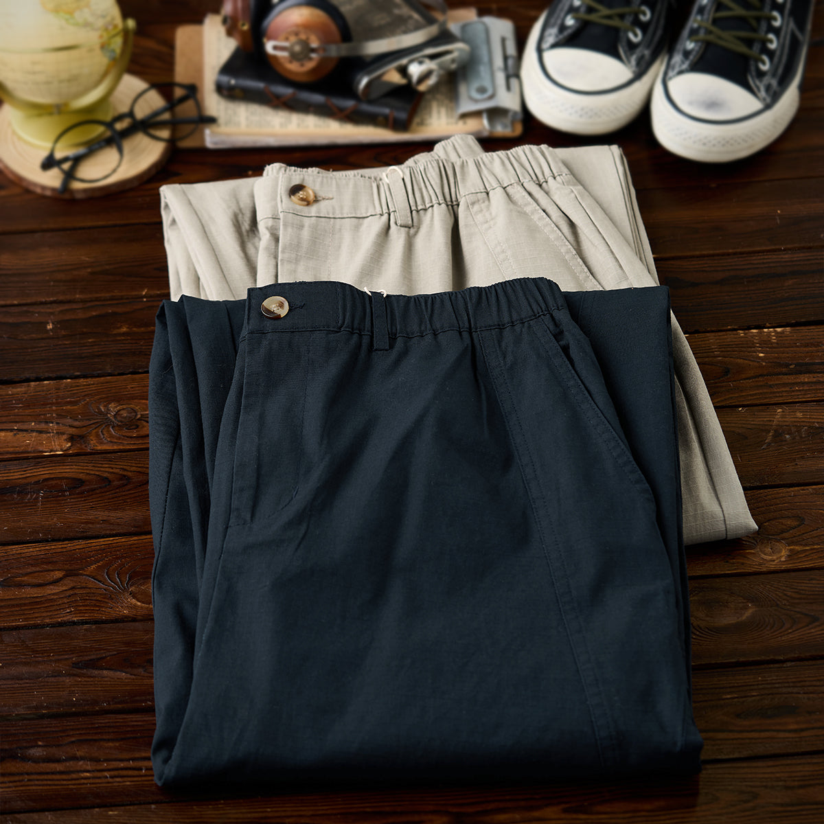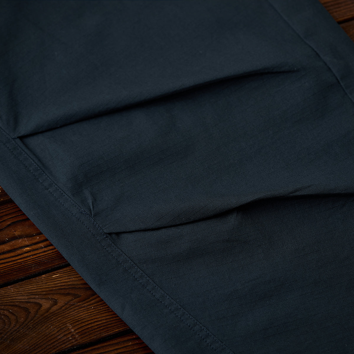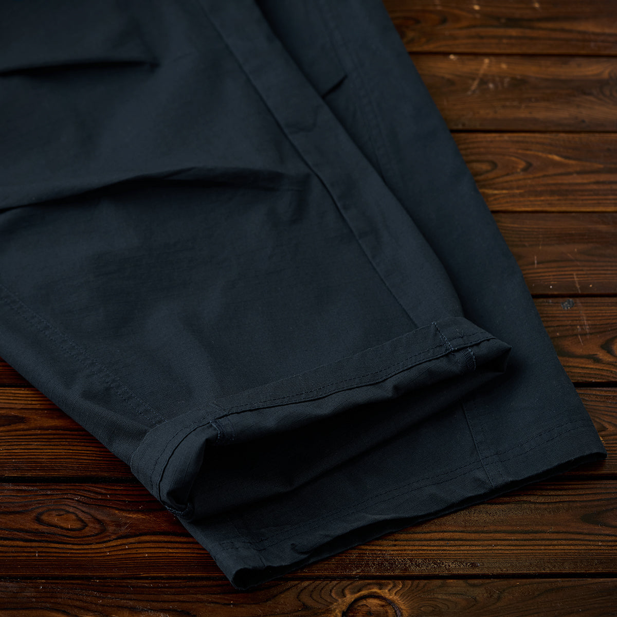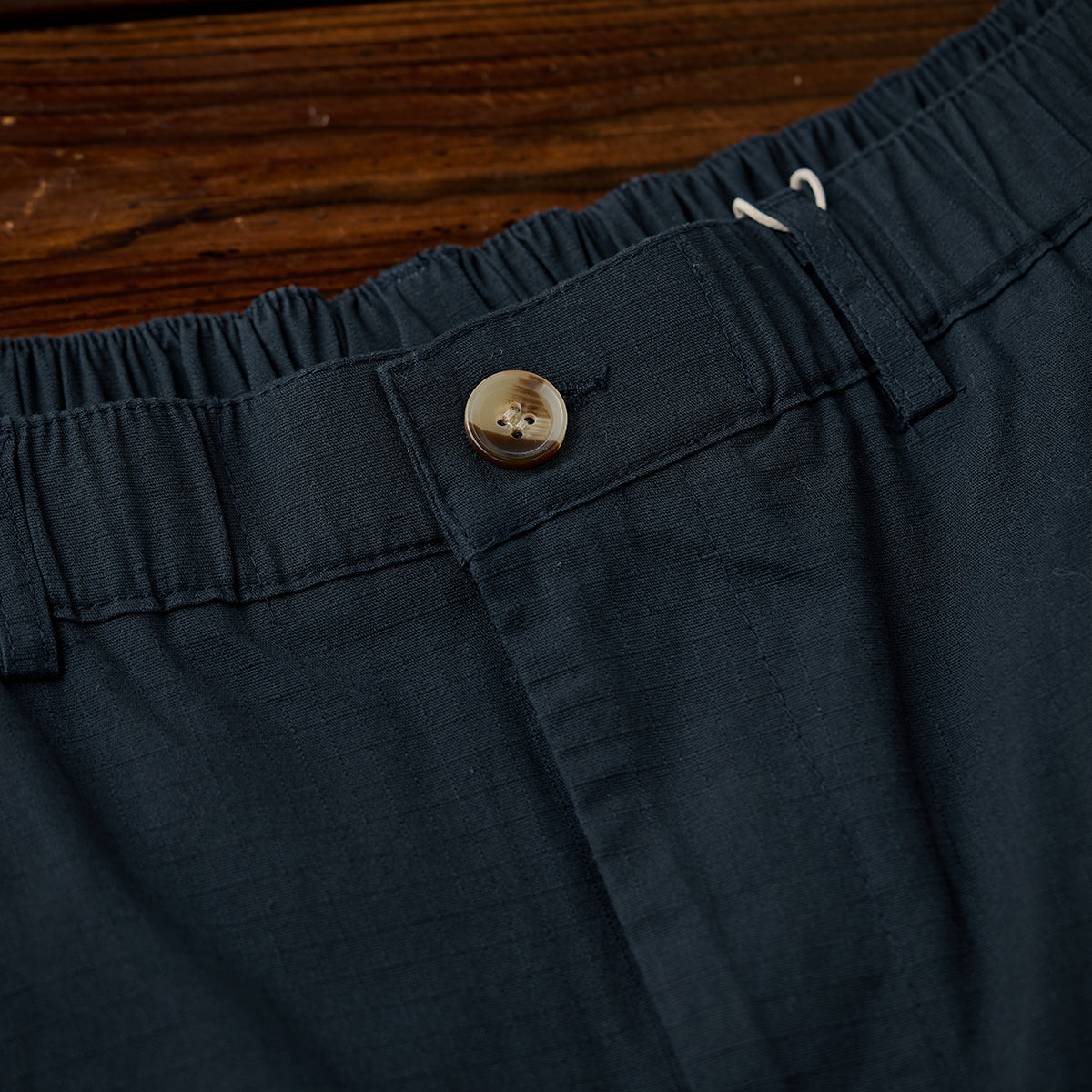 허리 밴드와 버튼·지퍼 여밈으로 편안함과 실용성을 갖춘 립스톱 스트레이트 팬츠로, 와이드 실루엣과 무릎 턱 디테일이 활동성과 입체감을 더합니다.