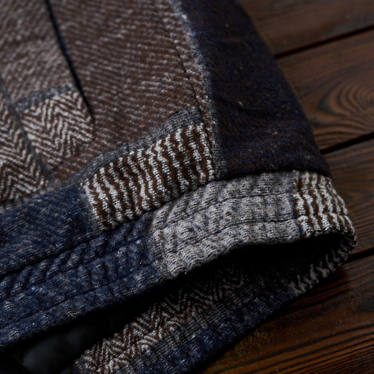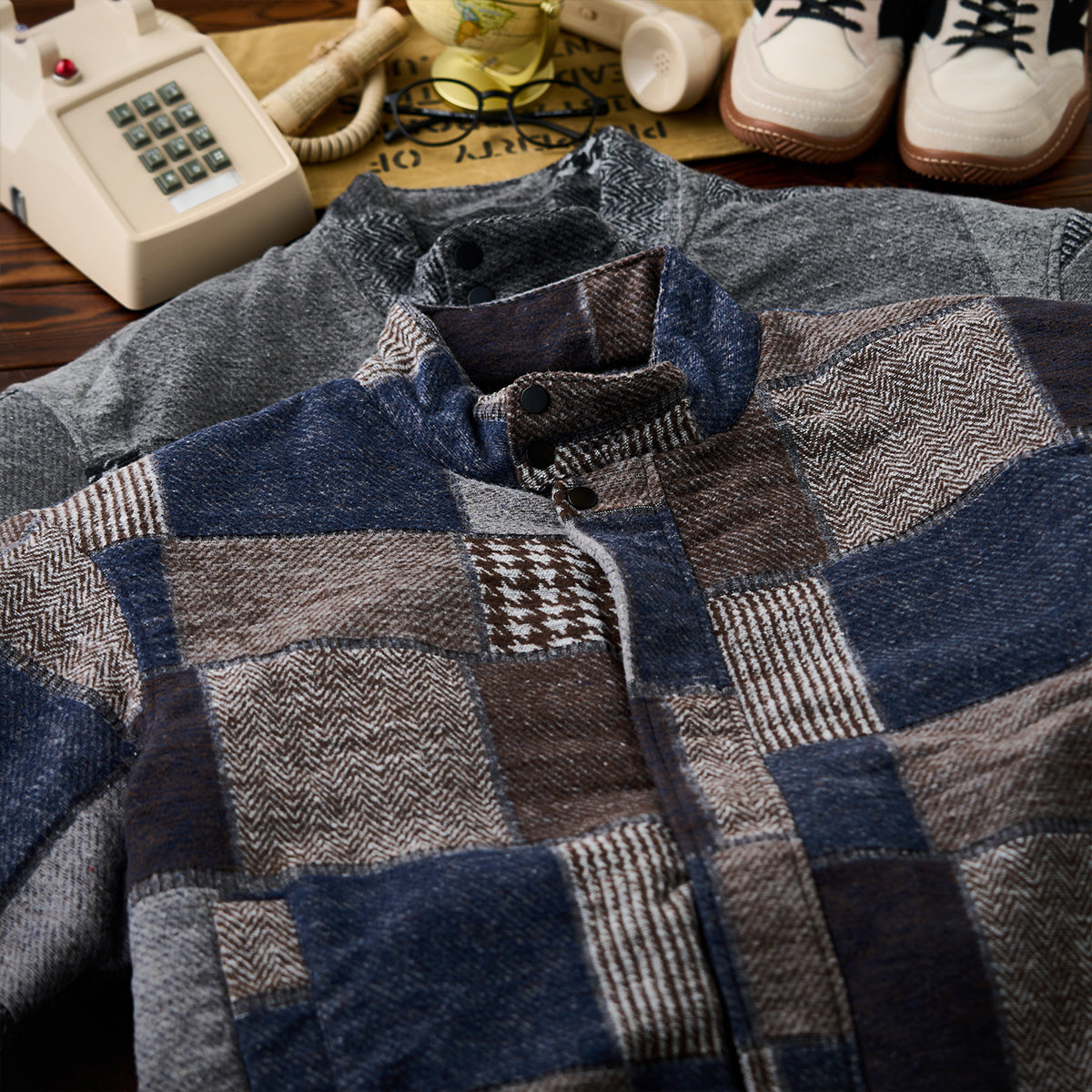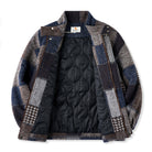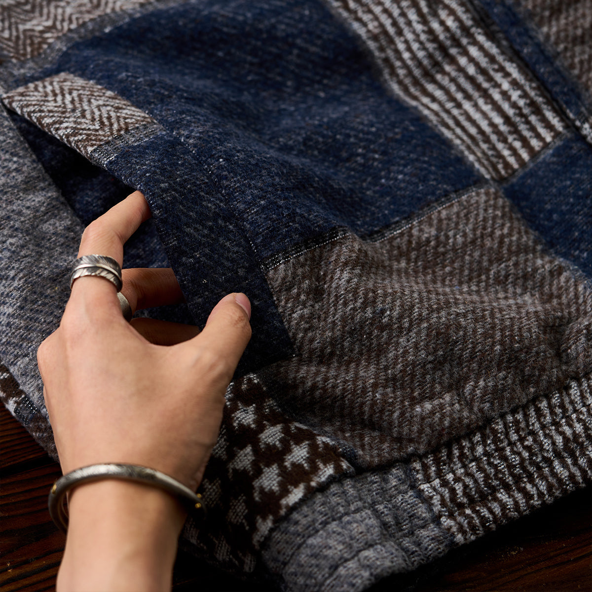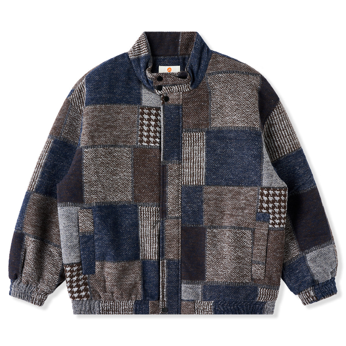 다양한 직조 패턴의 패치워크가 돋보이는 보로 스타일 스탠드 칼라 패딩 자켓으로, 보온성과 빈티지 감성을 동시에 제공합니다.