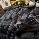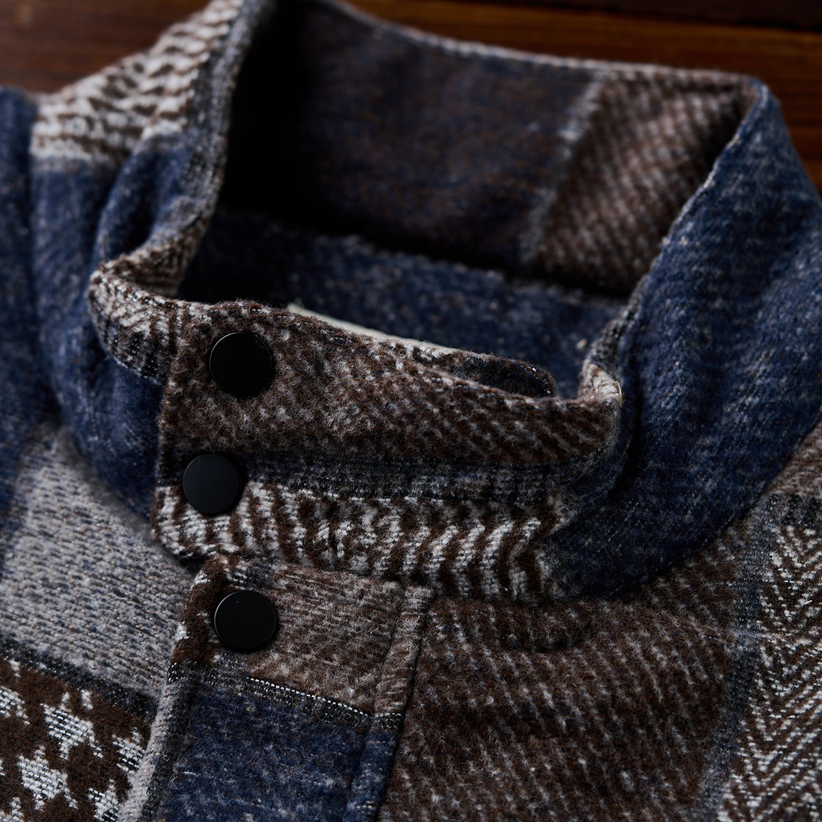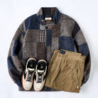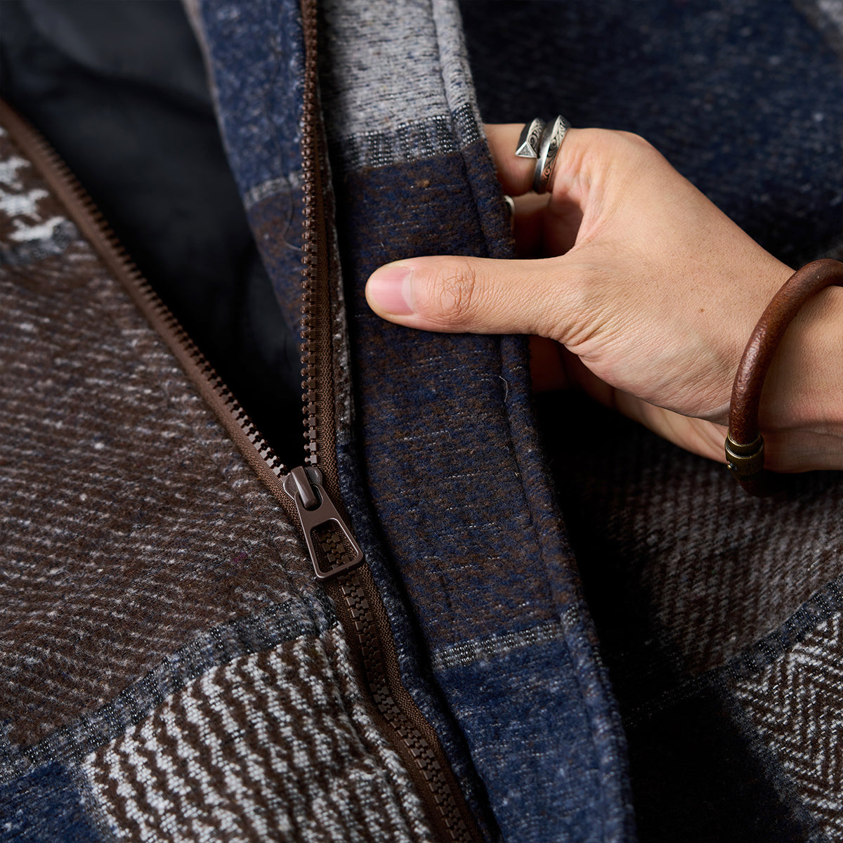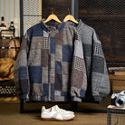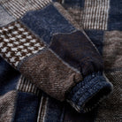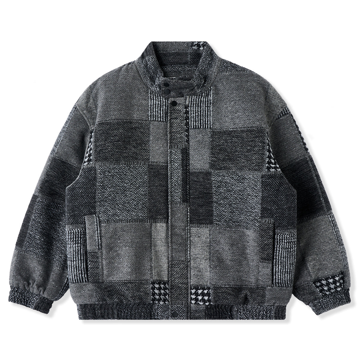 다양한 직조 패턴의 패치워크가 돋보이는 보로 스타일 스탠드 칼라 패딩 자켓으로, 보온성과 빈티지 감성을 동시에 제공합니다.