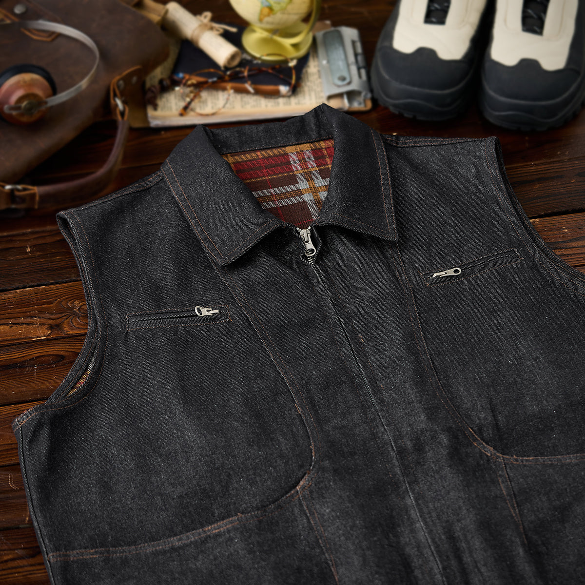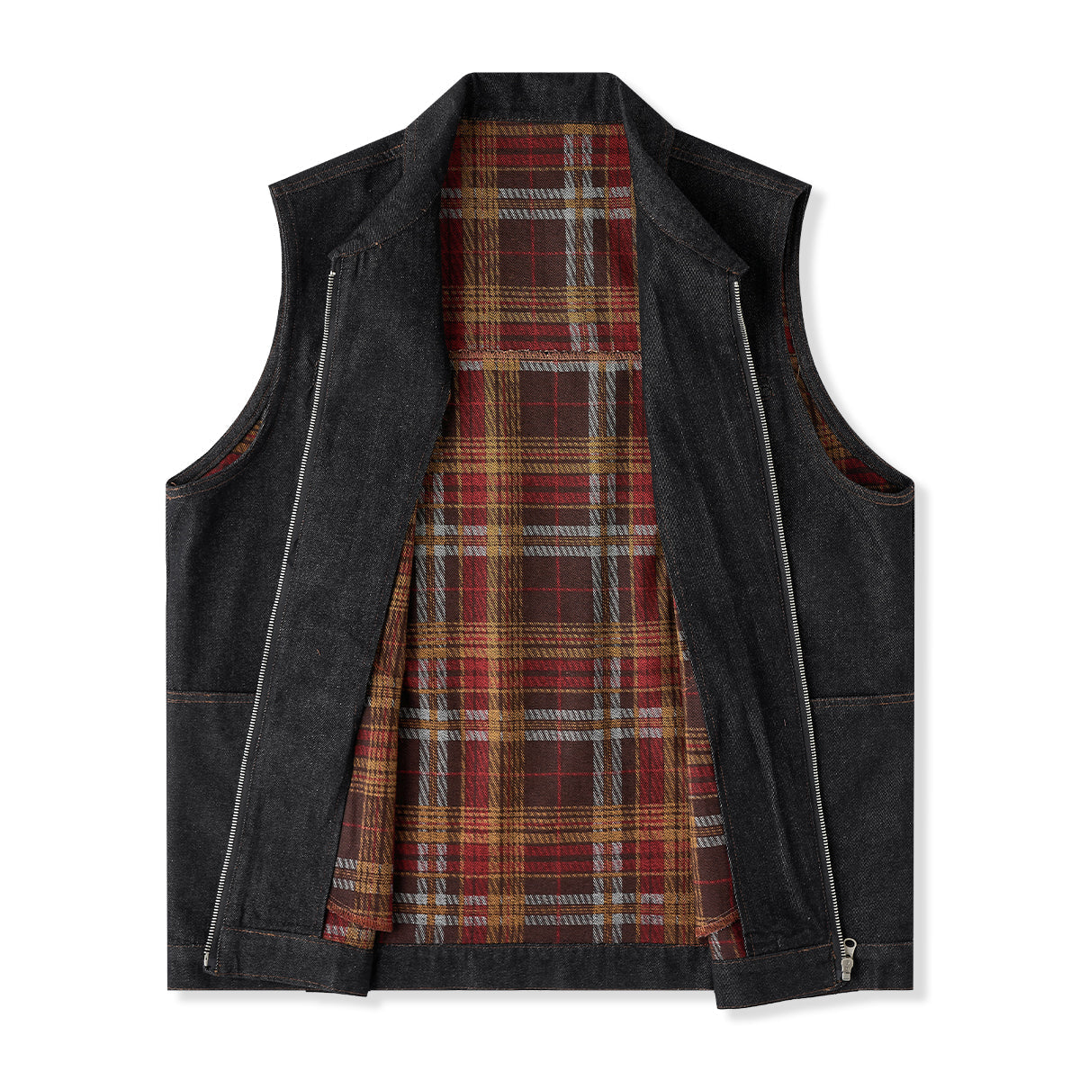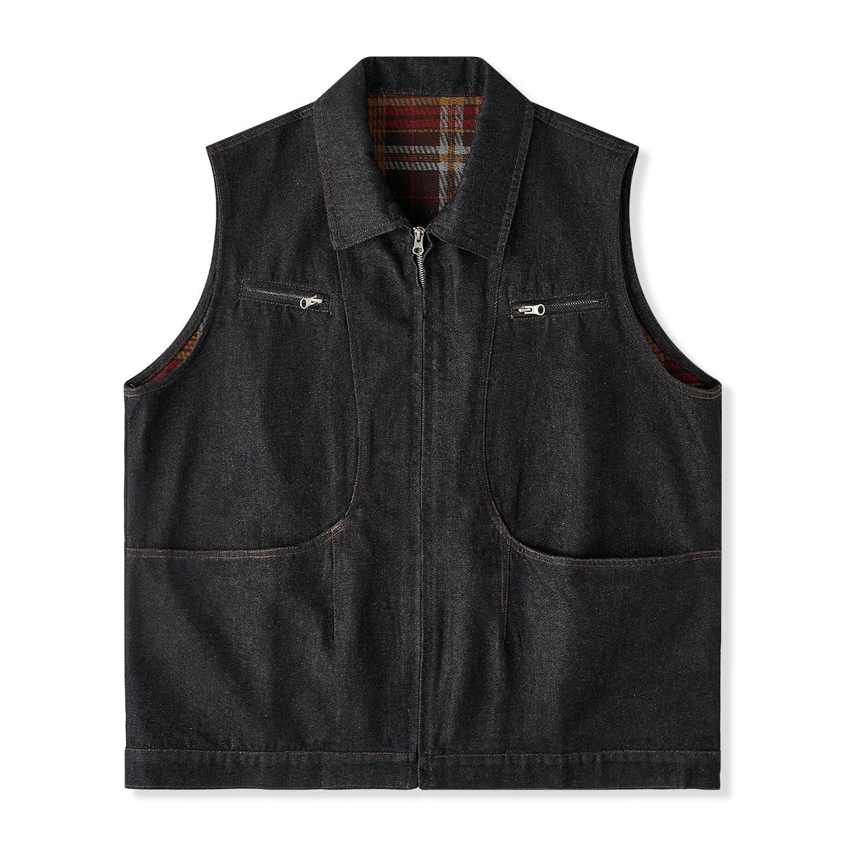 안쪽 체크 무늬 멀티 포켓 워싱 가공 데님 베스트