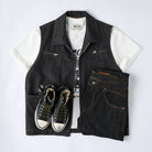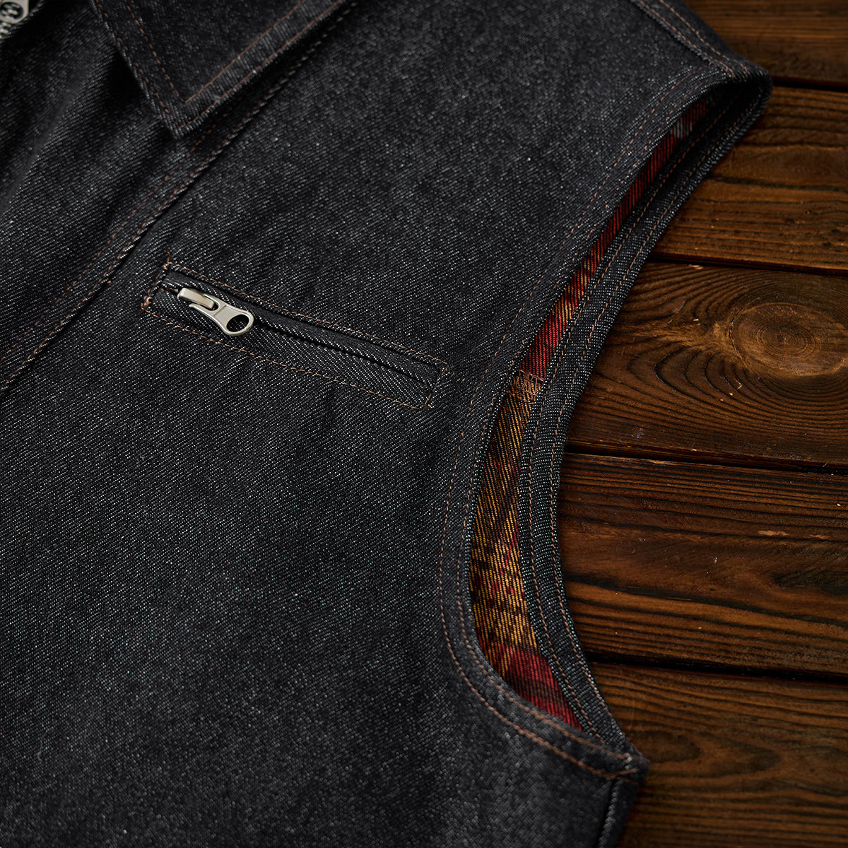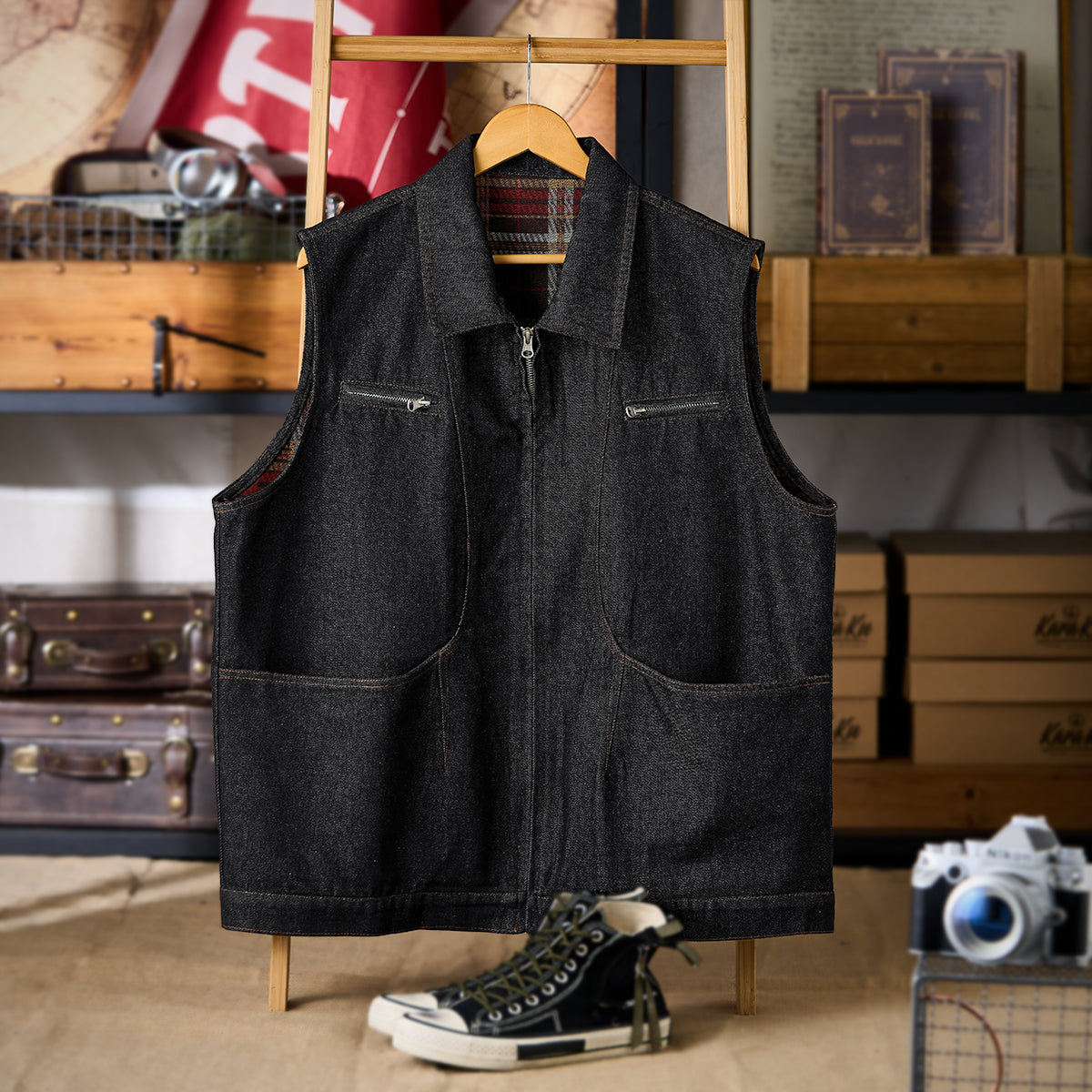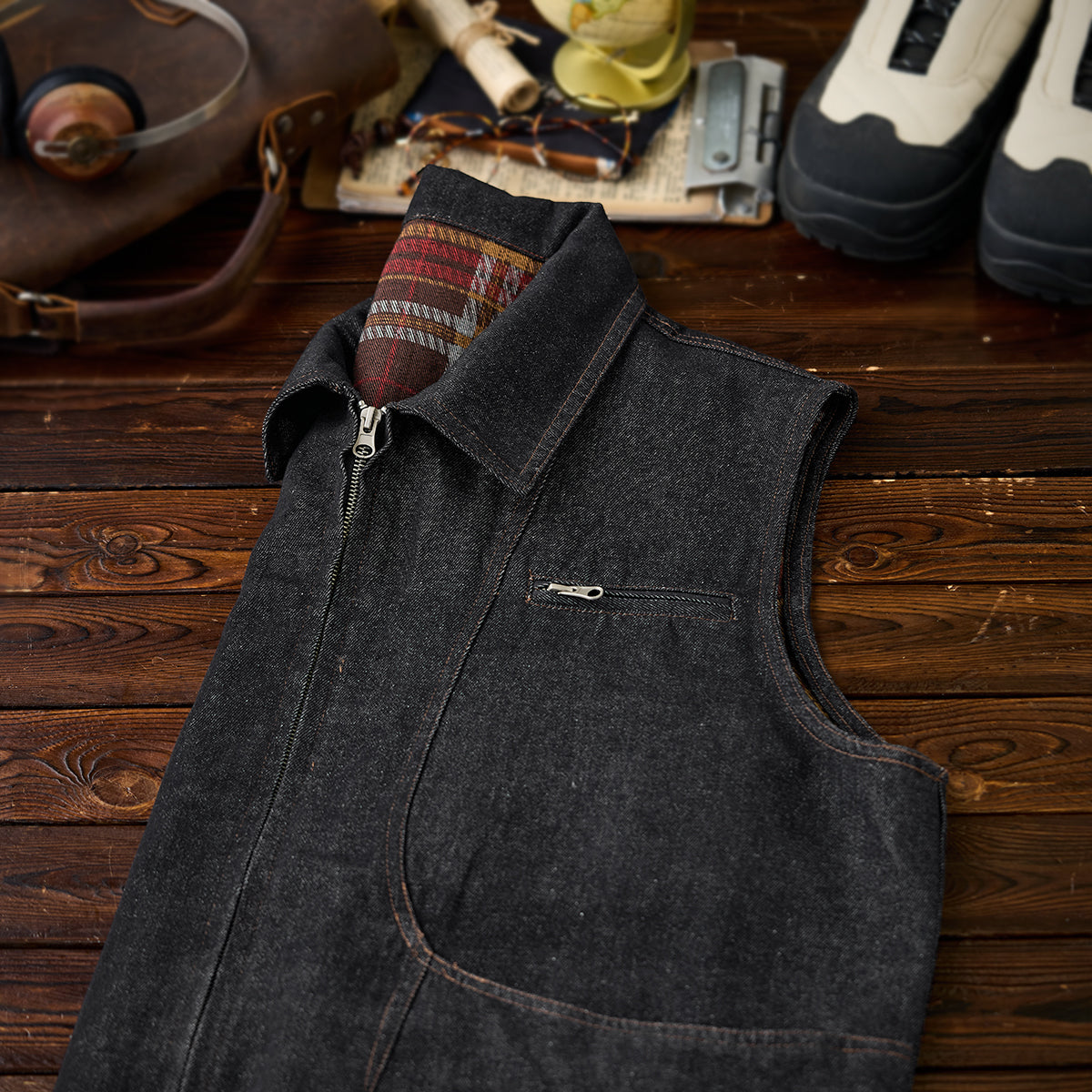 안쪽 체크 무늬 멀티 포켓 워싱 가공 데님 베스트