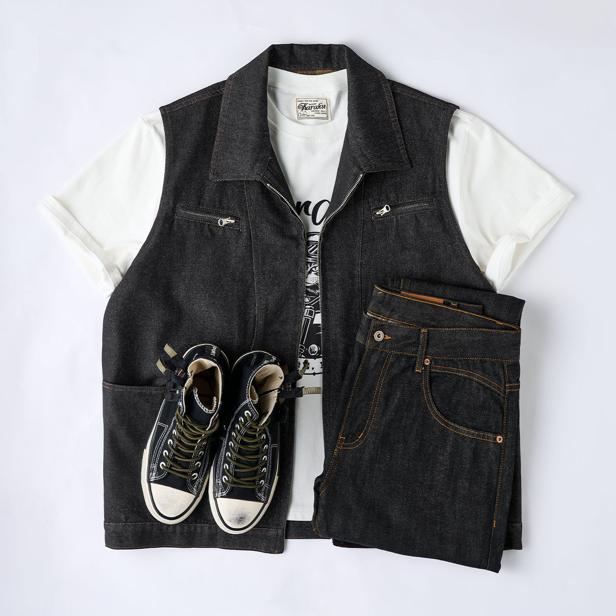 적당히 색이 바랜 데님 원단과 체크 안감, 멀티 포켓 디테일로 편안하면서도 실용적인 데님 베스트입니다. 셔츠나 티셔츠 위에 가볍게 걸치기만 해도 입체감과 존재감을 더해줍니다.