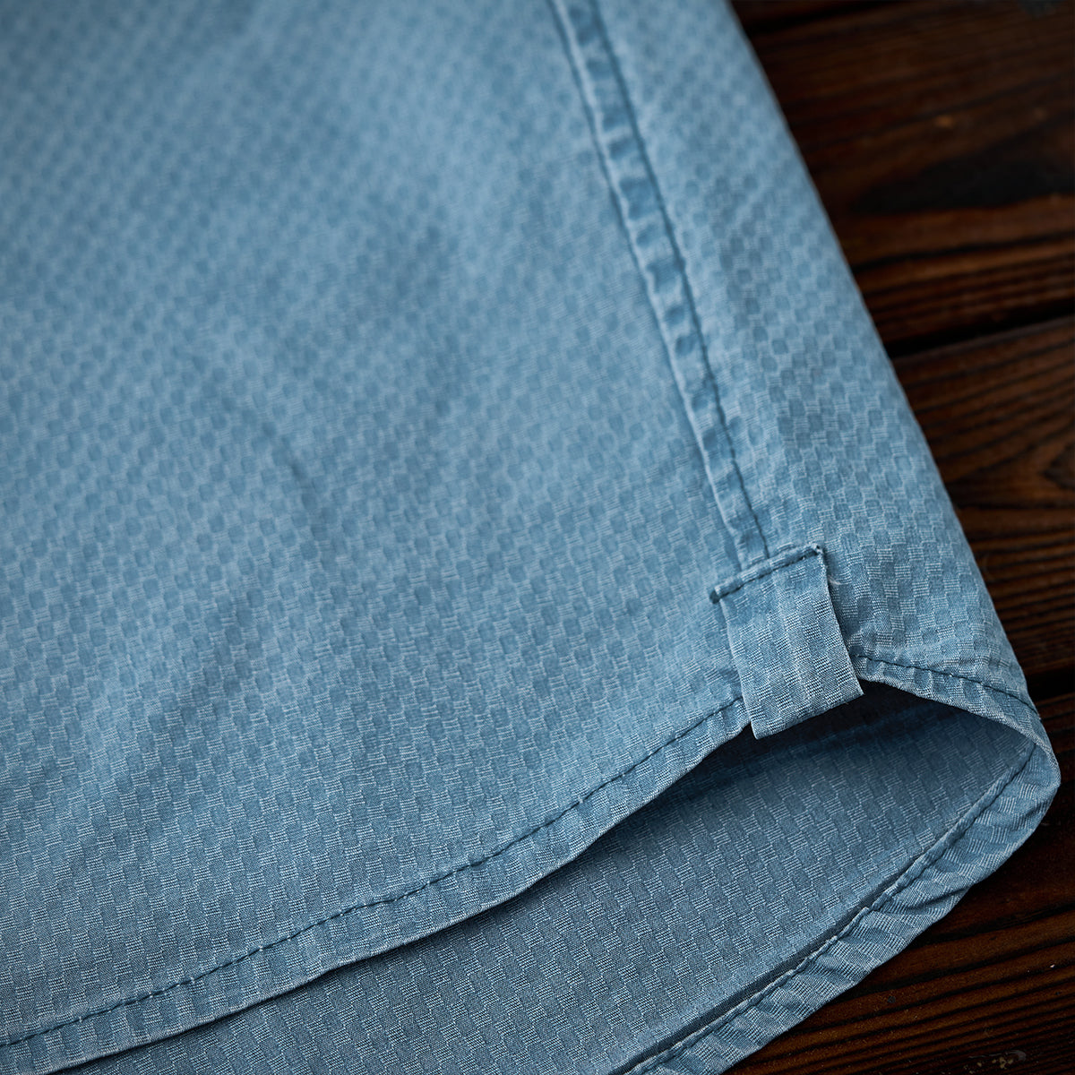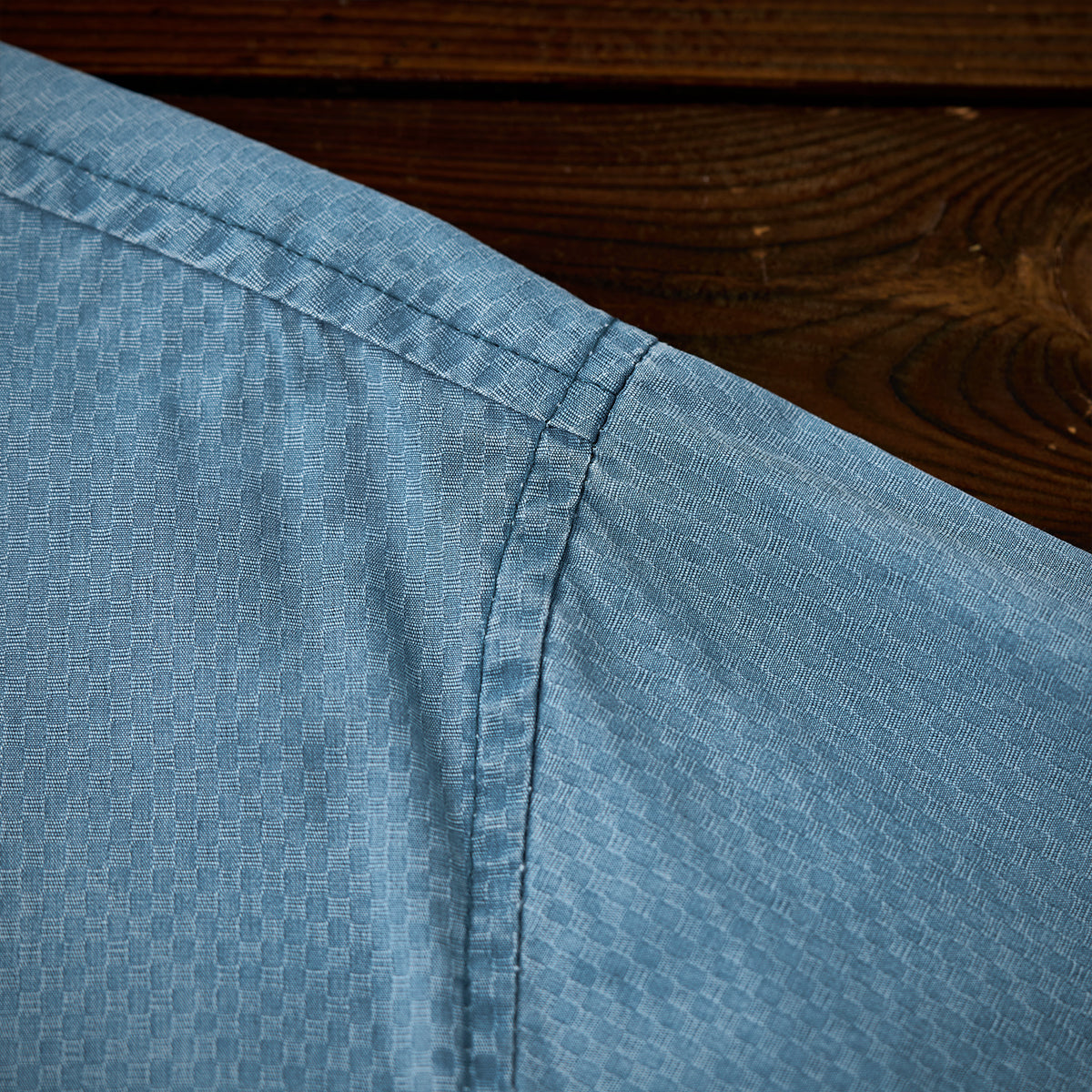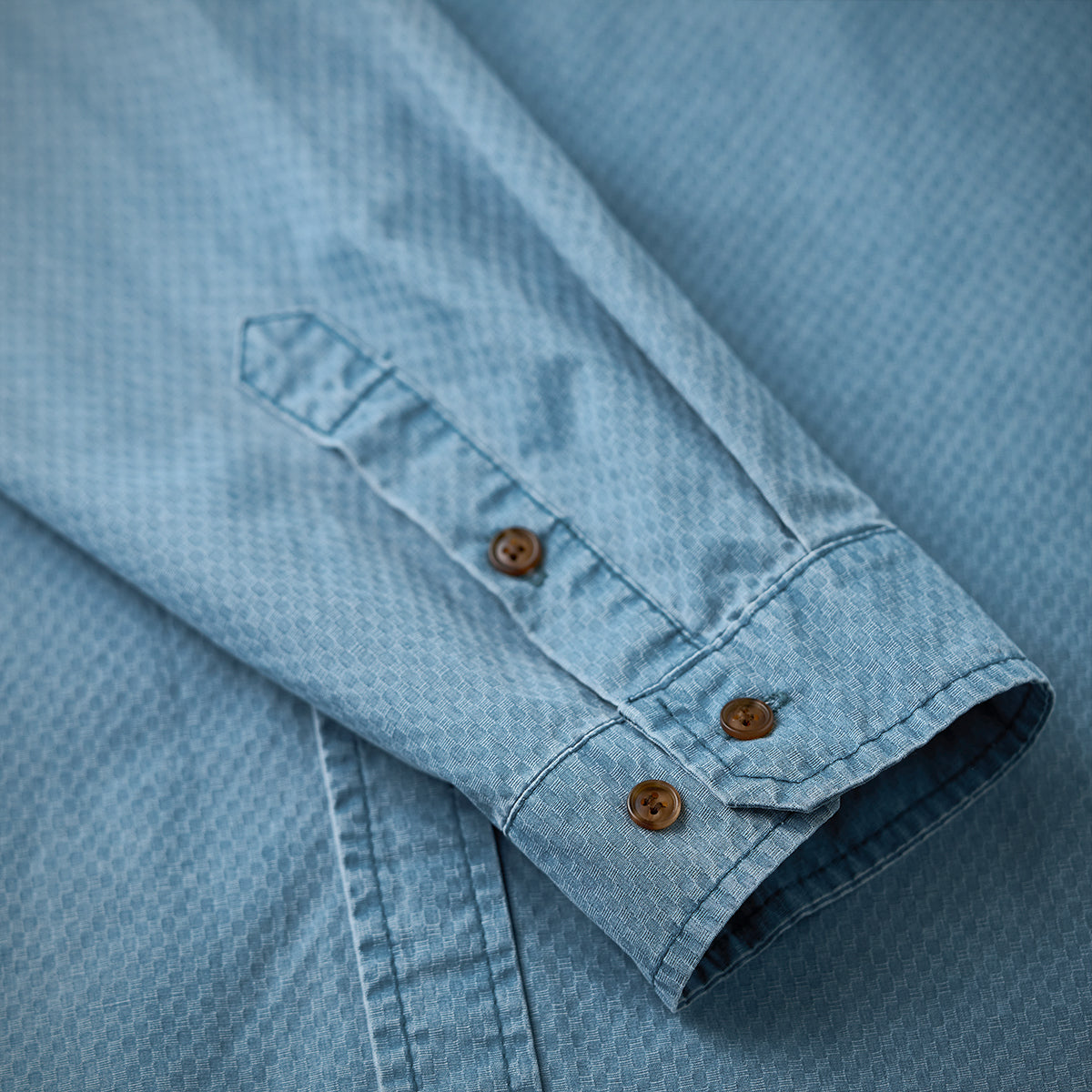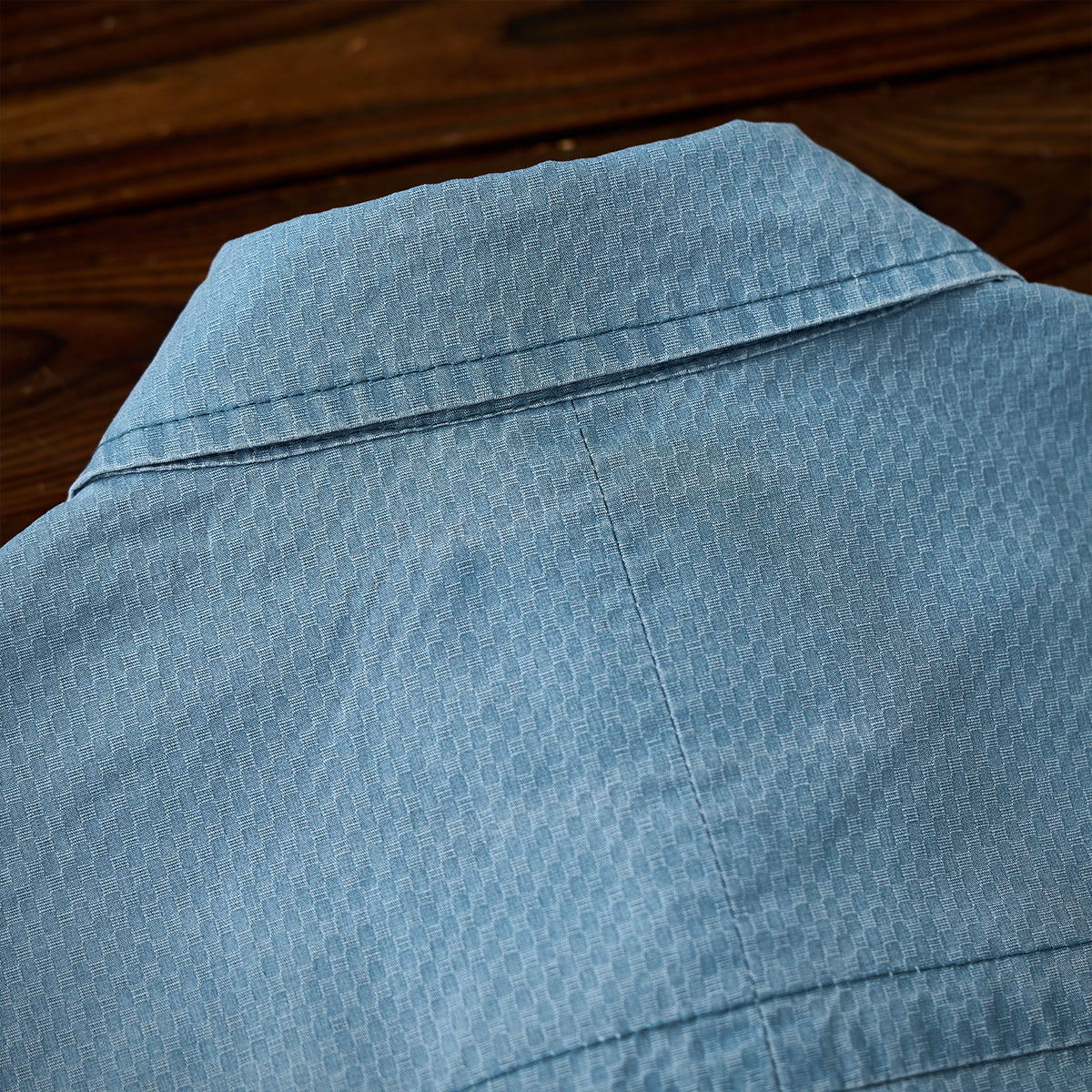 셔츠 전체에 적용된 자카드 직조의 미세 기하학 패턴이 고급스러움과 독특한 매력을 더합니다.
