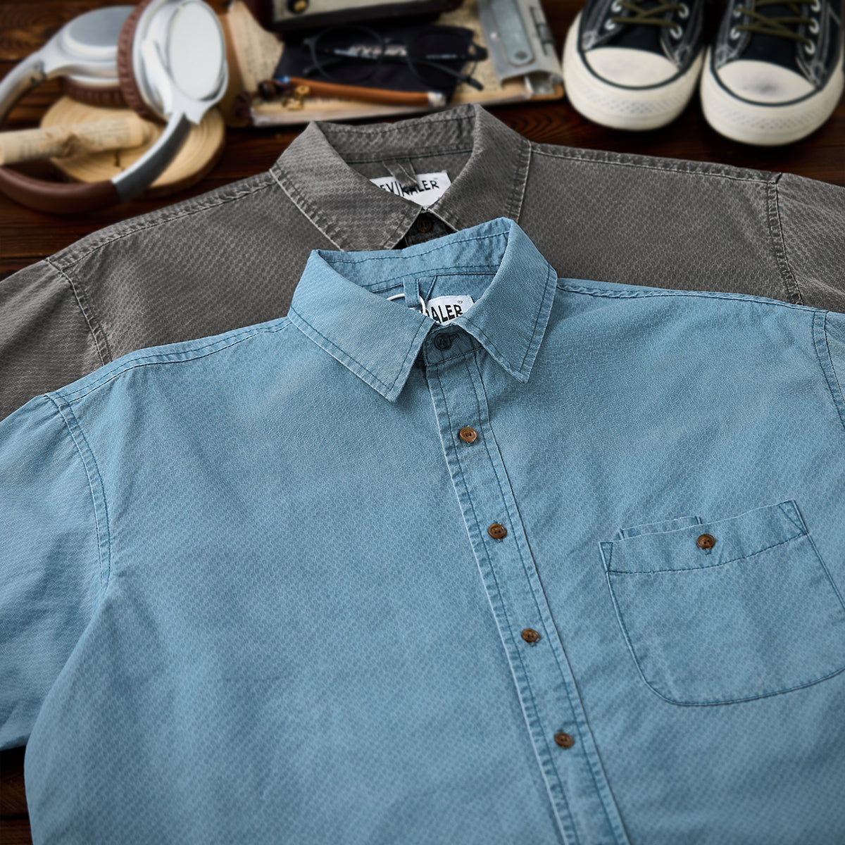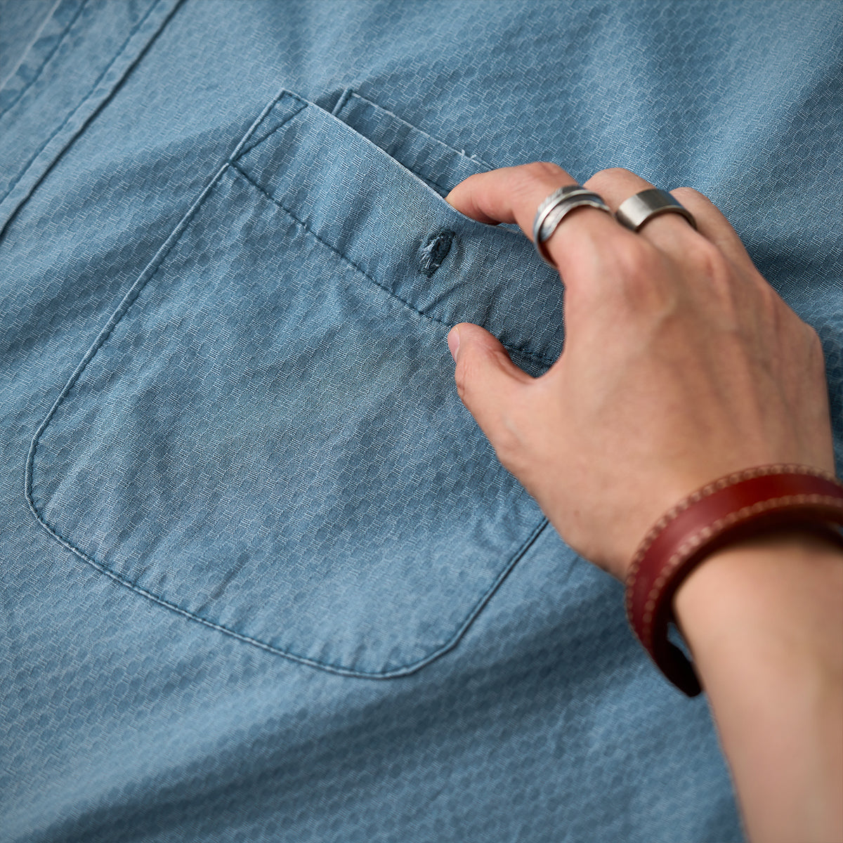 자카드 직조의 기하학 패턴과 우드 버튼 디테일로 고급스러운 무드를 살린 셔츠로, 여유 있는 실루엣과 포켓이 실용성과 편안함을 더한 캐주얼 아이템입니다.