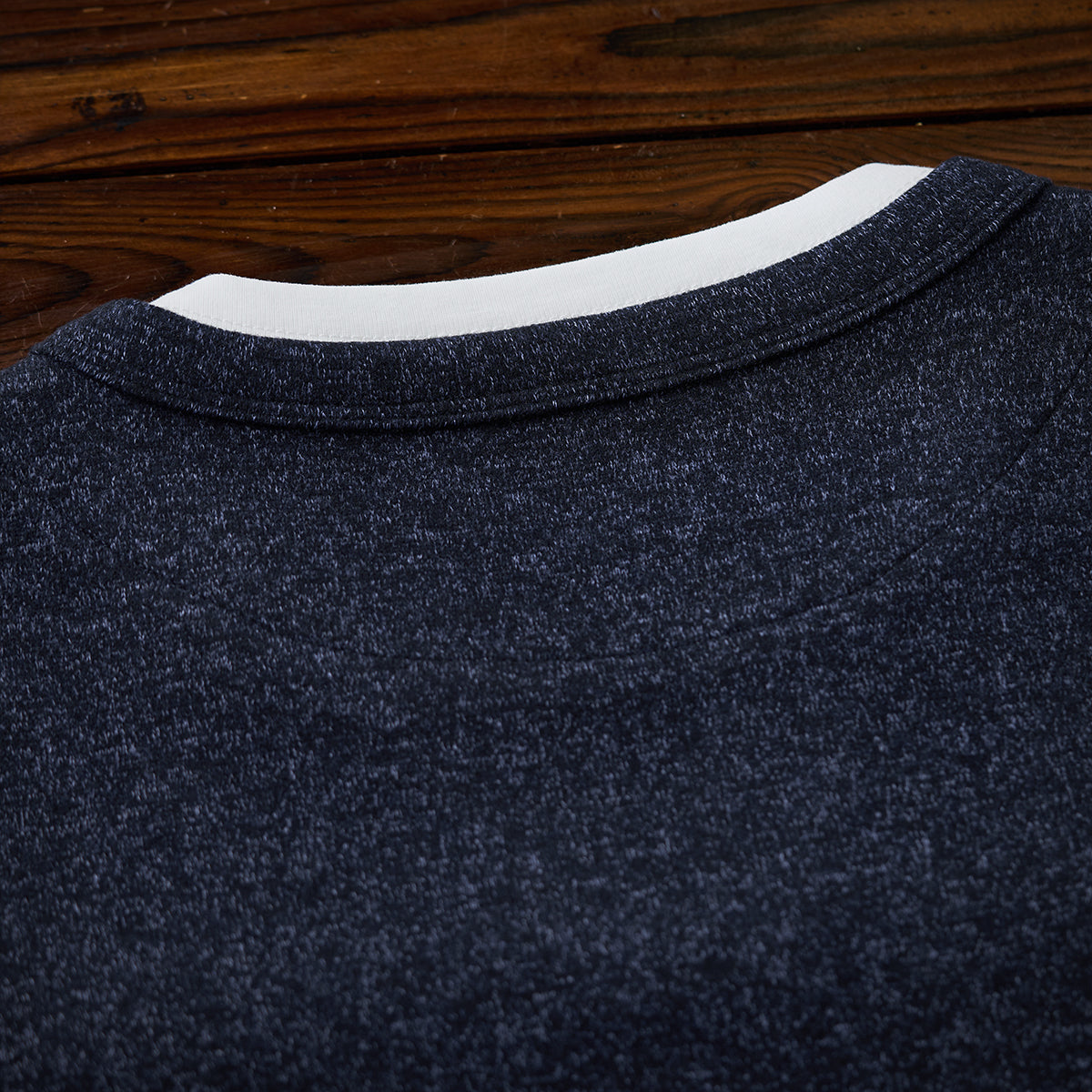 V넥 × 크루넥 페이크 레이어드 디자인 멜란지 스웨트셔츠로, 한 벌만으로 레이어드룩을 연출하며 자연스러운 깊이 있는 스타일을 완성합니다.