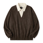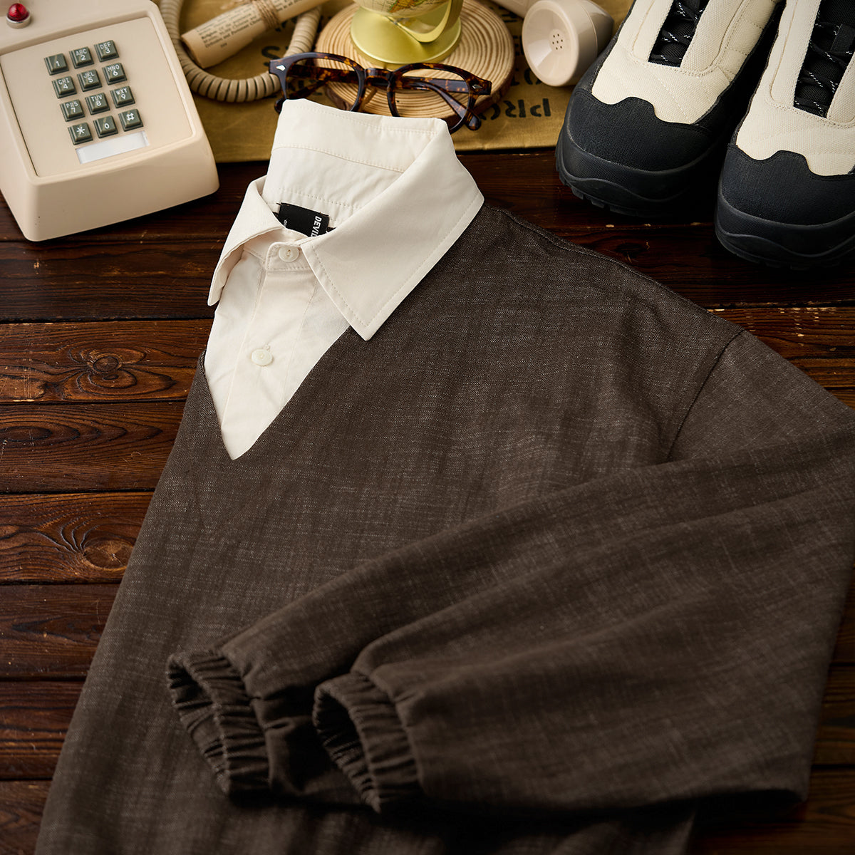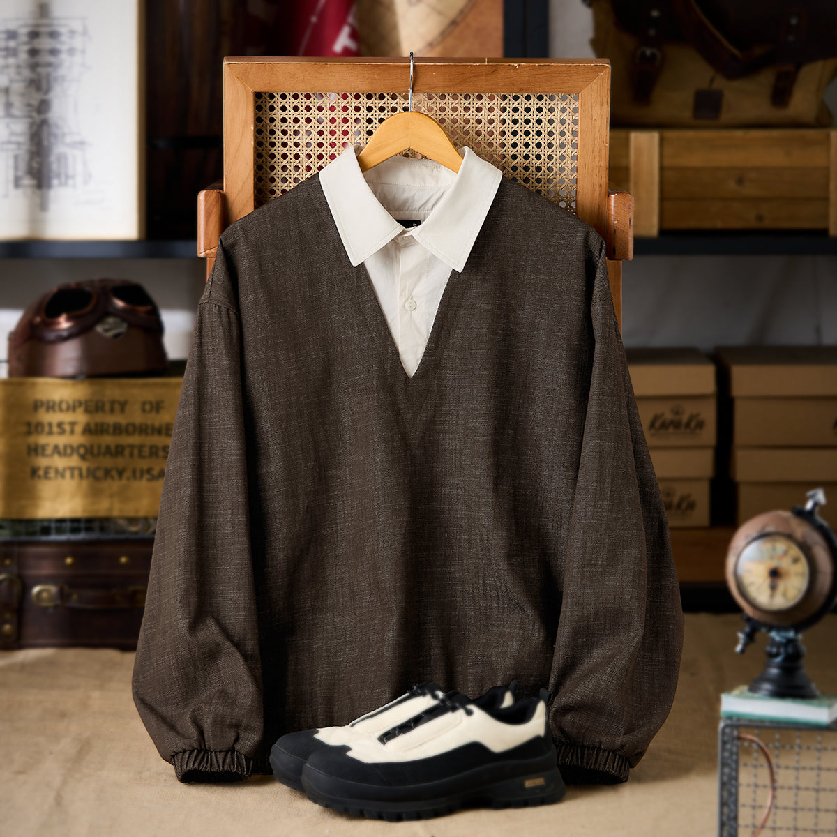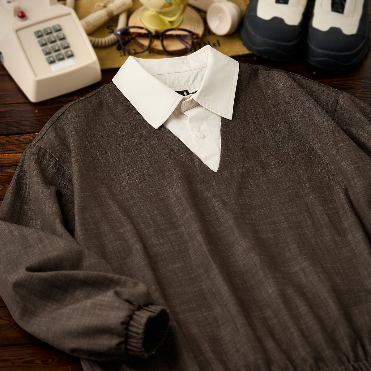 셔츠를 겹쳐 입은 듯한 페이크 레이어드 V넥 풀오버 스웨트로, 심플하면서도 입체감 있는 디자인과 부드러운 소재로 편안하게 착용할 수 있습니다.