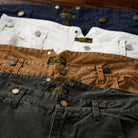 12oz 두꺼운 캔버스 원단의 스트레이트 와이드 워크 팬츠로, 허리 7개의 합금 버튼과 황동 파리스 버클, 서스펜더 장착 가능, YKK 지퍼와 사이드 툴 포켓·툴 루프 등 실용성을 갖춘 클래식 워크 팬츠입니다.