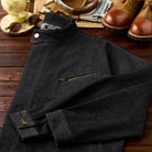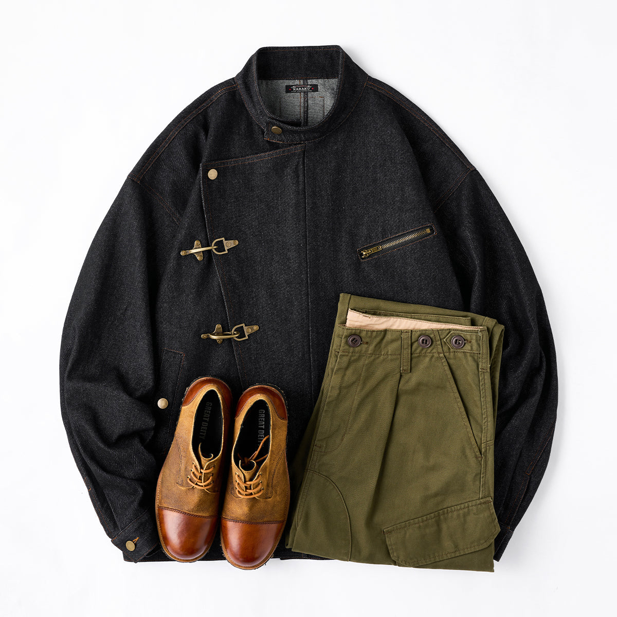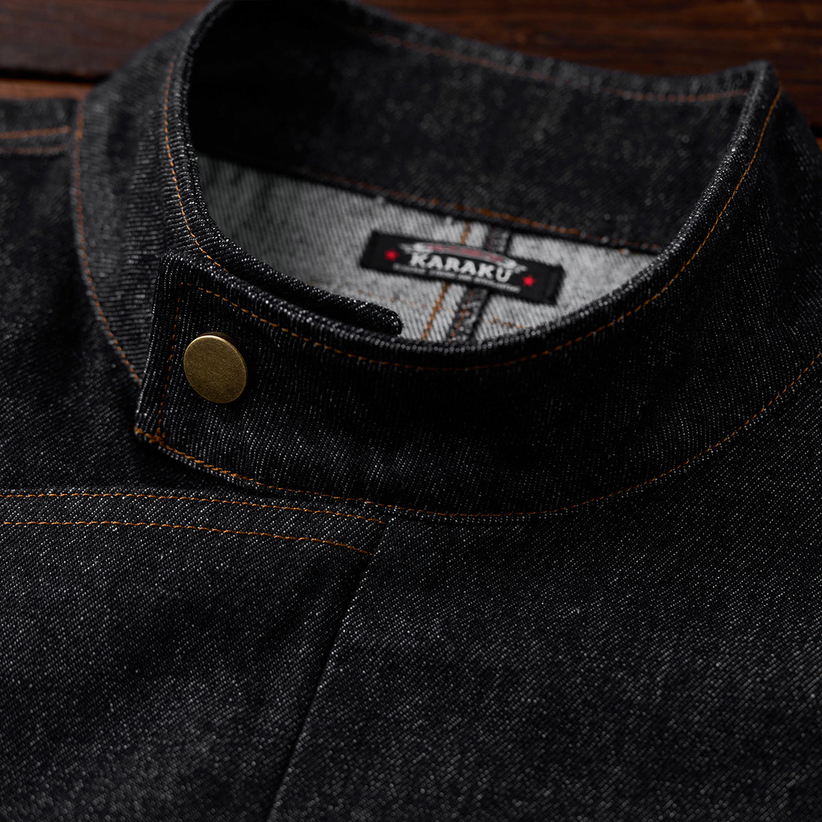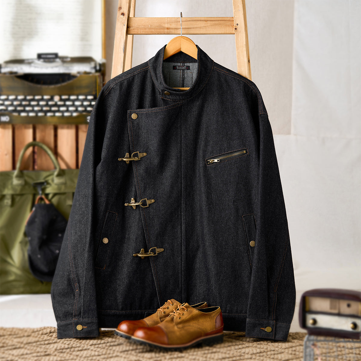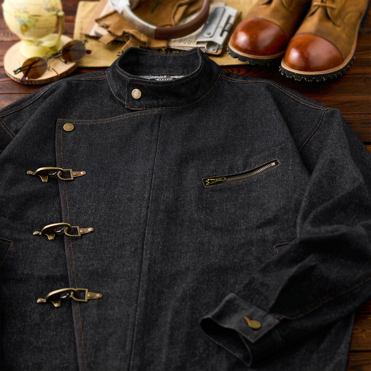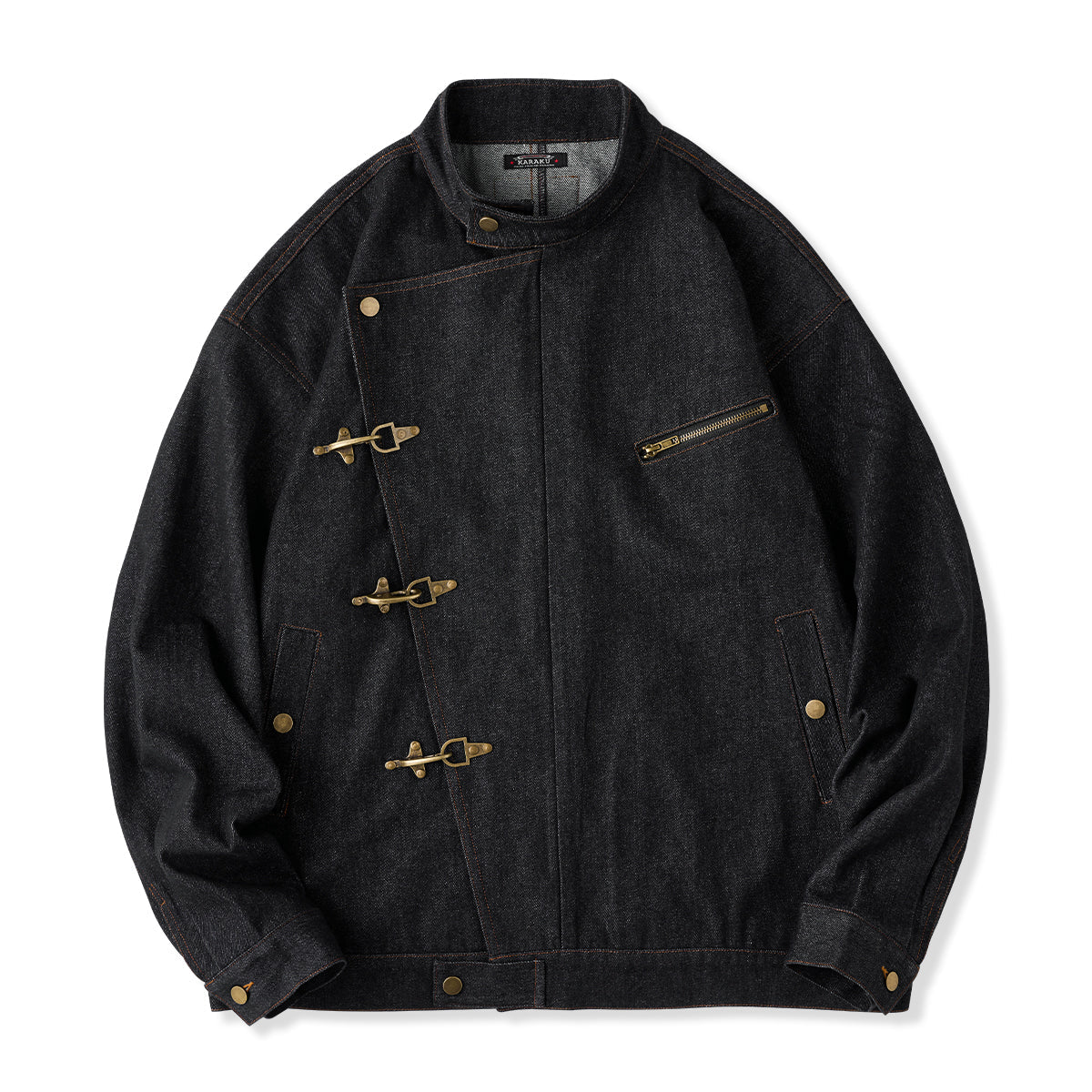 【사전예약】후크 버튼 여밈 사선 플래킷 스탠드 칼라 데님 자켓