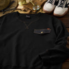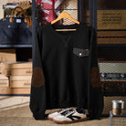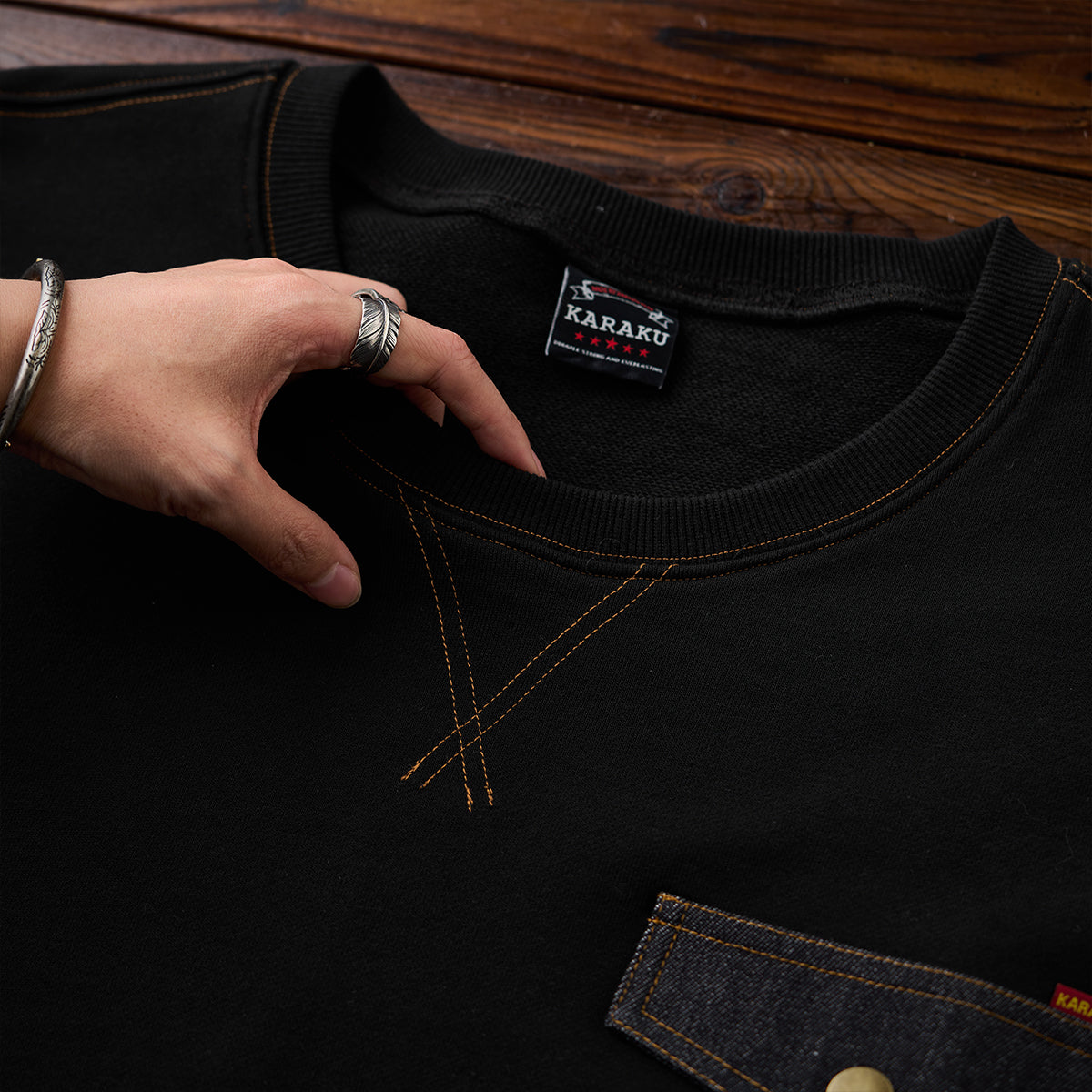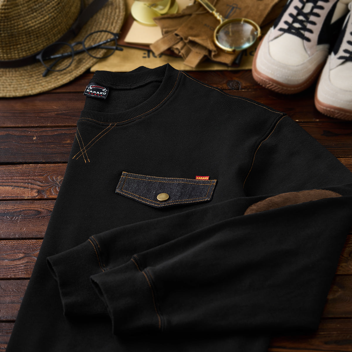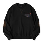 【사전예약】데님 소재 배색 장식 포켓 & 팔꿈치 패치 안감 파일 스웨트셔츠
