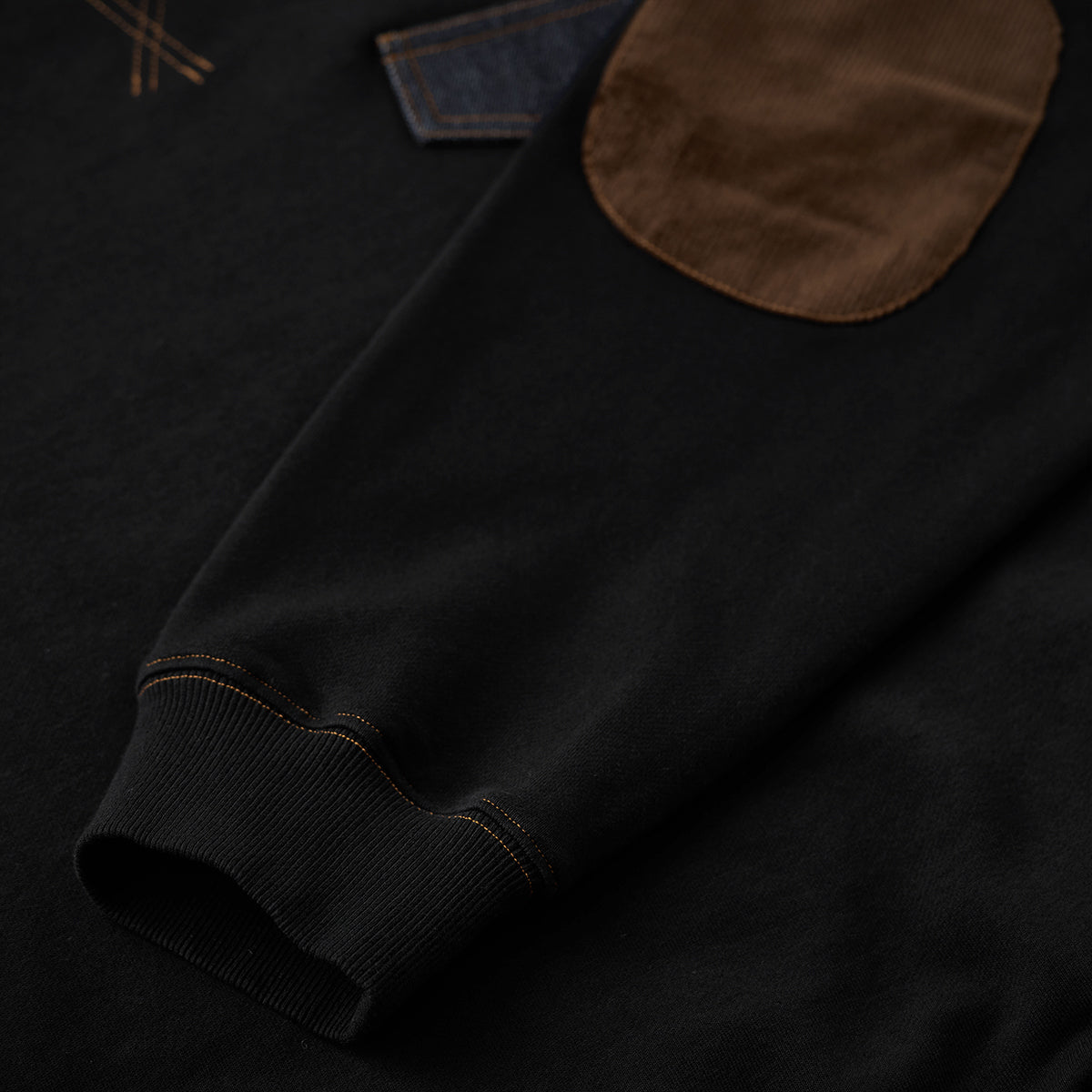 목 ‘X’형 스티치와 브라운 스티치 포인트로 블랙 베이스 디자인에 생동감을 더한 스웨트셔츠입니다. 팔꿈치 코듀로이 패치와 리브 소매 끝단이 보온성과 착용감을 높여줍니다.