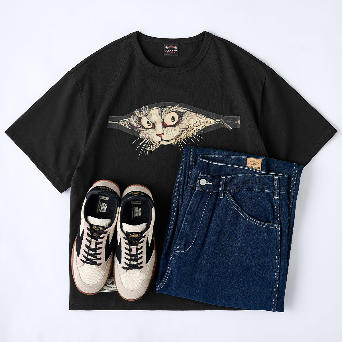 앞면 지퍼 틈새로 요괴 고양이(바케네코, 化け猫)가 엿보이는 유니크한 티셔츠로, 모노톤 베이스가 요괴 고양이의 존재감을 더하고, 전통 우키요에 표현에 현대적 감각을 더했습니다.