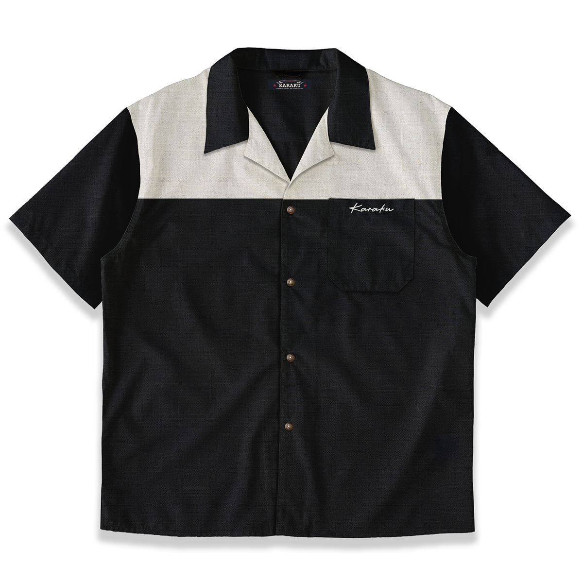 【사전예약】「Karaku」자수 배색 페이크 린넨 오픈 카라 셔츠