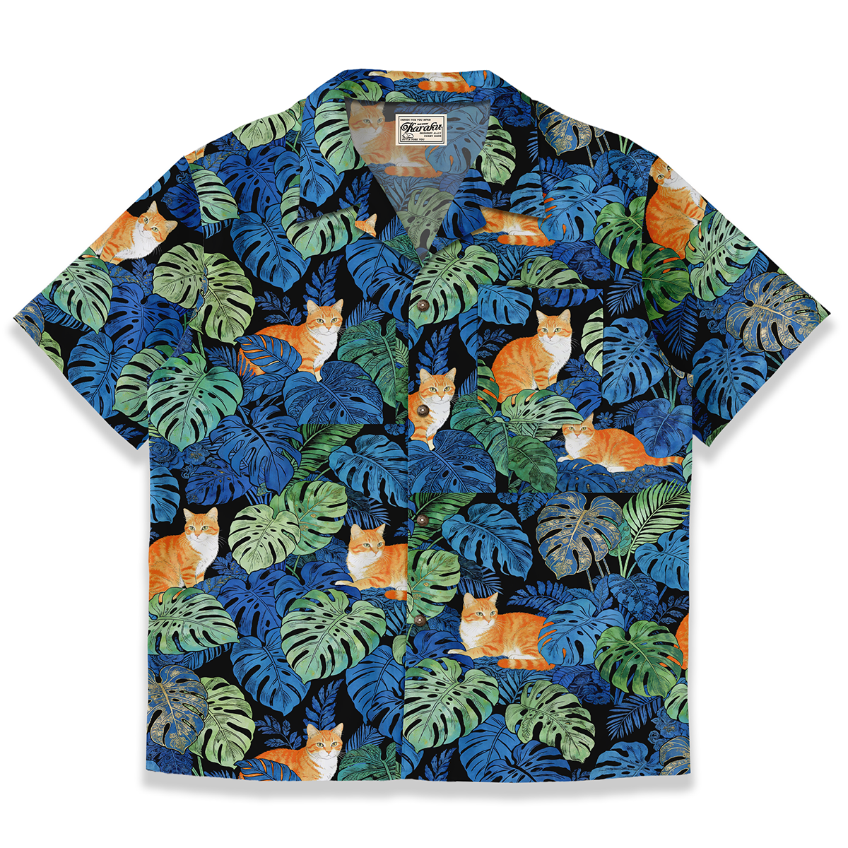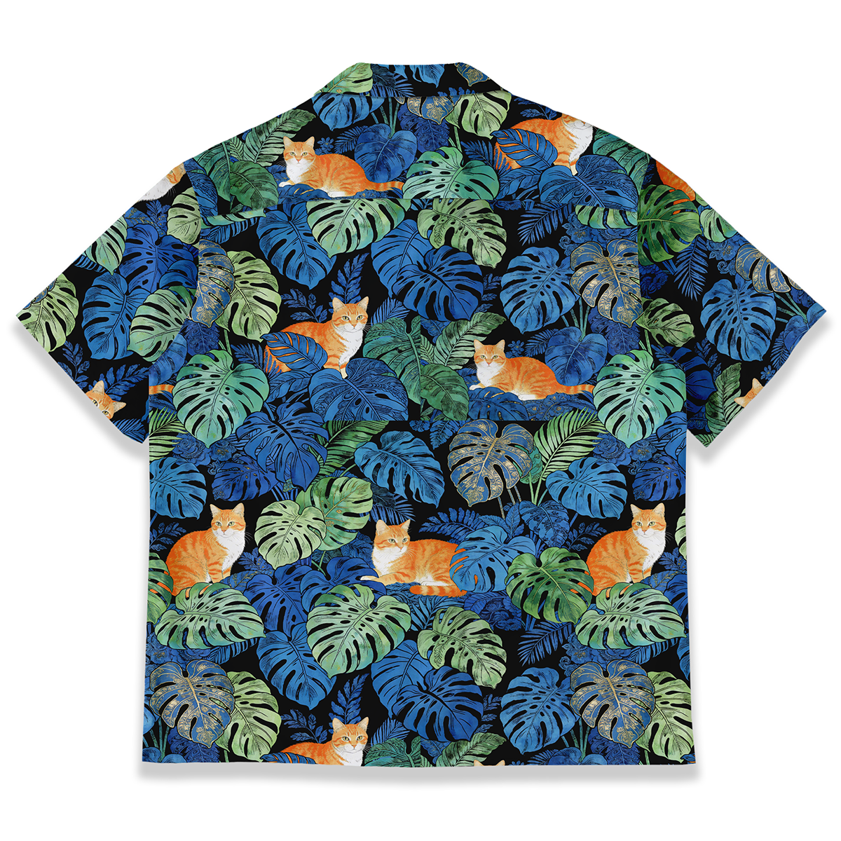 몬스테라와 치즈태비 고양이 패턴이 돋보이는 전면 프린트 알로하 셔츠입니다. 리조트는 물론 일상에서도 부담 없이 착용하기 좋습니다.