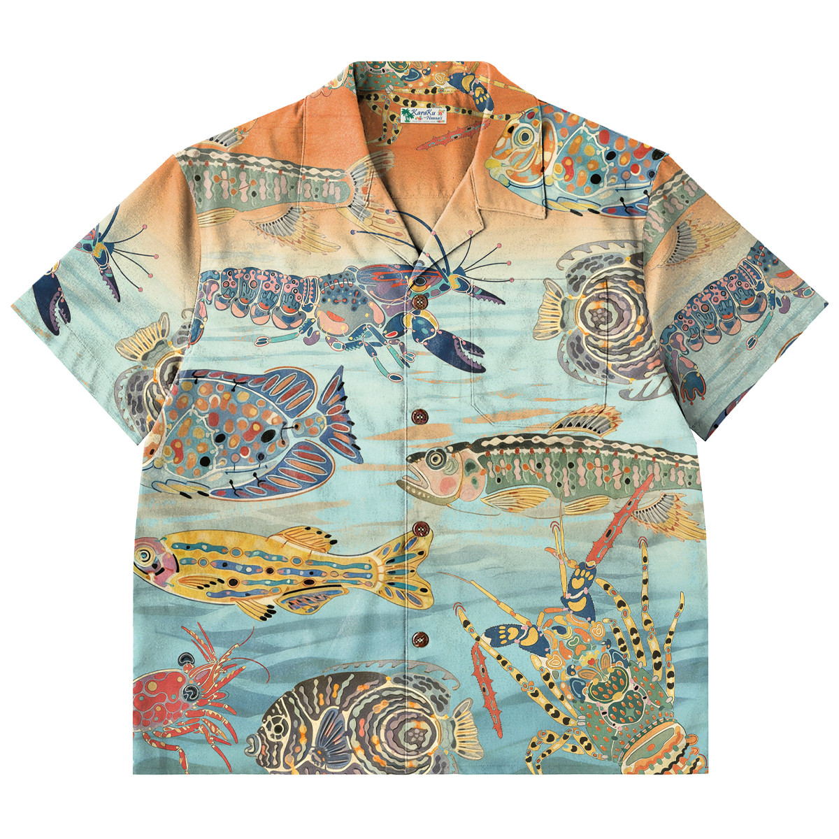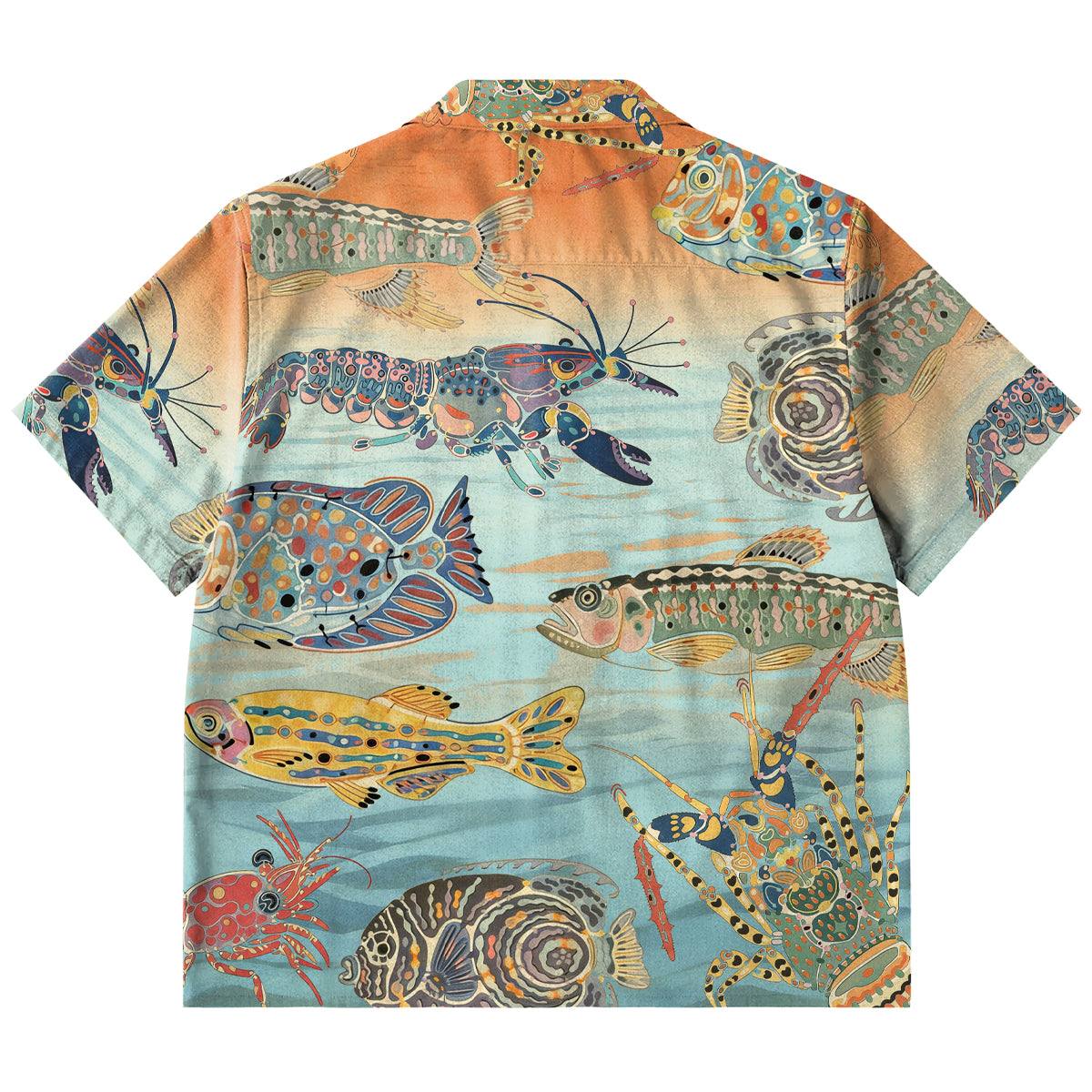 물고기와 새우가 셔츠 전체를 가득 채워, 바다의 고요함과 석양의 따스함을 전합니다.