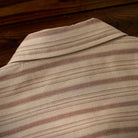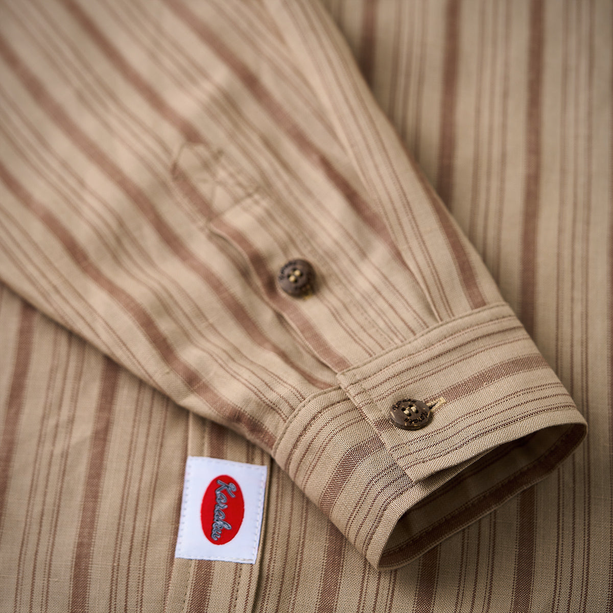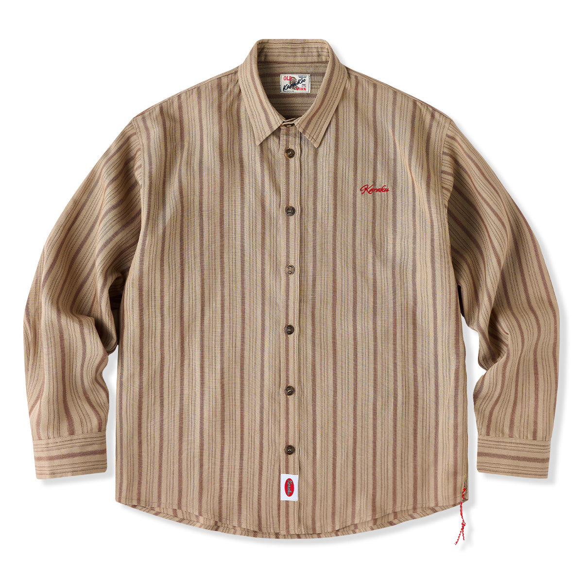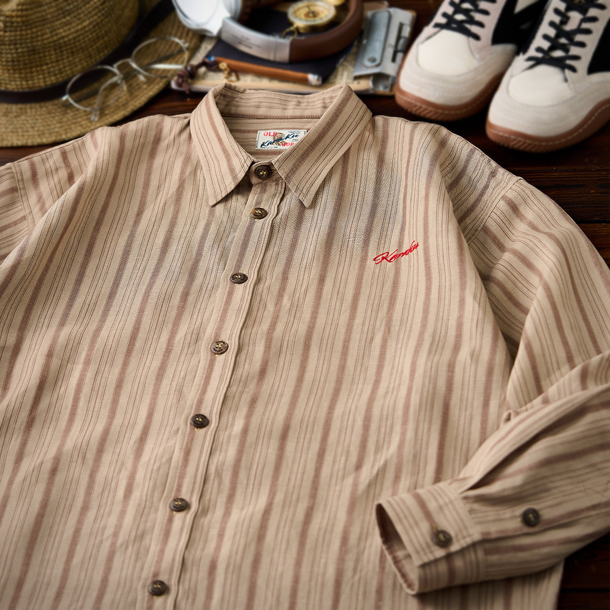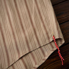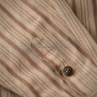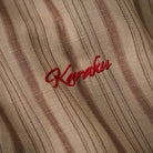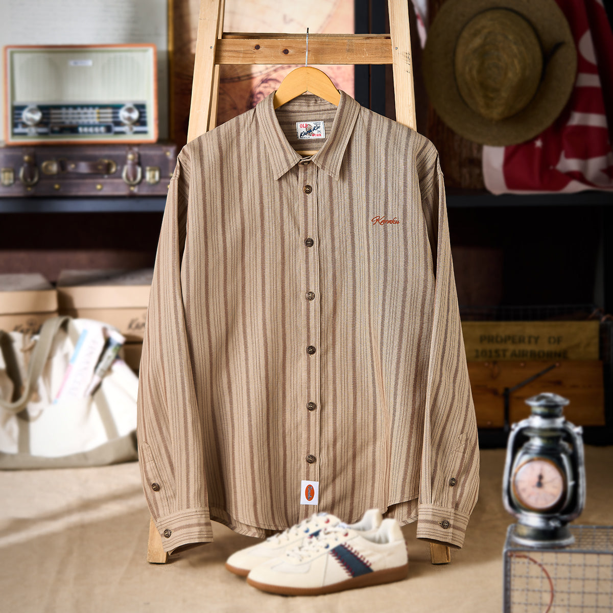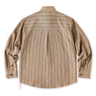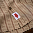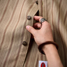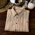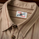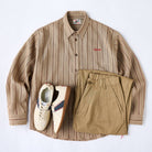 카키 계열을 베이스로 한 차분한 스트라이프 패턴이 특징이며, 왼쪽 가슴의 ‘STAY TRUE’ 자수 와펜과 우드 버튼이 레트로 무드를 더한 셔츠입니다.