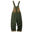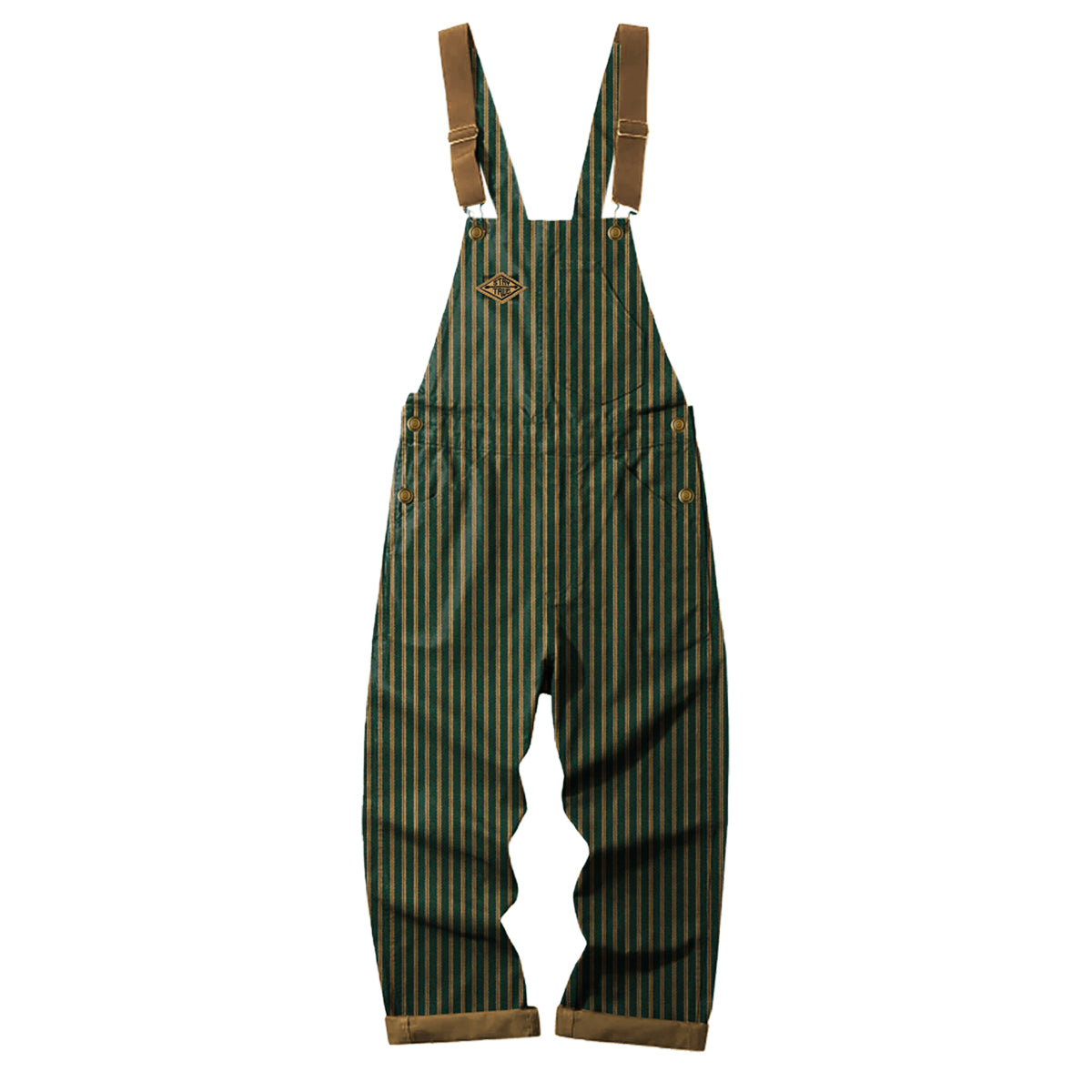스트라이프 패턴과 그린·옐로우 컬러 조합으로 캐주얼하고 친근한 분위기를 주며, 브라운 포인트와 조절 가능한 금속 장식, 다용도 포켓으로 실용성을 갖춘 오버올입니다.