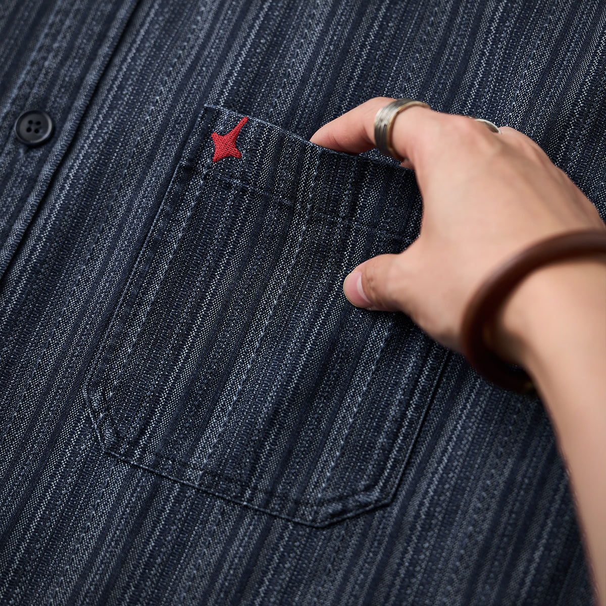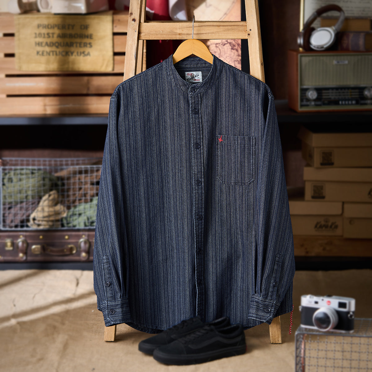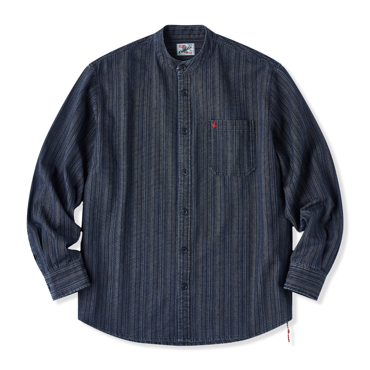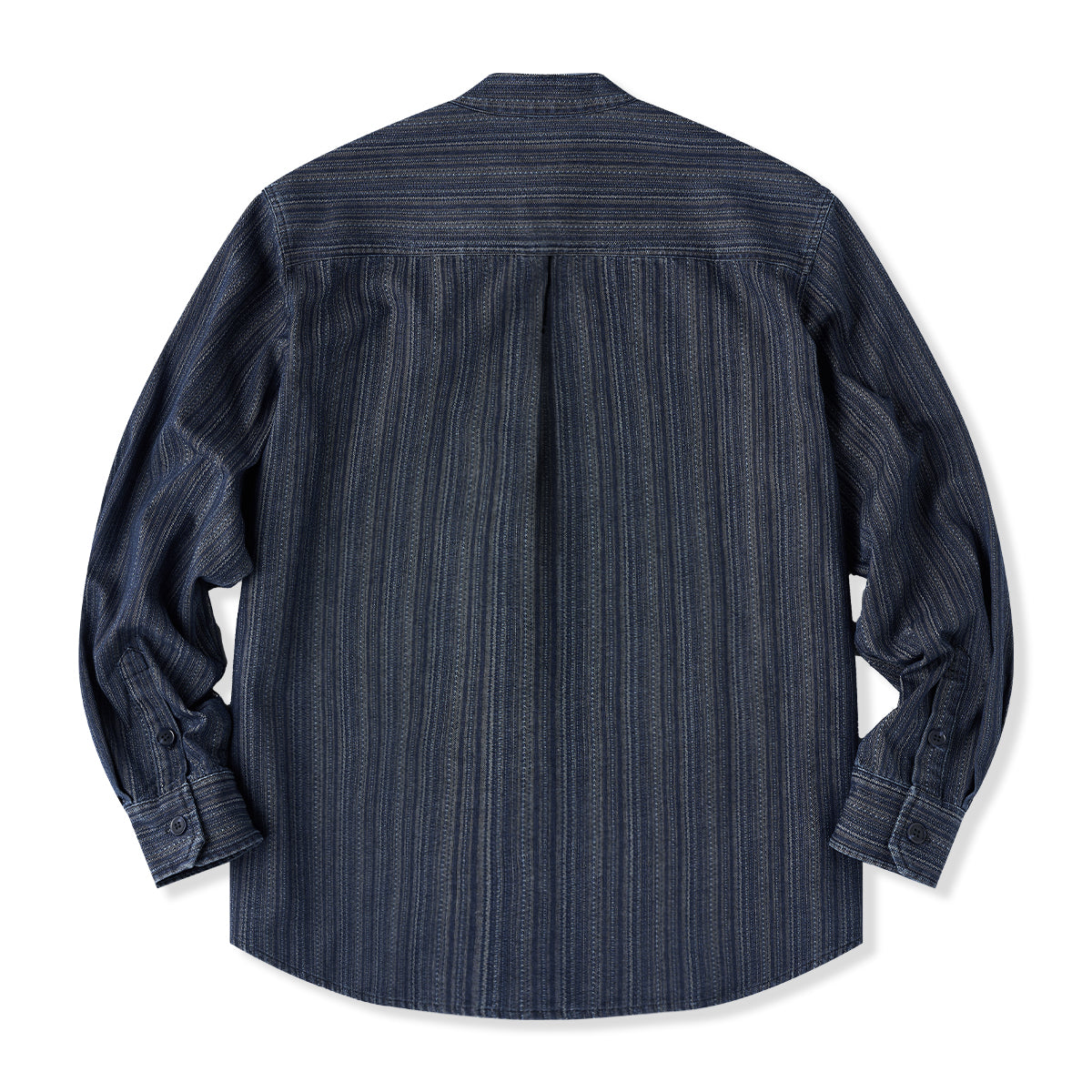 밴드 칼라와 자카드 스트라이프 패턴으로 세련된 캐주얼 무드를 살린 데님 셔츠로, 가슴의 레드 로고 포인트와 뒷면 플리츠 디테일이 활동성을 높여줍니다.