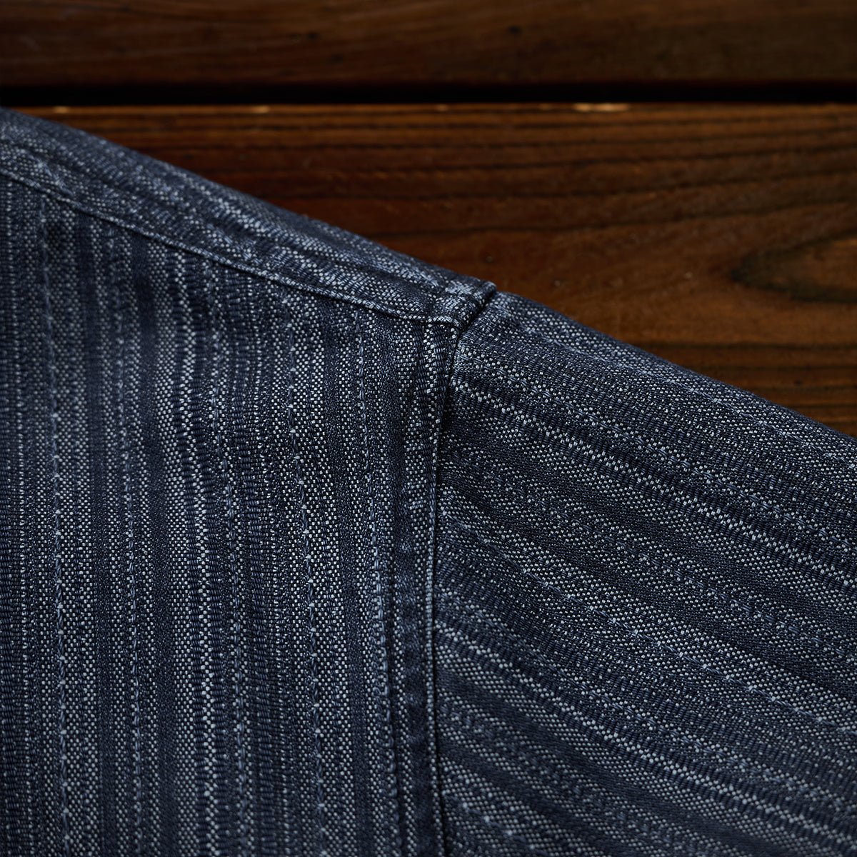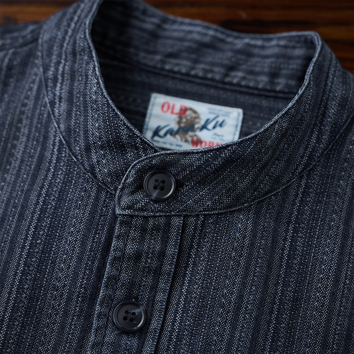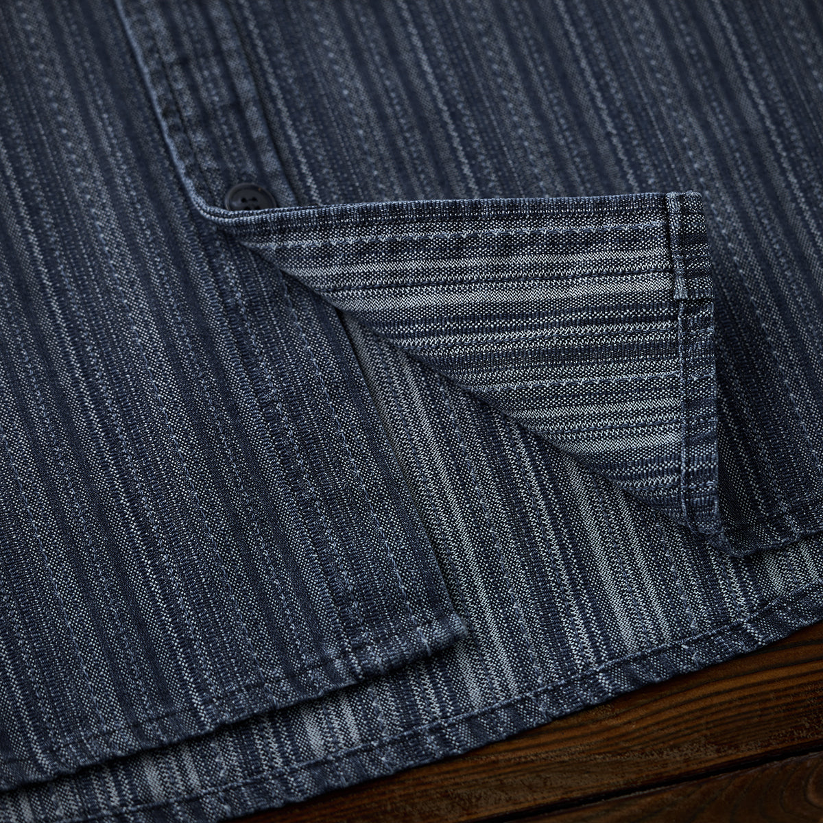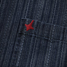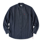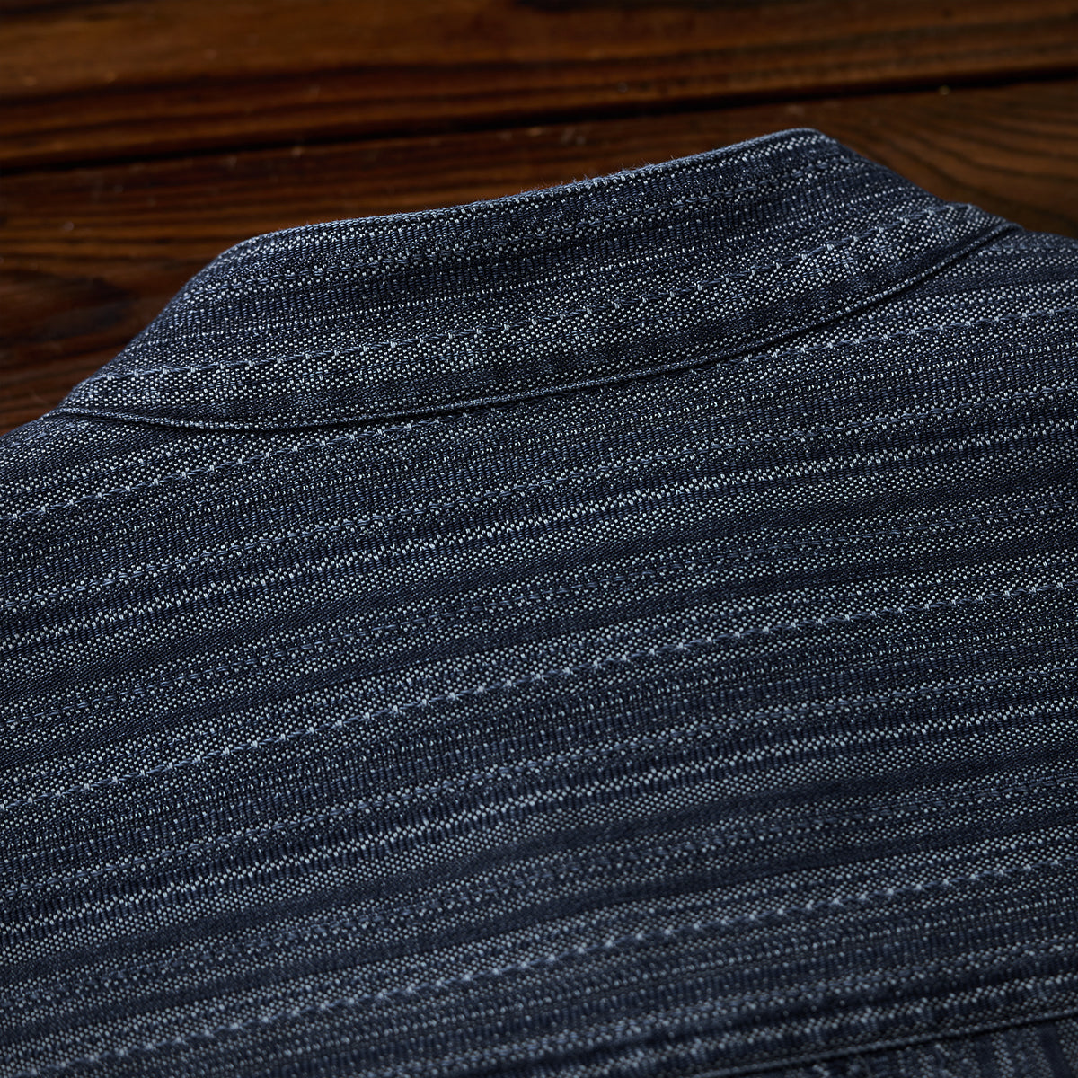 밴드 칼라와 자카드 스트라이프 패턴으로 세련된 캐주얼 무드를 살린 데님 셔츠로, 가슴의 레드 로고 포인트와 뒷면 플리츠 디테일이 활동성을 높여줍니다.