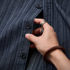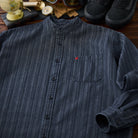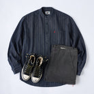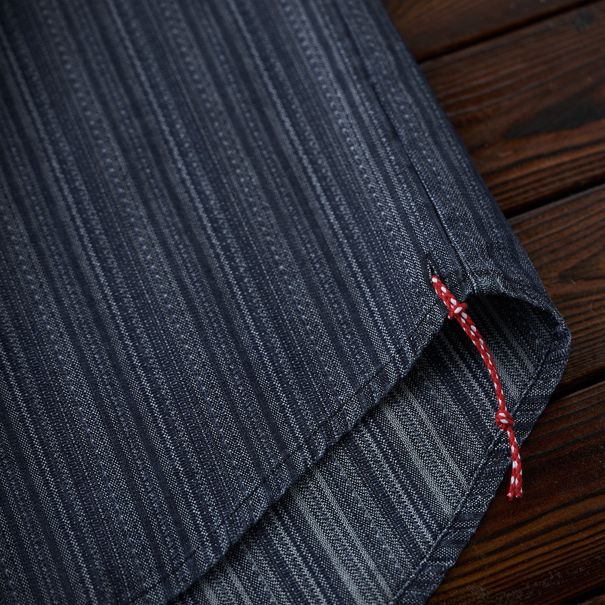 【사전예약】빨간 매듭 끈 자카드 스트라이프 면·리넨 데님 셔츠
