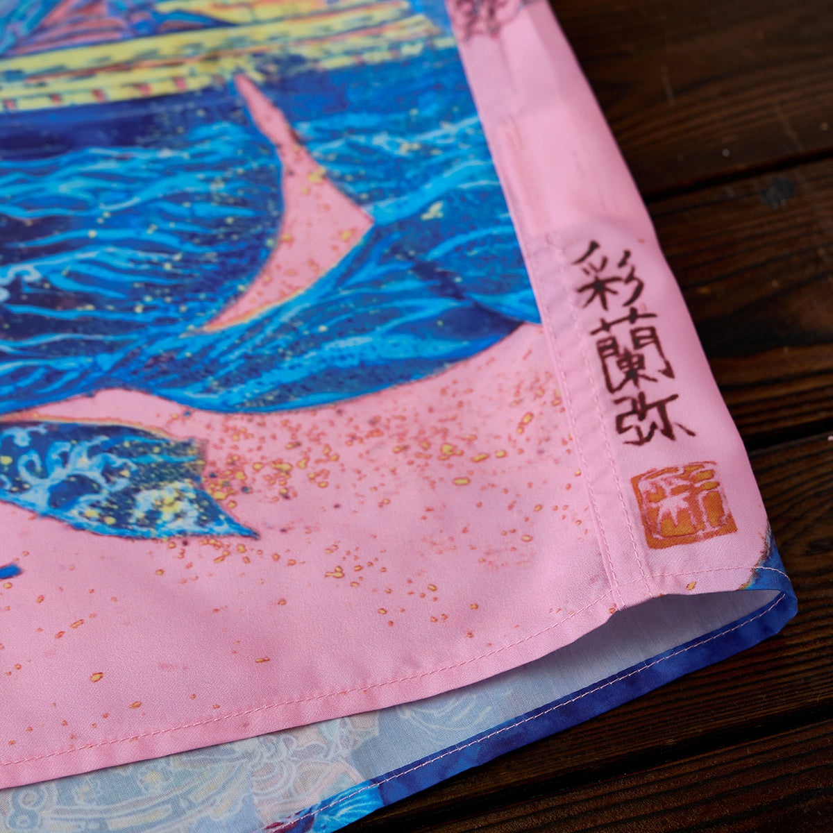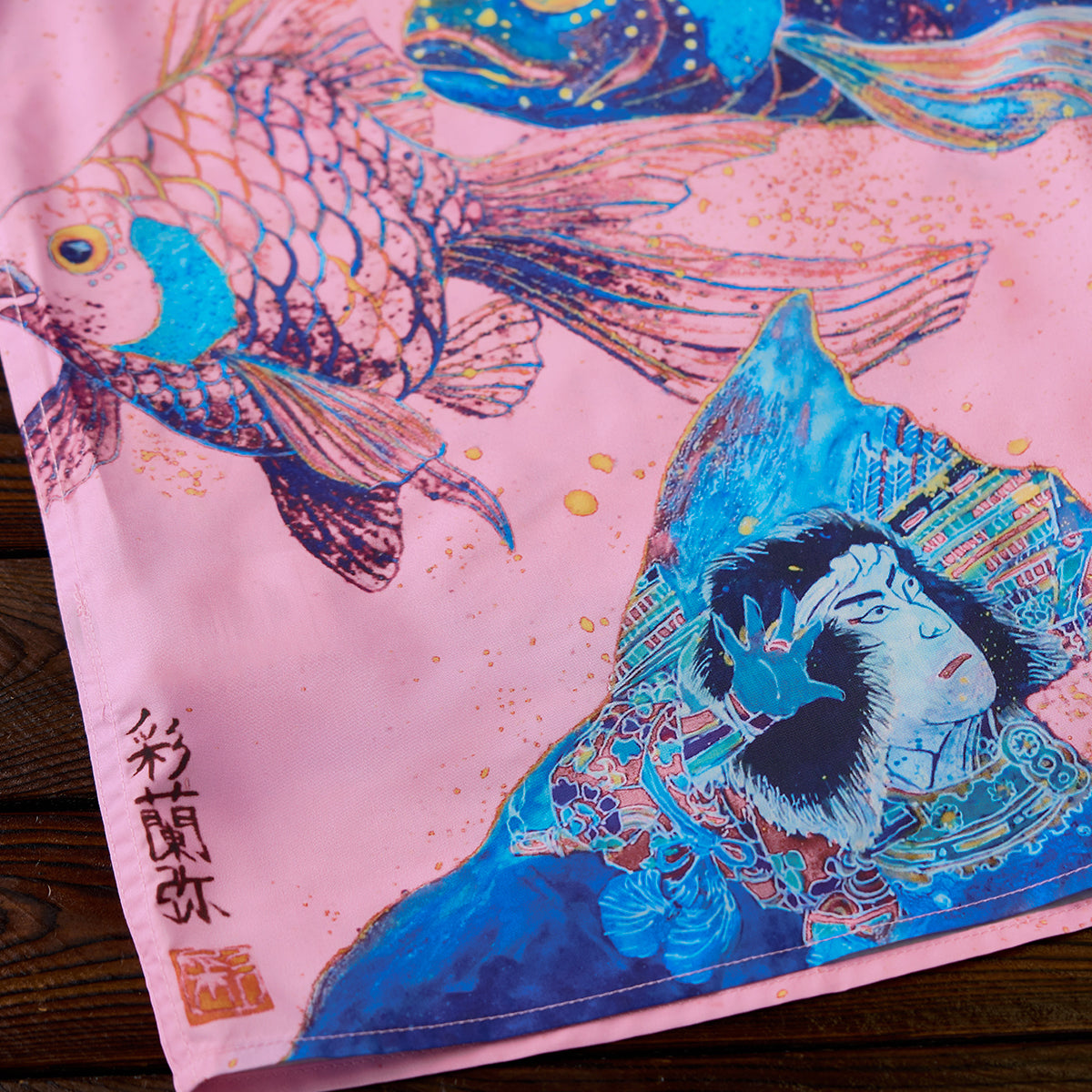 중앙의 거대한 물고기와 파도, 우키요에 요소들이 어우러져 움직임과 깊이감을 표현한 아트 디자인입니다. 디지털 프린트임에도 일본화의 암채 질감과 금분 효과를 재현해 입체적인 분위기를 살렸으며, 비늘의 색 변화로 생명의 빛을 표현했습니다.