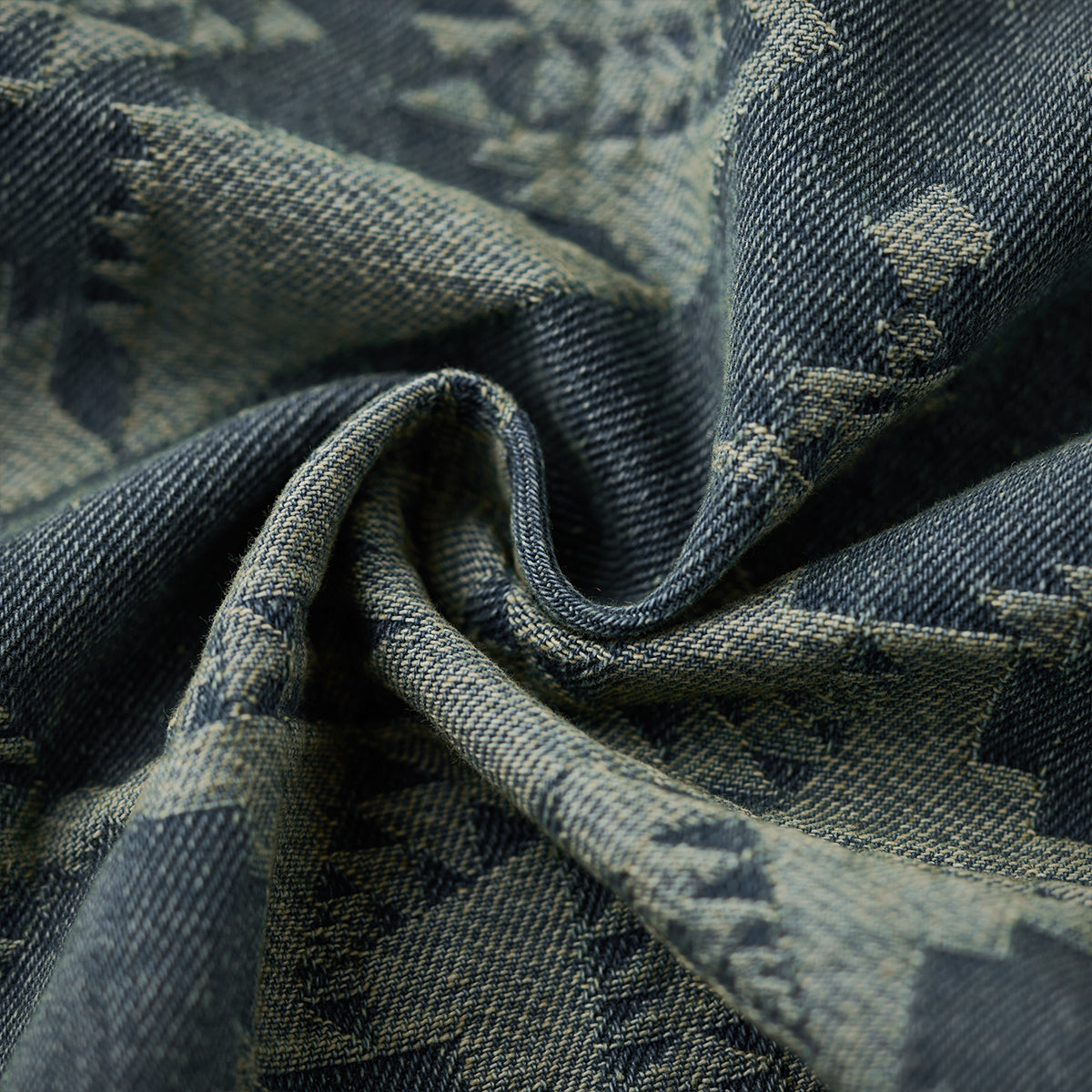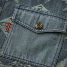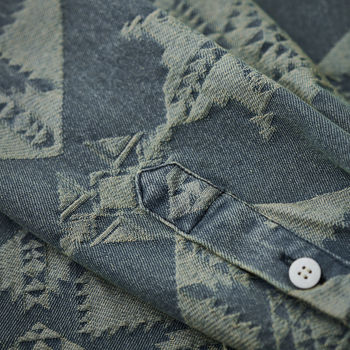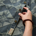 기하학 패턴이 돋보이는 데님 셔츠로, 왼쪽 플랩 포켓과 레드 태그, 앤티크 금속 버튼이 포인트이며, 차분한 블루 톤과 자카드 직조로 패턴이 뚜렷하게 드러납니다.
