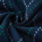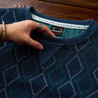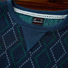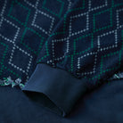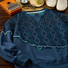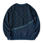 다이아 자카드 데님과 무지 배색, 프린지 디테일로 개성과 입체감을 더한 풀오버 스웨트.