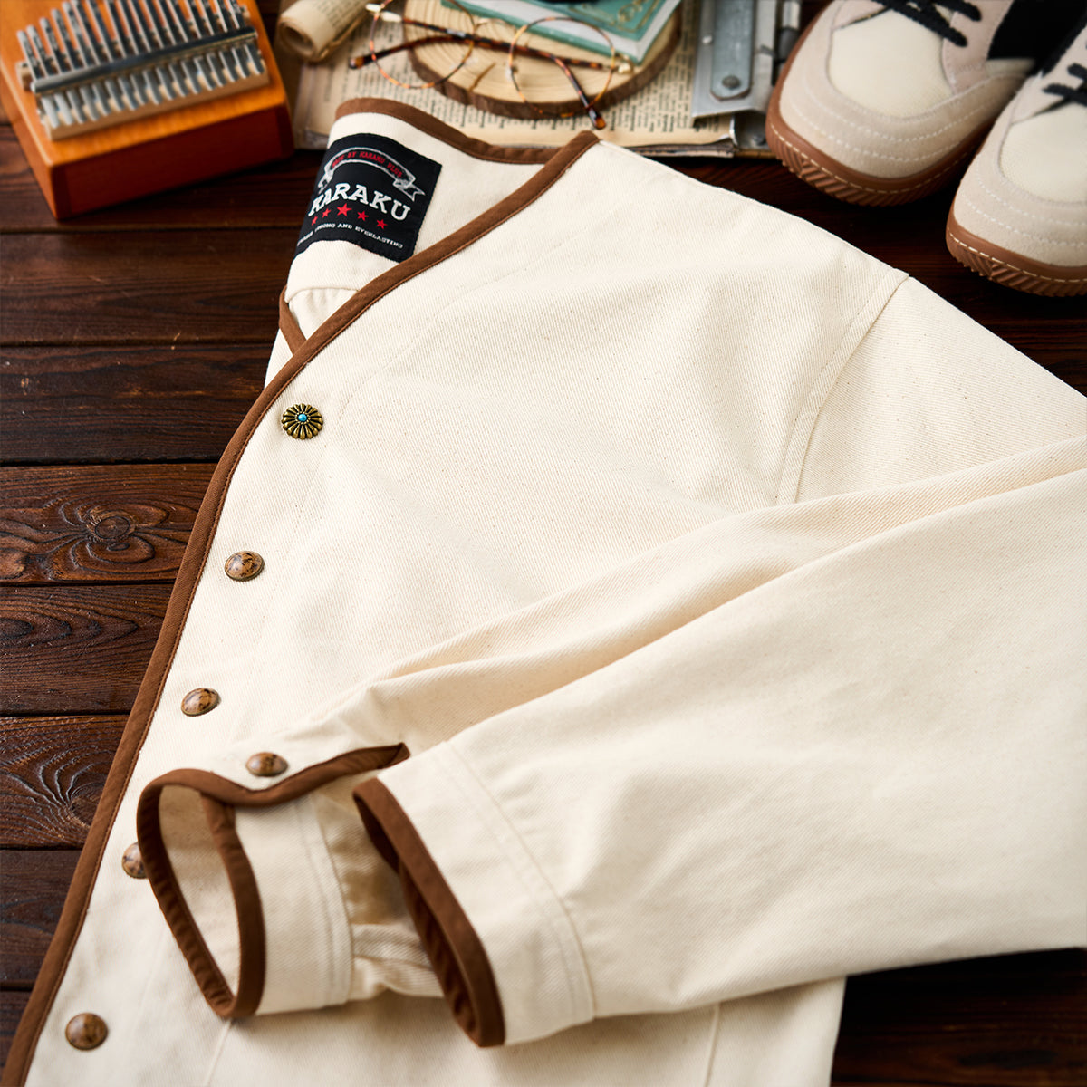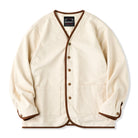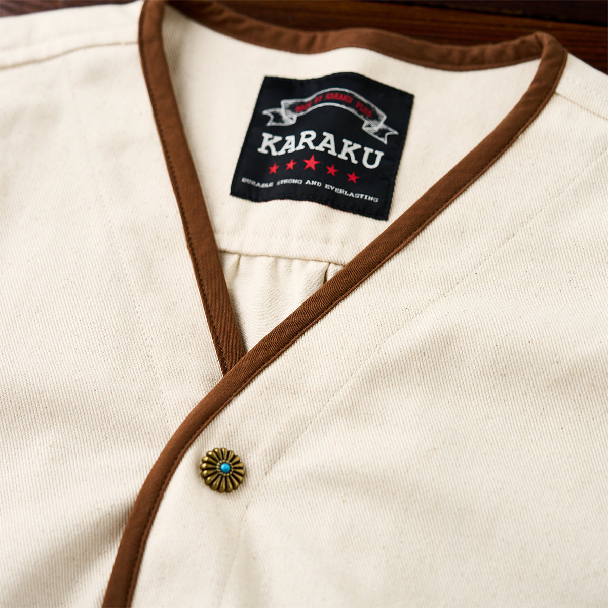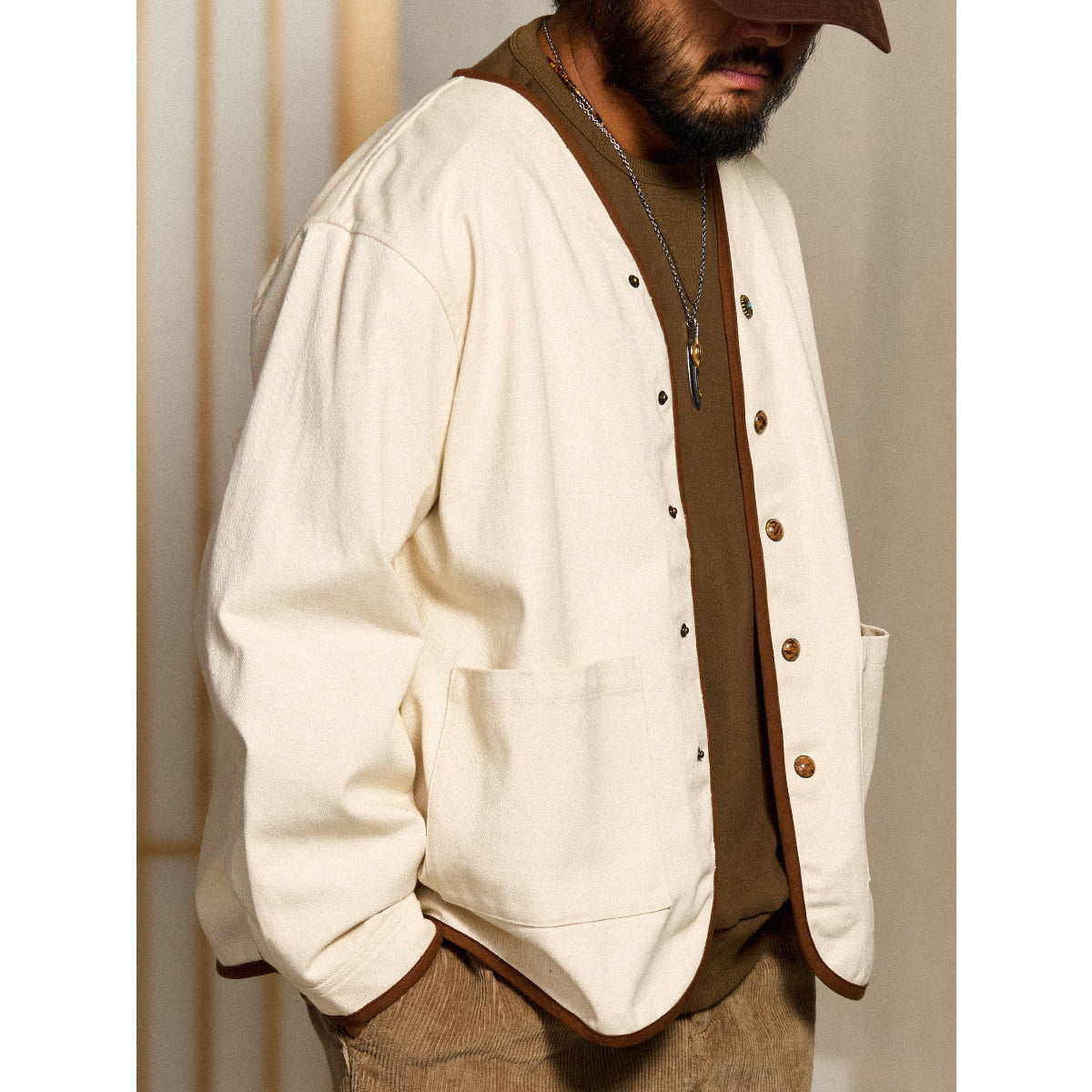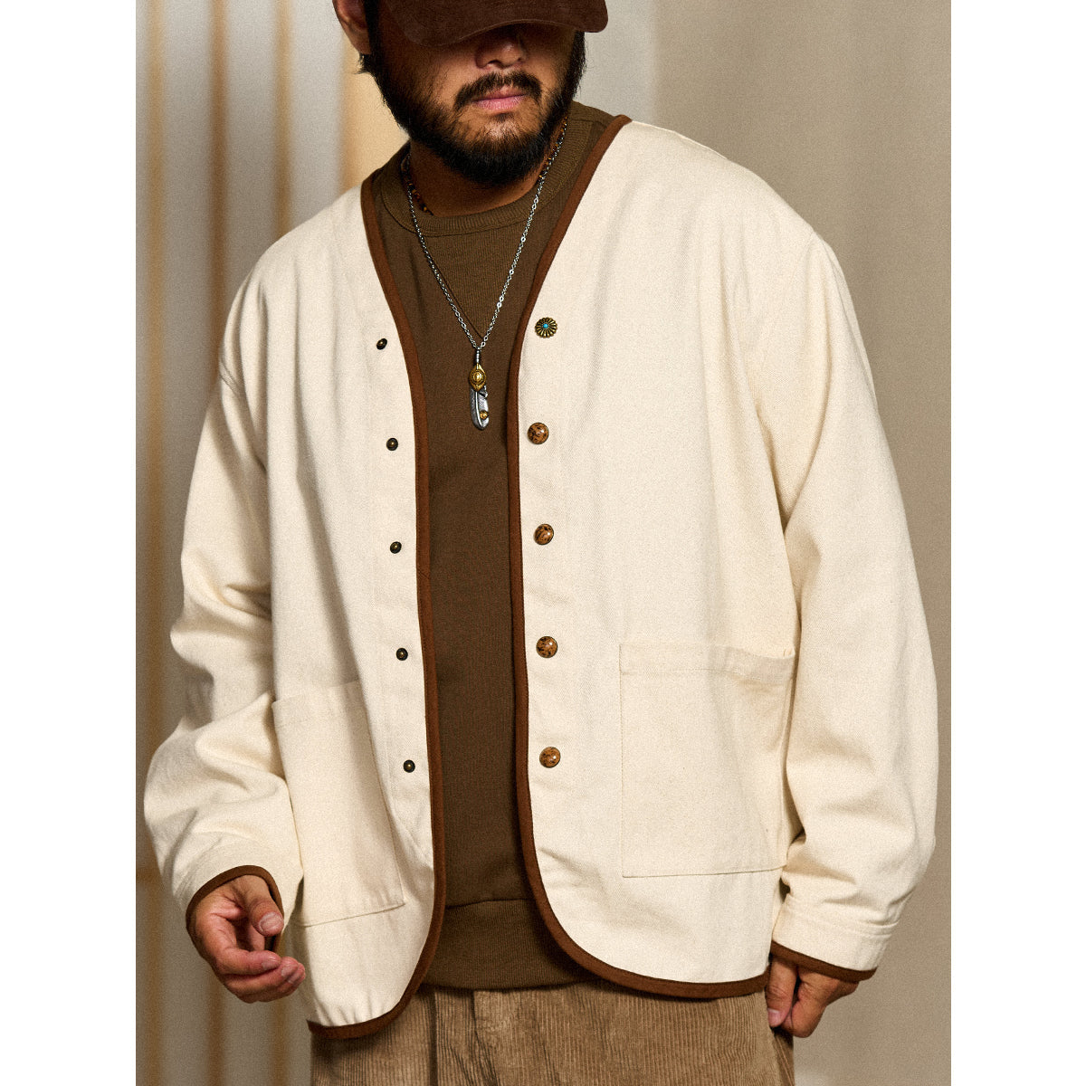 V넥 디자인으로 레이어드 연출이 가능하며, 커피 컬러 파이핑과 스톤 텍스처 버튼, 터키석 느낌의 플라워 버튼을 더해 디테일 완성도를 높인 디자인입니다.