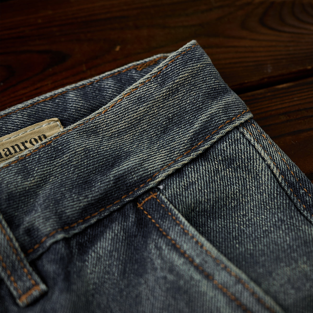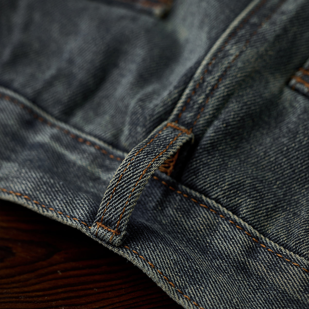 양쪽 카고 포켓과 플랩 뒷포켓, 허리 가죽 패치로 실용성과 고급스러움을 갖춘 워시드 데님 팬츠입니다. 캣 워싱 가공으로 자연스러운 빈티지 무드를 연출합니다.